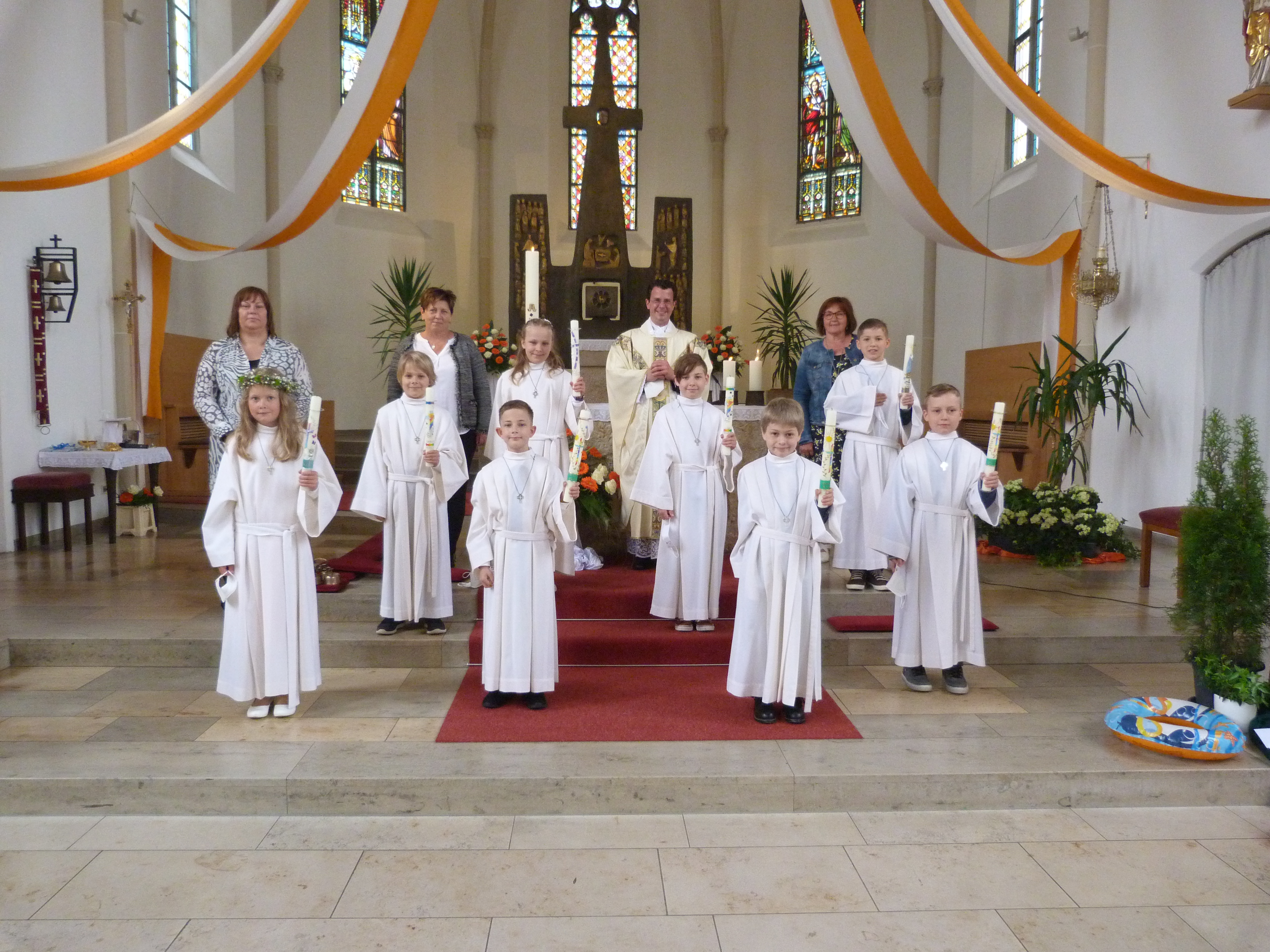 Anna, Felix, Isabella, Jeffrey, Julius, Phillip, Lorenz und Sebastian empfingen am Sonntag 16. Mai die Erstkommunion in Mantel.