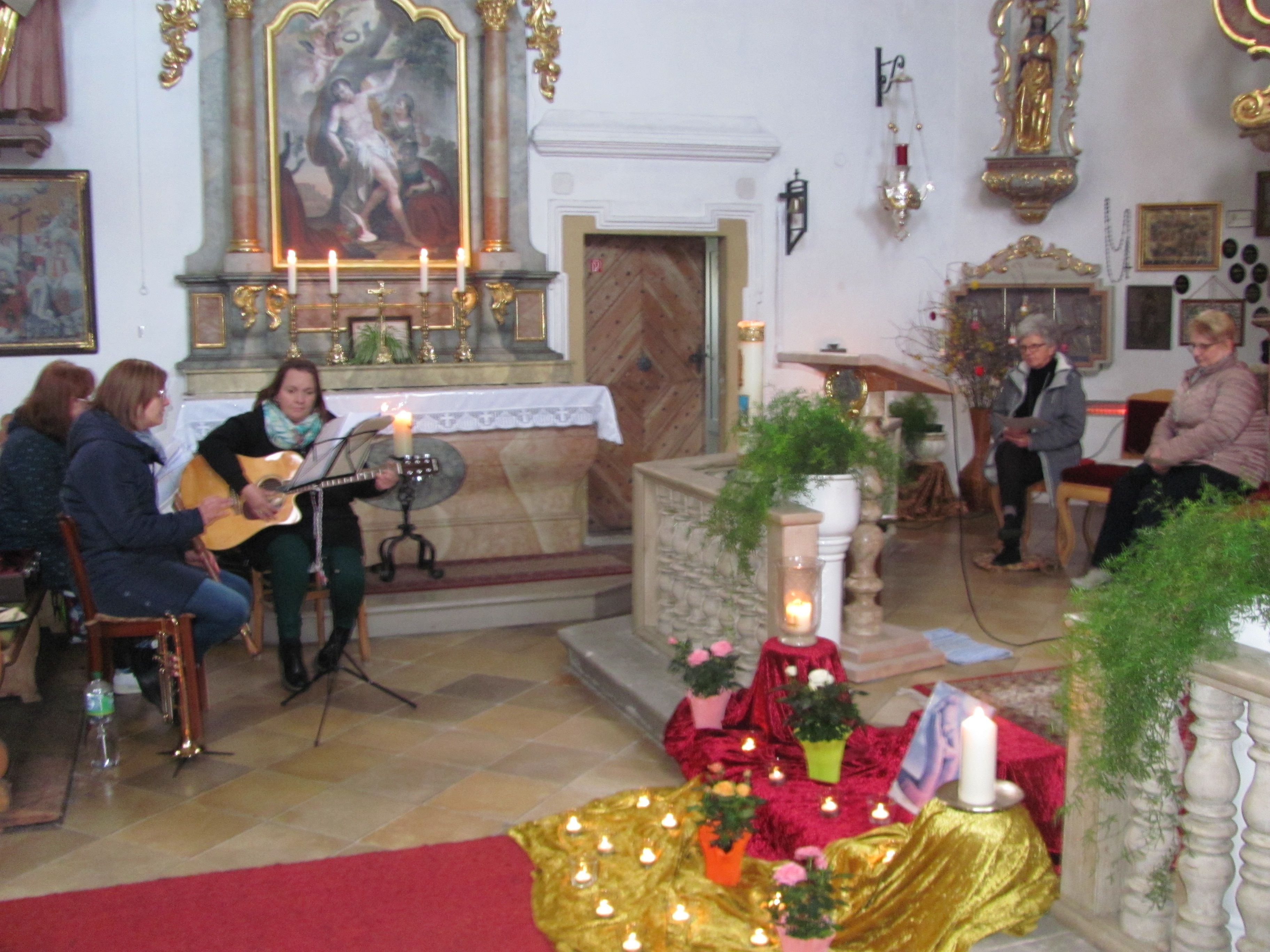 „In deine Hände“ war das Thema der letzten Atempause für die Seele in St. Moritz in Mantel. Die Texte lasen Rita Bayer und Theresia Gratzke. „Ich suche eine Hand, die mich hält und ermutigt“ war eine Bitte. Es gab die Erkenntnis, dass Gott nie schläft, sondern immer Jesus mit im Boot ist. Kleine Wunder können wir selbst vollbringen in dem wir anderen Zeit schenken, die Sorgen mittragen, andere mit Wort und Tat unterstützen. „Um leben zu lernen musst du sterben lernen. Du musst dich lösen von deiner Selbstsucht, von deiner Gier. Das gewöhnliche Leben ist der beste Lehrmeister. Das Leben schleift dich wie einen Diamanten. Es tut weh ,aber es ist der Weg zum inneren Frieden der im Schatten des Kreuzes verläuft, der österliche Weg zur Auferstehung und Freude. Es gab ein Dankgebet für das Leben, für die Liebe, für alle Mitmenschen und das Leben das Gott selbst ist. Das Schicksal wurde in Gottes Hand gelegt mit allen Schwächen, Zweifeln, Wut und Frustration. Die Familienmusik Schmid aus Heinrichskirchen umrahmte die Atempause mit Gitarrenmusik und Gesang. „Der Stein ist weg, das Grab ist leer“ oder auch „Möge die Straße uns zusammenführen“, berührte die Besucher. Für Gänsehaut sorgte am Schluss noch ein Trompetensolo mit dem Lied: „The Rose“. Die Gläubigen durften sich noch Karten mit Naturaufnahmen und sinnvollen Sprüchen mitnehmen. Vor dem Volksaltar stand ein Bild mit einem Kind dass sich in eine große Hand schmiegt, außerdem sorgten Kerzenlichter und Rosenstöcke für ein ansprechendes Bild.