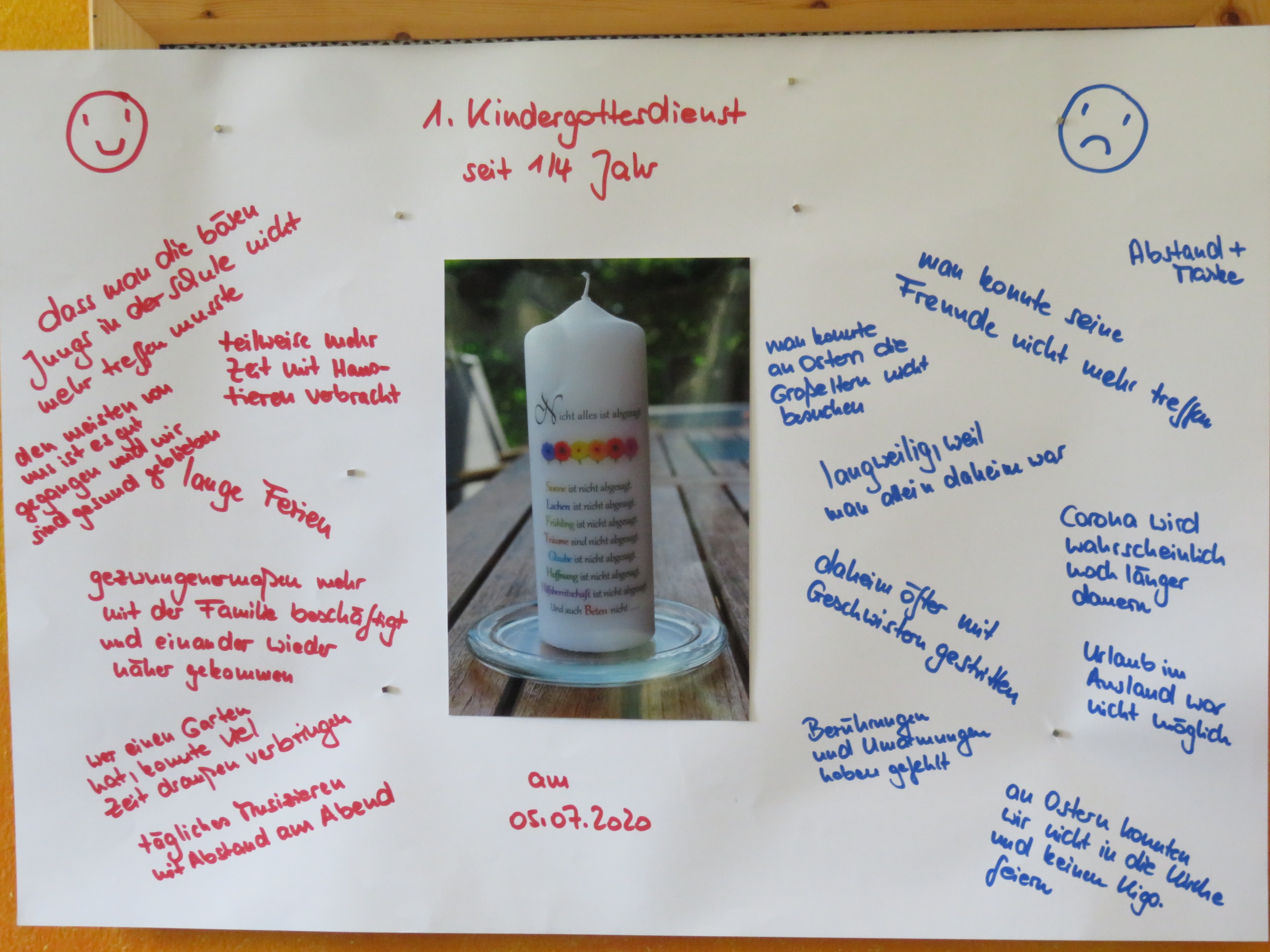 Hierzu wurden auf einem Plakat Gedanken gesammelt, wie die Kids diese Zeit erlebt haben, was ihnen gefehlt hat und was trotz allem für sie positiv war.