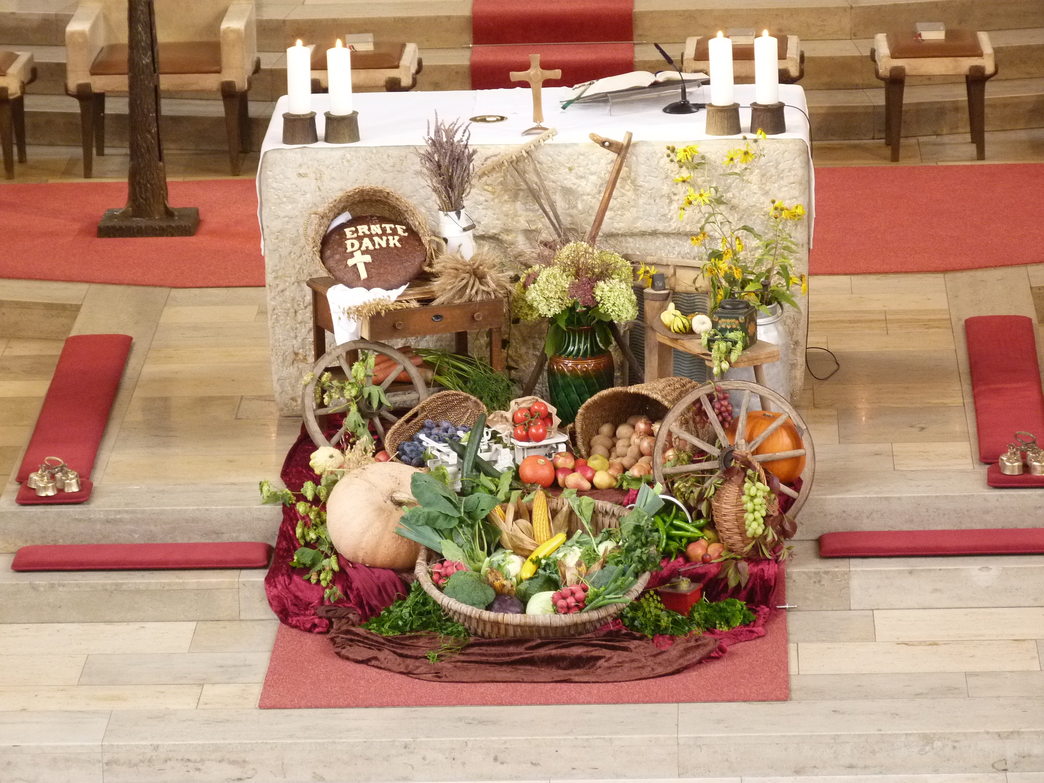 Nach dem Segen des Erntedankaltares bedankte sich der Pfarrvikar beim Pfarrgemeinderat für „das kunstvolle Arrangement aus Obst und Gemüse“.