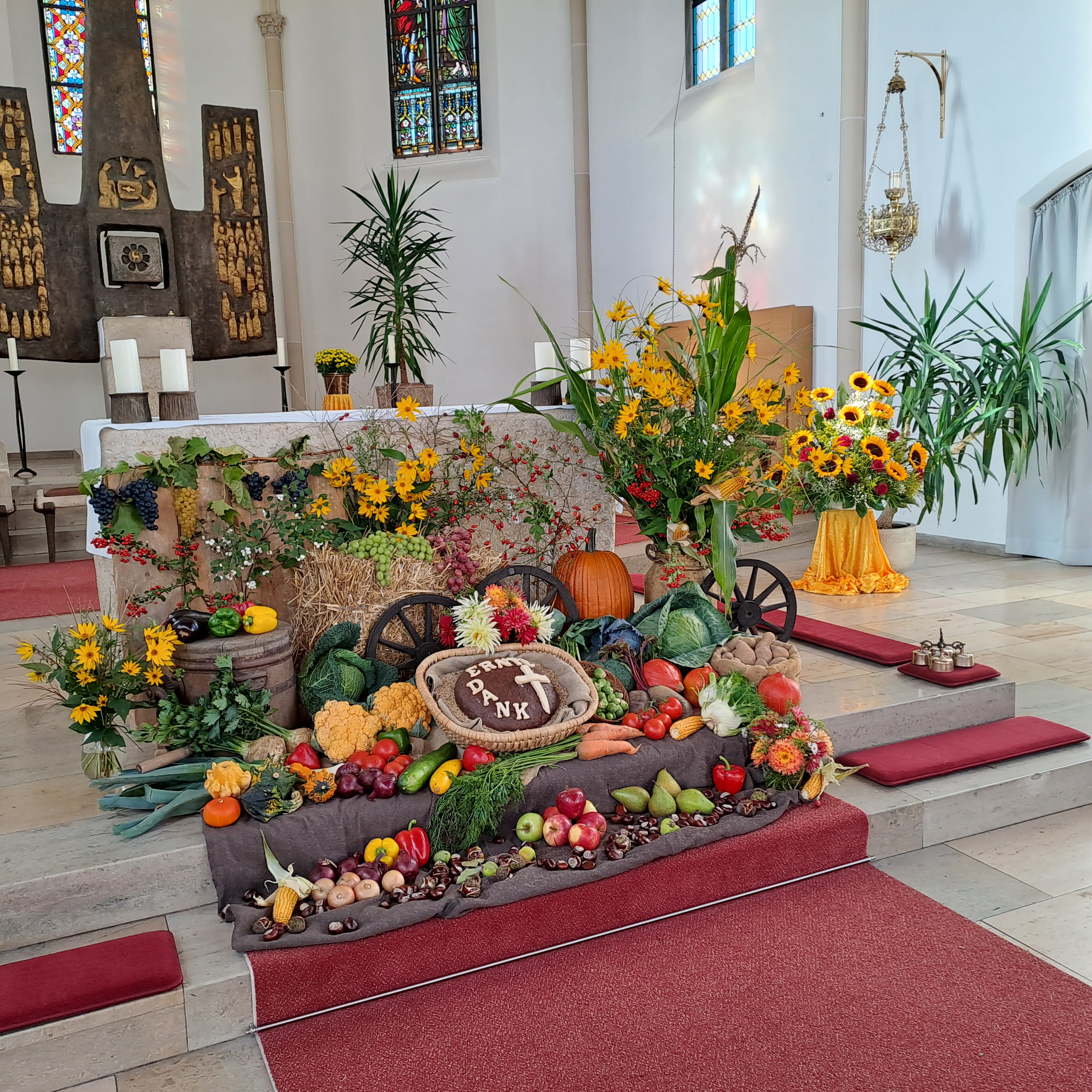 Ein farbenfrohes Bild mit Blumen, Früchten, Gemüse; so der Anblick des Erntedankaltares im Altarbereich. Die Kolpingsfamilie übernahm durch viele fleißige Hände heuer die Gestaltung. Während des Gottesdienstes am Sonntag, 1. Oktober formulierte es Pfarrvikar Robert Amandu so: „Erntedank, alles was wir im Leben brauchen, dass schenkt Gott uns immer wieder. Deshalb lasst uns Gott dafür danken.“ In seiner Predigt sprach er mit ein paar Gedanken über das Erntedankfest, denn die Hauptsache beim Erntedank sei es, danke an Gott zu sagen für die Frucht der Erde. Gott meine es unendlich gut mit uns. Wenn wer danke sagt, richten wir uns im Glauben an Gott, nicht nur für die Frucht der Erde sondern für alles, was wir im Leben bekommen. Erntedankfest sei für den Geistlichen nicht nur ein Fest des Dankens sondern auch eine Fest des Denkens, denn was wir der Mutter Erde antun, dass sollten wir uns bewusst machen.