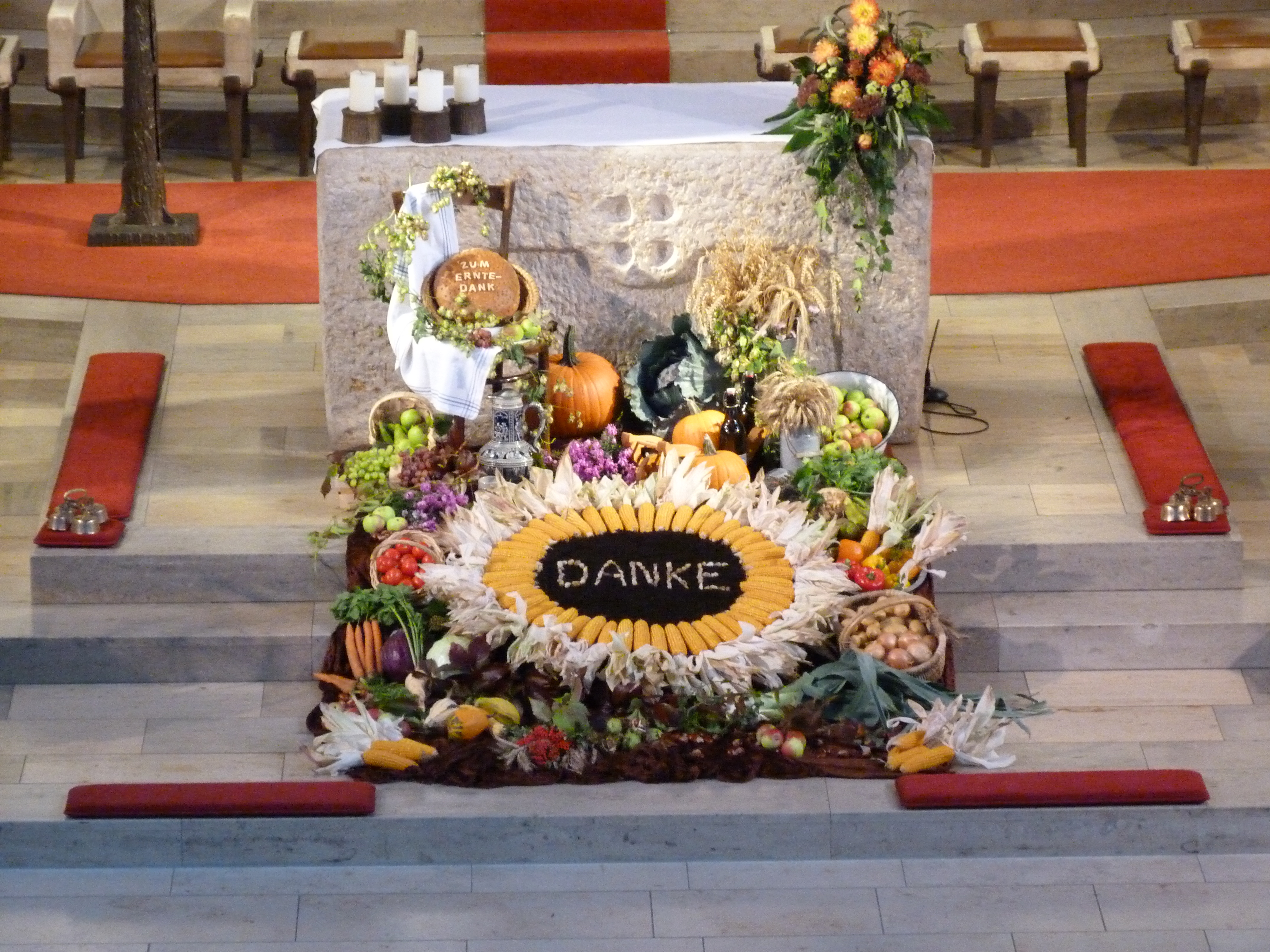Zu Erntedank wird jedes Jahr für die Gaben der Natur gedankt. Dort sind farbenfrohe Erntedankaltäre zu sehen. In der katholischen Pfarrkirche gestalteten Manuela Birner, Anja Graf und Renate Puckschamel vom Pfarrgemeinderat den Erntedankaltar. Ein farbenfrohes Arrangement als Mittelpunkt eine Sonnenblume aus Mais mit dem Wort „Danke“ besticht das Auge des Betrachters. Unterschiedliche Früchte und Beeren zeigen die Vielfalt der Ernte. Während des Gottesdienstes am Sonntag, 4. Oktober wurde der Erntedankaltar durch Pfarrvikar Dr. Bruno Kasongo gesegnet. „Eucharistie heißt Danke sagen. So sagen wir Gott danke für die Ernte und auch in der heutigen Zeit für Gesundheit“, so der Geistliche.