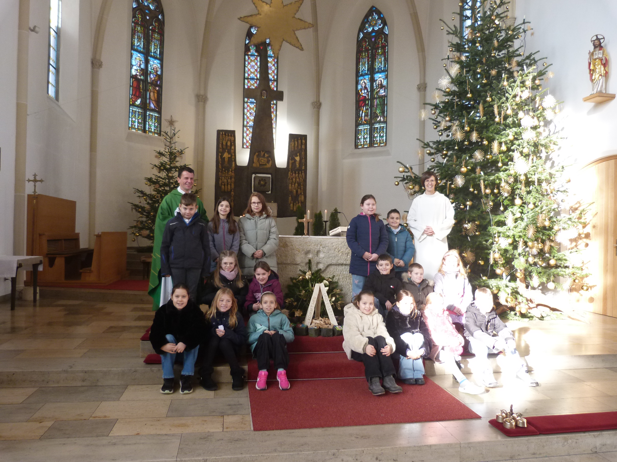Mit den Lied „Wir feiern heut ein Fest und kommen hier zusammen … herein, herein! Wir laden alle ein ..“ zog Pfarrer Thomas Kohlhepp mit den Ministranten und Gemeindereferentin Franziska Bösl am Sonntag, 19. Januar in die Pfarrkirche zum Gottesdienst ein. Das Gotteshaus gut gefüllt, so konnte die Pfarrgemeinde hören, dass es herausragende Momente gibt, Höhepunkt der Woche die Messfeier ist und die zukünftigen Kommunionkinder gekommen sind um sich der Pfarrgemeinde vorzustellen. Nach Kyrie, Lesung und Evangelium folgte die Vorstellung der Kinder. „Die Pfarrgemeinde freut sich, dass sich 17 Kinder dazu entschieden haben, im Frühjahr die Erstkommunion zu empfangen“, so Gemeindereferentin Franziska Bösl. Tags zuvor beschäftigten sich die Kinder mit dem Motto „Kommt her und esst“. „Wir haben von den Jüngern Jesu gehört. Die Erzählung handelt von einer Zeit, wo Jesus bereits gestorben war. Die Jünger waren wieder in ihrem Alltag als Fischer. Nachdem sie nicht gefangen hatten und ein fremder Mann ans Ufer trat und ihnen sagte, sie sollen die Netze auf der anderen Seite auswerfen, klappte es mit dem Fischfang. So lud der Fremde sie am Ufer zu einen vorbereiteten Fest ein. Es war Jesus. In der heutigen Zeit heißt dass, wir bezeichnen es als Einladung „Kommt zu mir! Feiern wir den Glauben! Bringt Freunde und Familie mit in die Kirche!, so die Gemeindereferentin weiter zu den Kindern. Jesus hatte zum kleinen Grillfest am Ufer eingeladen, gemütlich um ein Kohlefeuer. Symbolisch wurde es im Altarbereich als Feuerstelle nachgestellt, das Glaubensfeuer, jedes künftige Erstkommunionkinder legte bei der Vorstellung einen Stein mit seinem Bild um das Feuer, so dass es einen Kreis ergab. Die Kind traten nacheinander in den Altarbereich und sagte: Ich komme gern zu dir Jesus, und esse mit dir. Ich freue mich, wenn … den Satz durften sie selbst beenden. Dort hörte man, wenn ich dich besser kennenlernen darf; wenn ich dir begegnen darf; wenn ich dich sehen kann; wenn ich dir Fragen stellen kann oder wenn ich dir begegne, würde ich dich fragen wie es im Himmel aussieht. Beim Mottolied waren die 17 Kinder stimmgewaltig dabei. Die Verantwortlichen des Kommunionteams unterstützten sie dabei. Nach den Segen und den gemeinsamen Gruppenfoto war es geschafft!