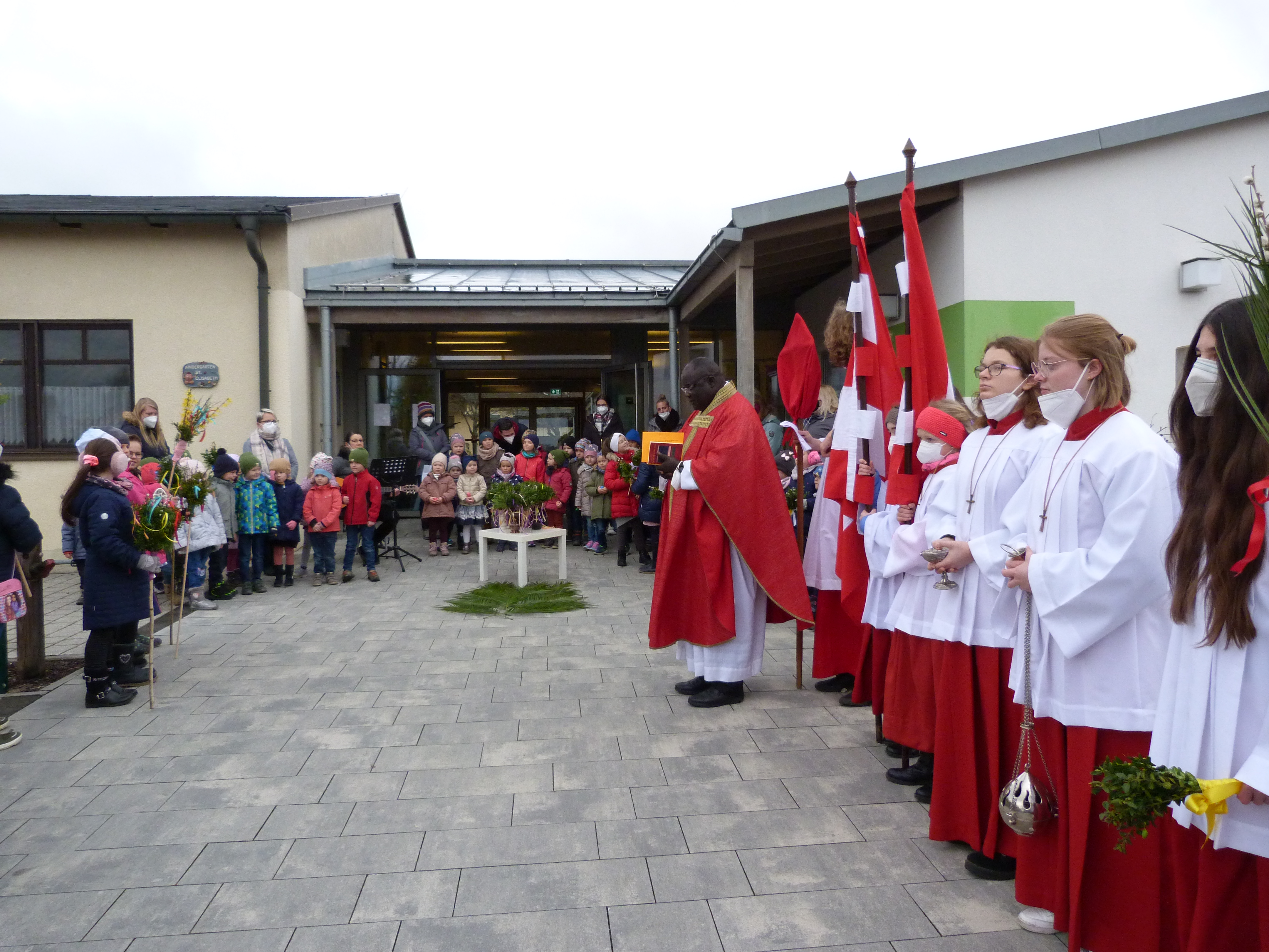 Die Palmbuschen werden für die Palmweihe gebunden. Die Kommunionmütter treffen sich und binden bunte Palmbuschen. Die Gläubigen kommen am Palmsonntag morgen am Kinderhaus in Mantel zusammen. Pfarrvikar Robert Amanda, umringt von Kindern aus dem Kinderhaus mit ihren Erzieherinnen und die zukünftigen Kommunionkindern, segnete die Palmzweige. Die Kinderhauskinder singen „Hosianna Gloria, Herr wir grüßen dich“, die anwesenden Gläubigen beten und singen mit Pfarrvikar Robert „Lobe den Herren“. Danach die Prozession mit Kreuz und Ministranten, Pfarrer, Kindern und Gläubigen zur Pfarrkirche. Einfach Normalität am Palmsonntag nach den zwei Jahren in der Pandemie. „So wie Jesus am Palmsonntag in Jerusalem einzog, machen wir es in die Pfarrkirche, symbolisch wie damals.“, so Pfarrvikar Robert während des Gottesdienstes.