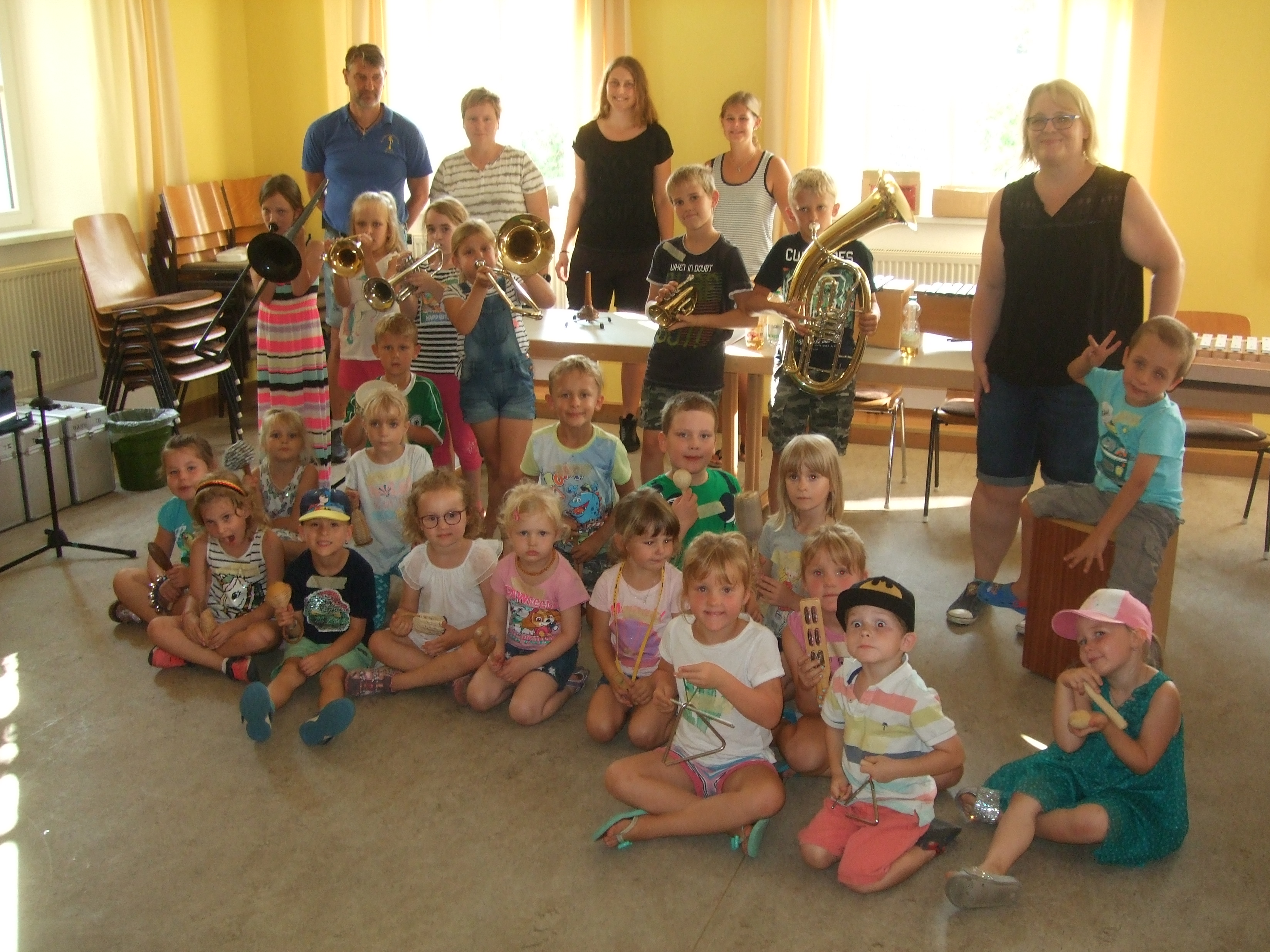 Unter dem Motto“ Mach doch mal Musik“ waren Kinder ab vier Jahren ins evangelische Gemeindehaus eingeladen. Die Helfer Susanne Hausmann, Annette Punzmann, Rosi Uschold, Carolin Schieder, Wolfgang Janner, Kristina Rottenberg und Sonja Piehler hatten für die Kleinen einen unterhaltsamen Feriennachmittag vorbereitet. Posaunenchor und Kinderchor faszinierten die Klinder mit einem zweiständigen Programm. 22 Kinder waren teils in Begleitung gekommen und konnten in verschiedenen Gruppen Instrumente kennen lernen, spielen, singen und basteln. Die Betreuer erklärten die man Trompeten, Tenorhorn und Zugposaune die verschiedensten Töne entlocken kann. Mit Xylophonen, Glockenspielen, Tamburin, Triangel und ähnlichem wurde das Lied: „Bauer Fritz hat ne Farm musikalisch untermalt. Bei Rosi Uschold und Carolin Schieder durften die Kinder Tontiere bemalen sie sie dann stolz mit heim ahmen. Sonja Piehler und Kristina Rottenberg sangen mit den Kids und spielten Unterhaltungsspiele. Zum Abschluss des Nachmittages wurde nochmal lautstark musiziert und die Kinder freuten sich über Süßigkeiten. Diese wurden vom Männergesangverein gespendet, sie waren beim Bürgerfest übriggeblieben.
