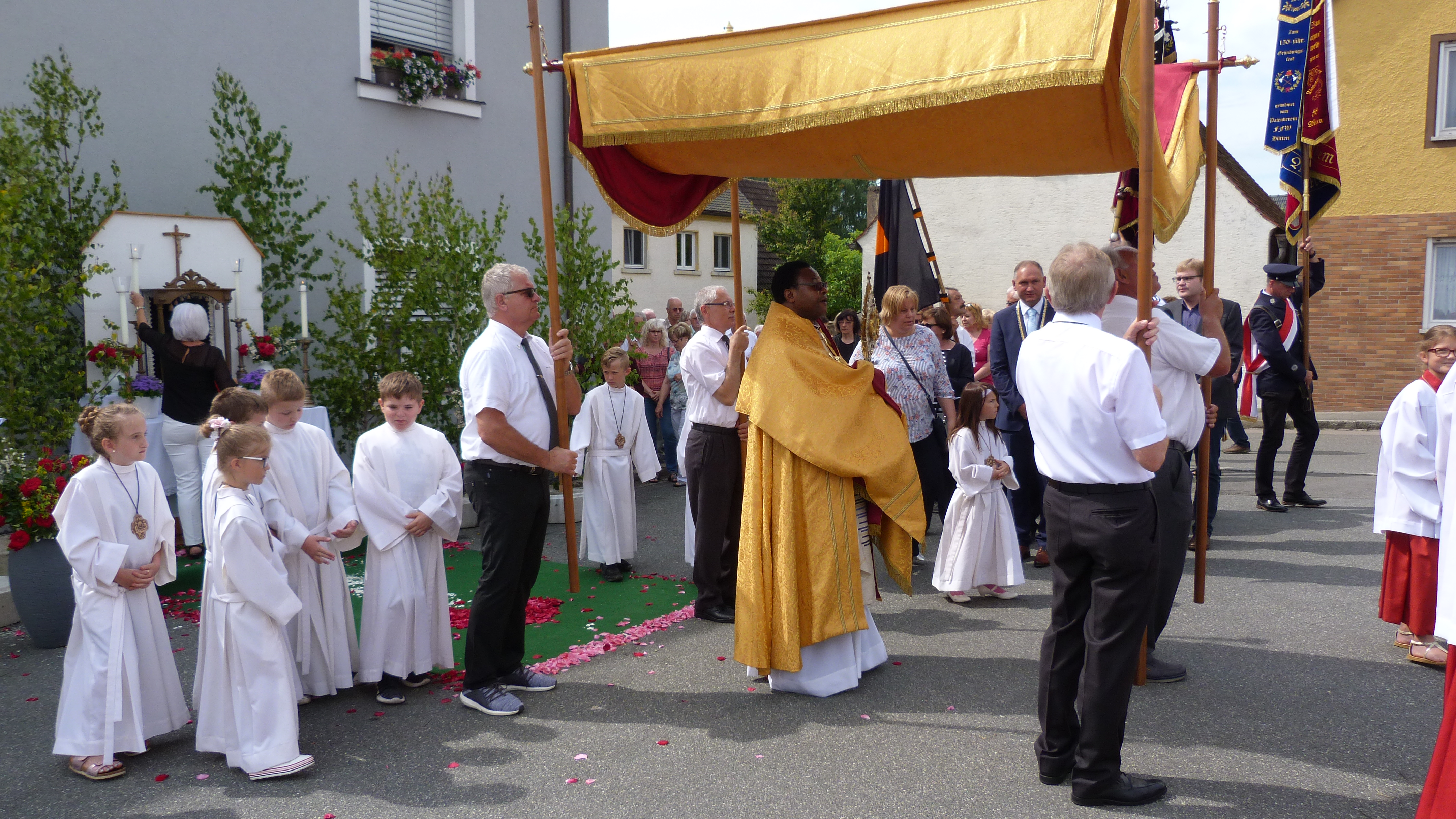 Der Morgen des Fronleichnams zeigte sich der Himmel für die Vorbereitung der Fronleichnamsprozession mit den Altären nicht von seiner besten Seite. Gegen 5 Uhr regnete es, die Verantwortlichen beschlossen, dass die Altäre trotz des Wetters geschmückt werden. Die vielen Helfer, die an diesem Morgen im Einsatz waren, schmückten die Altäre in der Etzenrichter Str. am Wegkreuz und am Rathaus mit Blumen und Blumenteppichen. Je später der Morgen, umso mehr klarte es auf und die Sonne kam zum Vorschein. So konnte in Mantel, wie auch in vielen anderen Regionen die Katholiken durch den Ort ziehen, um den Fronleichnamstag zu begehen. „Fronleichnam bedeutet den katholischen Glauben nach außen zu tragen“, so Pfarrvikar Dr. Bruno Kasongo Ndala bei der Predigt während des Gottesdienstes in St. Moritz. Die Gläubigen zogen singend und betend hinter dem Kreuz, mit Pfarrer Dr. Bruno unter dem Himmel, Ministranten, Kommunionkinder und Vereinsabordnungen mit Fahnen den Prozessionsweg. Der Weg führte die Gläubigen zum Schluss in die Pfarrkirche. Mit dem Segen und dem Schlusslied „die Bayernhymne: Gott mit dir du Land der Bayern“ endete der Gottesdienst zu Fronleichnam.
