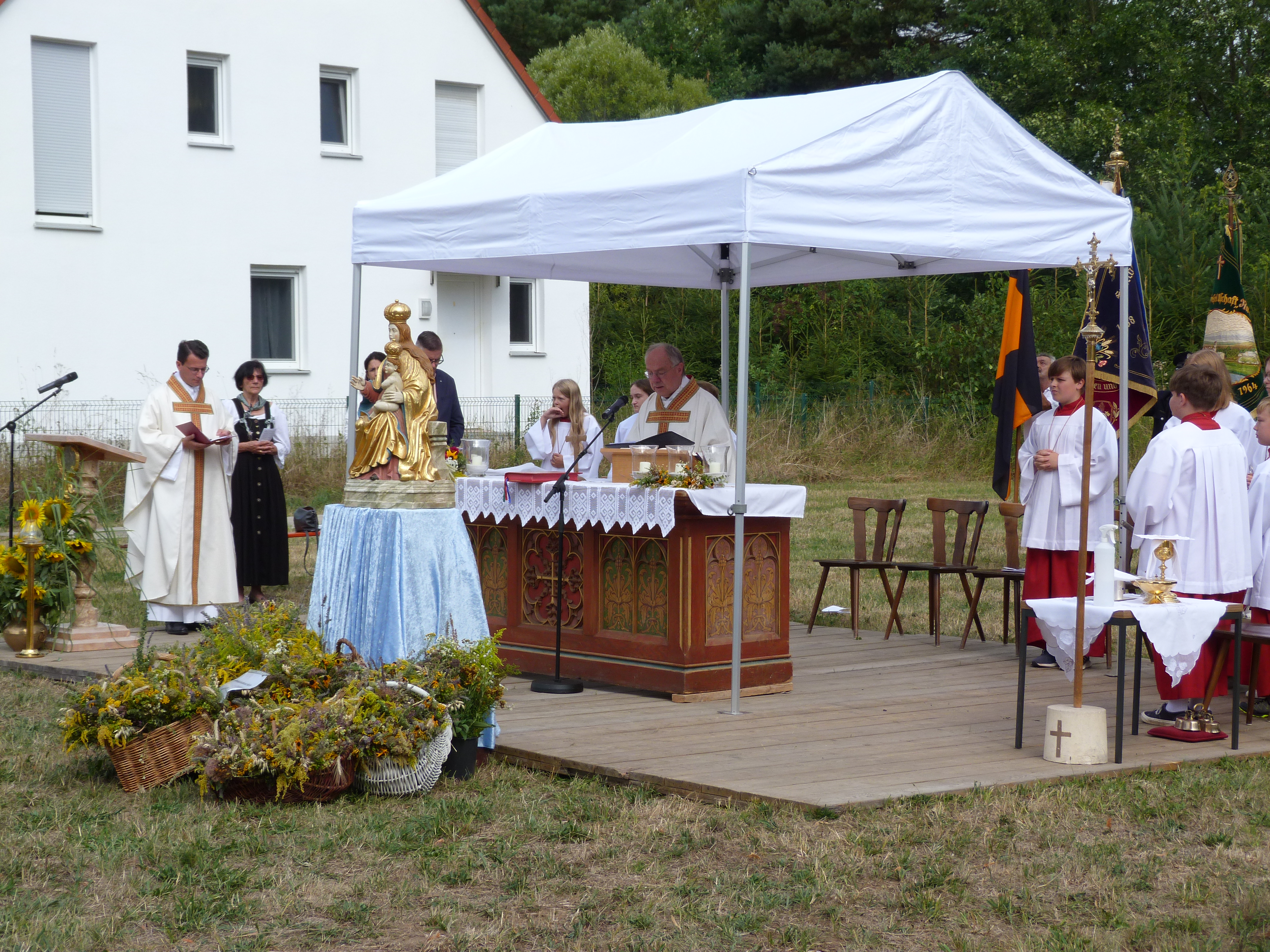 Das Patrozinium Steinfels lockte ca. 500 Gläubige zur Festwiese neben der Schlosskapelle in Steinfels. Da sich im Eichhain der Prozessionsspinner breit gemacht hat und morsche Äste eine Gefahr darstellen fand des Patrozinium Steinfels wie im vergangenen Jahr auf der Festwiese mit Bestuhlung statt. „Ein wunderbarer, sonnlicher Tag, das Richtige für einen Festgottesdienst zum Hochfest Maria Himmelfahrt“, so Ortsgeistlicher Thomas Kohlhepp in seiner Begrüßung. „Viele Gläubige aus der Region, Vereine mit Fahnen und Banner und auch einige Verantwortliche aus der Politik ein herzliches Willkommen“, so Kohlhepp. Fleißige Hände aus den Reihen des Pfarrgemeinderates, der Kirchenverwaltung und der Mesner hatten die Wiese zum Gottesdienstplatz verwandelt. Die Ministranten und Fahnenabordnungen zogen vor Pfarrer Kohlhepp und dem Hauptzelebranten Msgr. BGR Stadtpfarrer Ludwig Gradl aus Amberg zum Altarbereich. Dort stand als Blickfang die Steinfelser Madonna aus der Schlosskapelle. Zu ihren Füßen waren gebundene Kräuter, die von Helfern in mühevoller Arbeit gesammelt und gebunden wurden. Die Grafenwöhrer Blasmusikkapelle umrahmte die Messe musikalisch. Stadtpfarrer Gradl stellte fest, „ich habe ohne Navi hierhergefunden, ich habe es gefühlt, wo Steinfels ist“. In der Predigt ging Gradl auf einen kürzlich gelesenen Artikel ein, das königliche Spiel, wie er es nannte Schach. Schach ist ein strategisches Brettspiel mit Königen als Gegner und einigen Schützen. Laut Aussage Gradls kann man das auch auf das Leben geziehen, auf das Leben im Glauben. Im Spiel des Lebens ginge es um Christkönig, ihm zu dienen, der gleichzusetzten mit dem König ist, alles andere ist im Hintergrund. Teufel und Lügner die Gegner im Spiel. Wichtige Figur sei auch die Dame, Christi Mutter von der Gnade Gottes erfüllt. Maria im Leben haben ist lebensentscheidend, die Strategin. Ohne Maria läuft nichts. Zu einigen anderen Figuren gibt es dann noch den Bauern im Schachspiel. Er kann wenig, aber kommt er an die Grenze, kann er zur Dame werden, dieses Ziel erreichen wir, in der Begleitung Mariens, so der Geistliche weiter. Denn Maria ist Vorbild und Fürsprecherin um uns die Gaben des ewigen Heils erwirken zu lassen. Am Ende des Festgottesdienstes segnete Stadtpfarrer Gradl die Kräutersträußchen. Ein Frühschoppen mit Blasmusik lud im Anschluss zum Verweilen ein.