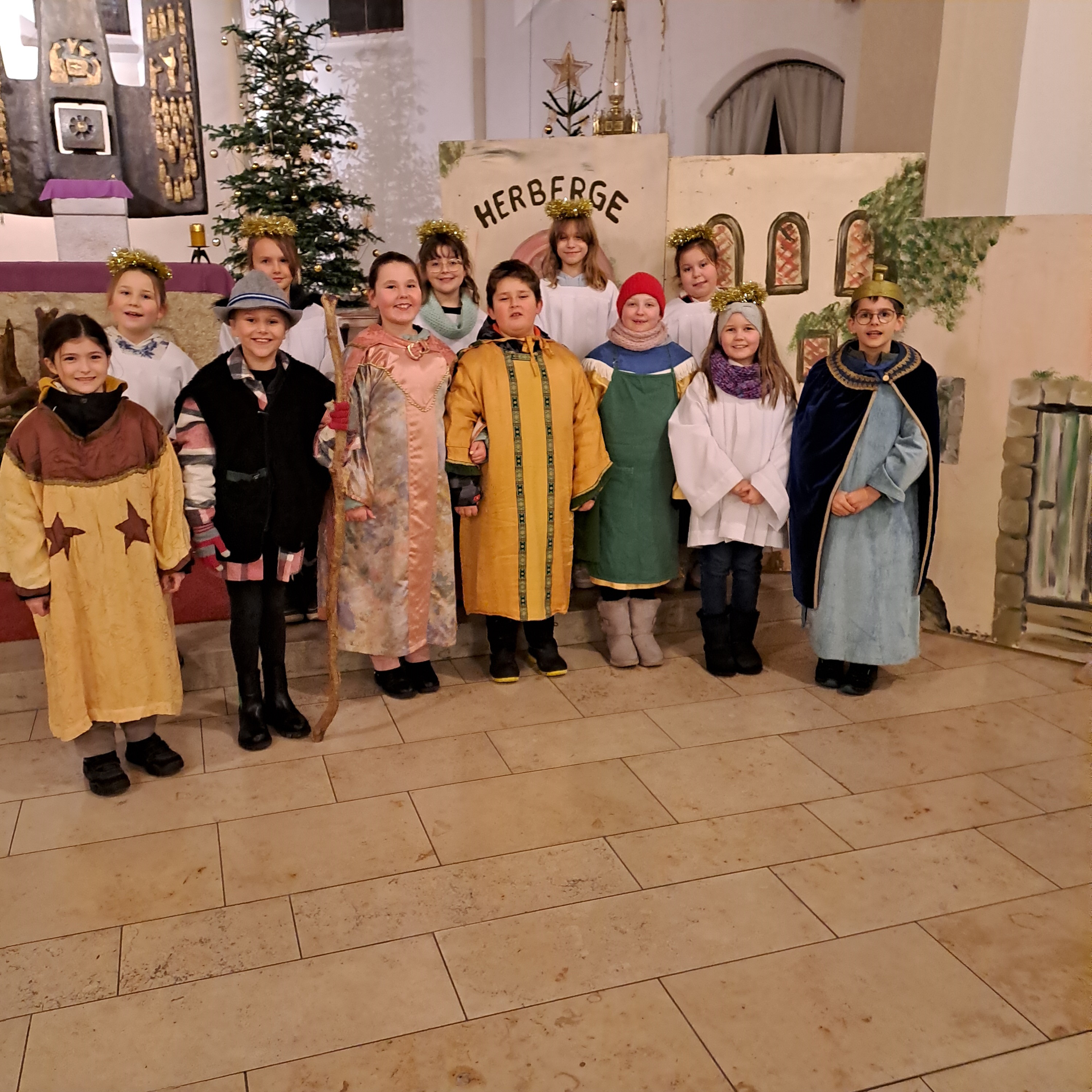 „Weihnachten ist ein Fest der Liebe und des Friedens“, so der Geistliche. Pfarrvikar Robert stellte weiter fest: „Heute morgen habt ihr das letzte Türchen im Adventskalender geöffnet, ihr habt lange darauf gewartet, sich vorbereitet, und nach vielen Erledigungen ist es jetzt soweit, wir feiern mit vielen Kirchen Weihnachten.“ Im Krippenspiel konnten die Gottesdienstbesucher, darunter viele Kinder hören und sehen, wie sich sechs Sterne unterhielten. Man konnte im Gespräch hören, dass es so dunkel und kalt auf dieser Welt ist, und die Sterne machen ihr Licht an, denn es muss die Menschen erreichen. Bei der nachgespielten Herbergssuche begleiten die Sterne Maria und Josef auf ihrer Reise nach Bethlehem. Die Sterne mit ihrem warmen Licht bringen dem Wirt dazu Maria und Josef im Stall eine Herberge zu geben, den Hirten, einem Soldaten und einem Bettler aufmerksam über das Geschehene zu machen und dem Kind zu huldigen. Die Sterne stellten am Ende fest, dass den Menschen ein Licht aufgegangen sei, für sie wird die Dunkelheit hell. Allen Menschen soll es heute so gehen! Die Sterne trugen beim Wortgottesdienst auch die Fürbitten vor mit der Bitte um Frieden, dem Beistand für alle Menschen, ebenso die Bitte um Licht des Lebens, um Hoffnung und Zuversicht. Pfarrvikar Robert Amandu bedankte sich am Ende bei all denen, die mitgeholfen haben um den Gottesdienst so feierlich zu gestalten, vor allem bei den Akteuren des Krippenspiels, Christina König und Karin Hildebrand für das Einstudieren und dem Organisten Simon Hoffmann für die musikalische Begleitung.