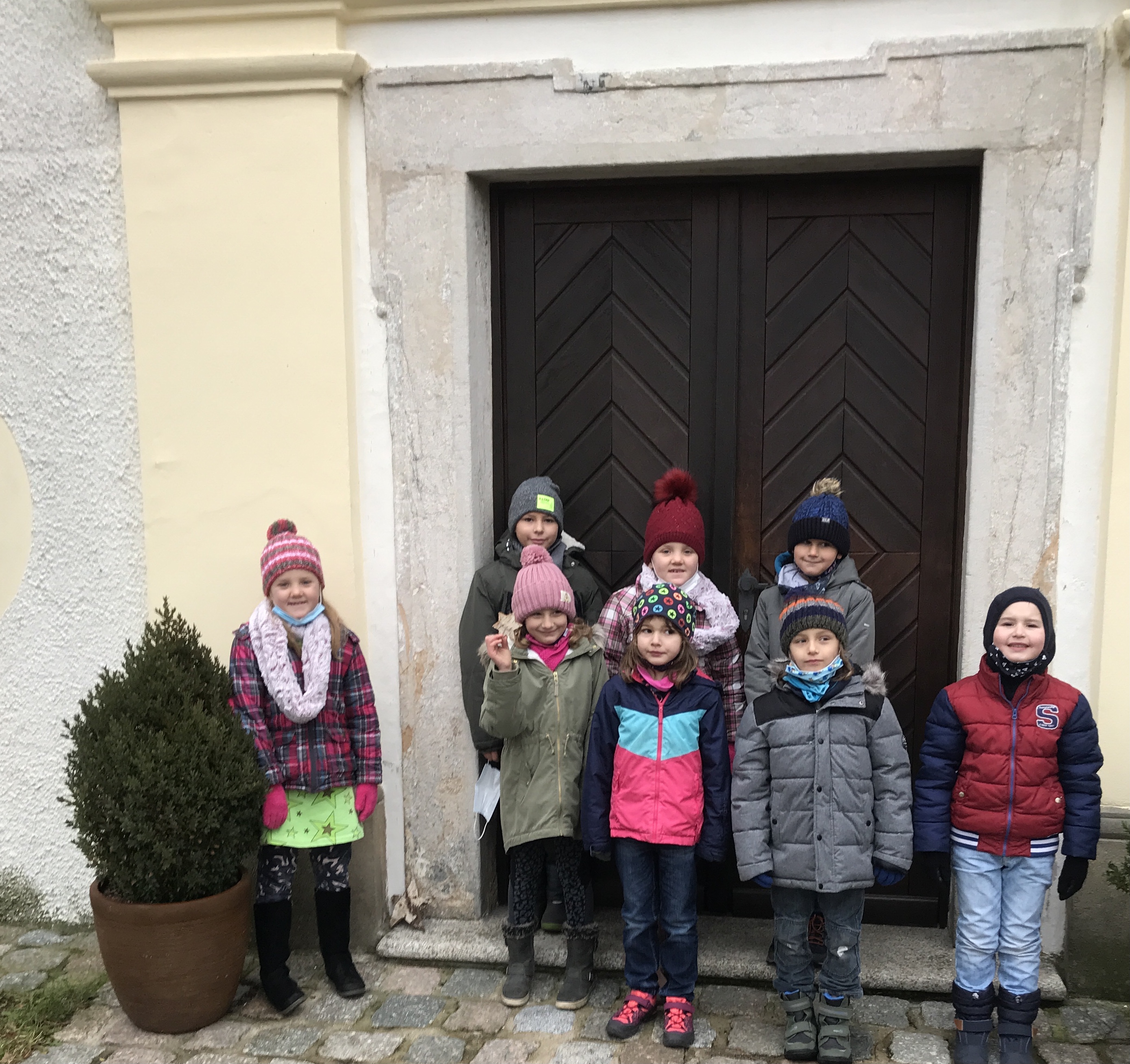 Sonntag etwas bunter und weihnachtlicher. Während die Erwachsenen in der Kirche Gottesdienst feiern, marschieren die Kinder mit ihren Helfern los- jede Woche zu einem anderen Ort. Das Ziel am 1. Advent war die Moritzkirche. Vor der Kirche wurde gesungen und gebetet, die Kirche angeschaut und dann 3 Sterne aus Rindenholz von den Kindern an drei Stellen abgelegt.