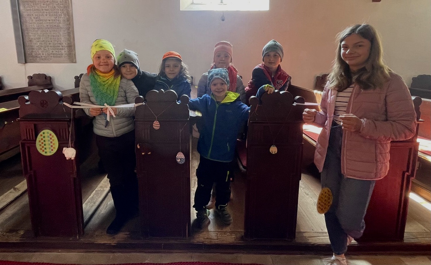 Das bunt geschmückte Gotteshaus zeigt einmal mehr, wie wichtig die Jüngsten der Gemeinde sind und wie sehr wir Erwachsenen auch deren Unbeschwertheit brauchen. Dies lobte auch Hr. Pfr. Ruhs während des Ostergottesdienstes und lud die Gemeinde ein die Kunstwerke jederzeit näher zu betrachten.