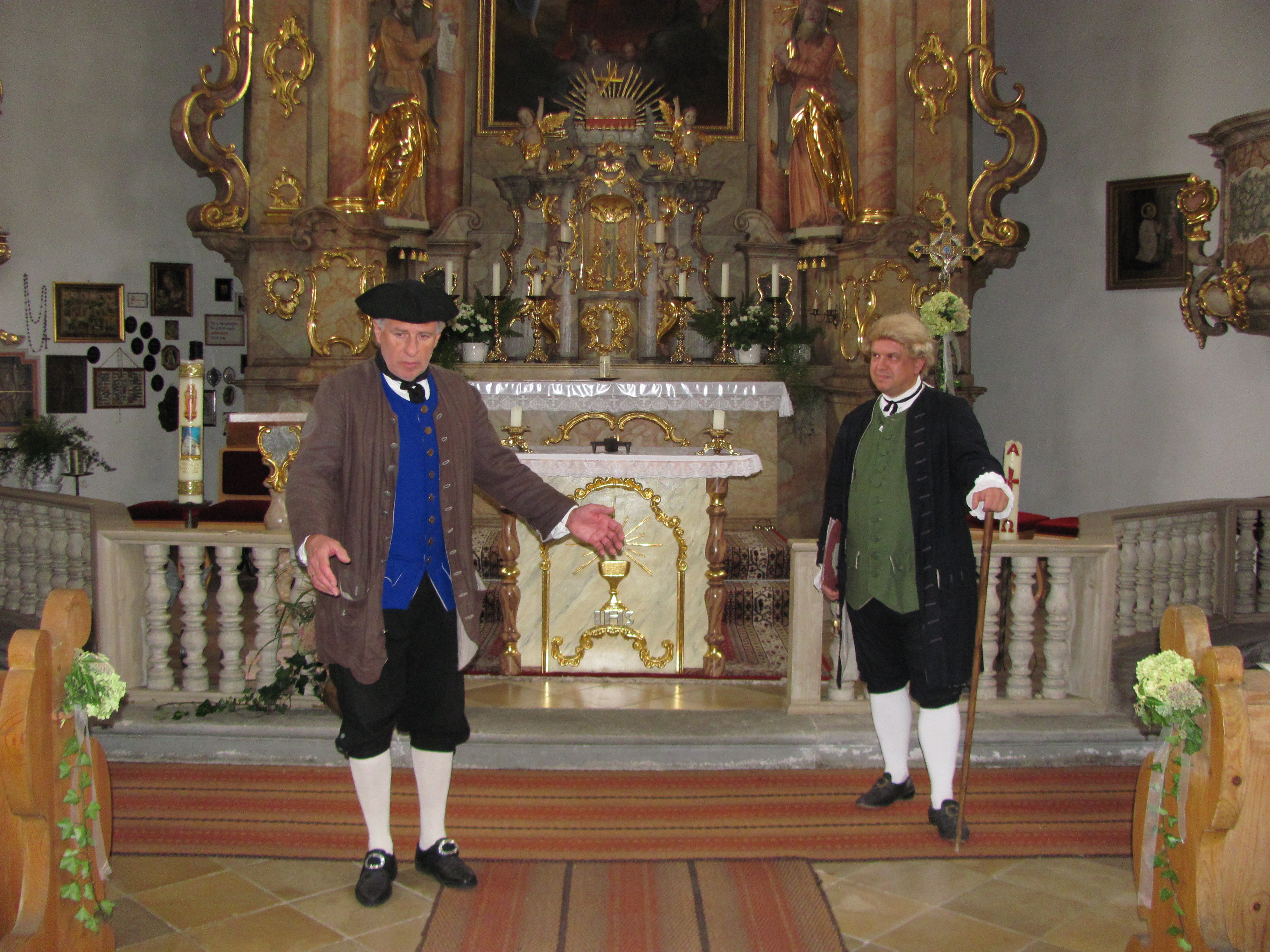 Am „Tag des offenen Denkmals“ erfreute sich die Kirchenführung in St. Moritz durch Bernhard Weigl vom Förderverein großer Beliebtheit. Weigl trat als Forstmeister Konrad Grötsch auf der in den 1730-40iger Jahren Forstmeister war und Rechnungen für die Kirche St. Moritz geschrieben hat. Erstmals wurde die Moritzkirche 1508 genannt, hatte früher gotische Grundrisse. Wieder aufgebaut wurde die Moritzkirche durch die Wallfahrt zur Muttergottes die Magdalene Blödl im Wald aufgestellt hatte. Vorher war die Kirche in schrecklichem Zustand weil Baumaterial von der Moritzkirche für den Wiederaufbau der St. Peter- und Paul-Kirche verwendet wurde und auch das Dach abgetragen wurde und die Ziegel verkauft. 1737 begann dann der Wiederaufbau von St. Moritz. Hier trat dann „Schauspieler Alfons Lebegern“ als Zimmermann Jakob Näger auf, der als Zimmermann 1738 mit seinen Gestellen den großen Dachstuhl aufgesetzt hat. „!744 hams die Kirchen eingweiht, fertig wars deswegen noch lang niad. Einen Altar aus Weiden hams neigstellt. Zu meiner Zeit hat die Kirche niat so schön ausgeschaut wie jetzt. Da hat der ganze Giebel gefehlt, die Kirche war 60 Jahre einfach verbrettert und hat ausgeschaut wie ein Stadel. Meine Initialen I. N. sind immer noch im Dachstuhl eingeschnitzt für Jakob Näger, aber wahrscheinlich weiß kein Mensch mehr was die Buschstaben bedeuten sollen“. Weigl ging weiter noch auf die Altäre ein und dass die Frau von Hann wohl einig der wenigen Damen ist die dreimal bestattet wurde. „Jakob Näger“ klärte auf was aus der Plödlin wohl geworden ist. Weil sie ihre schmerzhafte Muttergottes, damals wohl nur schlichtes Holz, heute wertvoll vergoldet der Moritzkirche überlassen hat, wurde ihr Haus im Manteler Wald 1738 auf Kosten der Kirche abgebaut und nach Mantel transportiert worden. „Wenn ihr in Richtung Marktplatz geht, da steht auf der linken Seite ein modernes Haus, aber oben auf dem Giebel da ist ein kleines Eisenkreuz, das soll noch von der kleinen Holzkapelle im Manteler Wald stammen“ so der Zimmermann. Bernhard Weigl erklärte, dass dieses Haus der Familie von Sabine Pröls gehört, die in der Vorstandschaft des Fördervereins aktiv ist. Wie Weigl ebenfalls aus alten Kirchenrechnungen vorgelesen hat, wurde die Magdalena Blödl finanziell unterstützt. „In der Rechnung von 1737: Der Blödlin ein paar Schuh für 57 Kreuzer machen lassen, auch 1739 bekam sie Schuhe und 1741 heißt es: „Der alten Blödlin ein Clafter Holz erkauft“. Viel Beifall ernteten Bernhard Weigl als Konrad Grötsch und Alfons Lebegern als Jakob Näger aus Neustadt. Viele Besucher schauten sich einzelne Kunstwerke der Kirche genauer an und es wurden viele Fotos von Hobbyfotografen geschossen und auch interessierte Fragen gestellt. Eine Besucherin erinnerte sich daran, wie sie vor 26 Jahren vor dem Altar in St. Moritz im März als Braut gekniet hat. „Es war wohl sehr kalt, man hat von Pfarrer Kellner den Atemhauch gesehen – aber trotz meines kurzärmeligen Kleides, ich habe nicht gefroren“ erzählt sie. Der neue Pfarrer Thomas Kohlhepp machte sich bei der Führung ein Bild von einem Teil seines Wirkungsbereiches, er wurde von Kirchenpfleger Karl Hofmann begleitet. Auf einem Bildschirm konnten die Besucher die verschiedenen Stadien und die Entwicklung der Moritzkirche sehen.