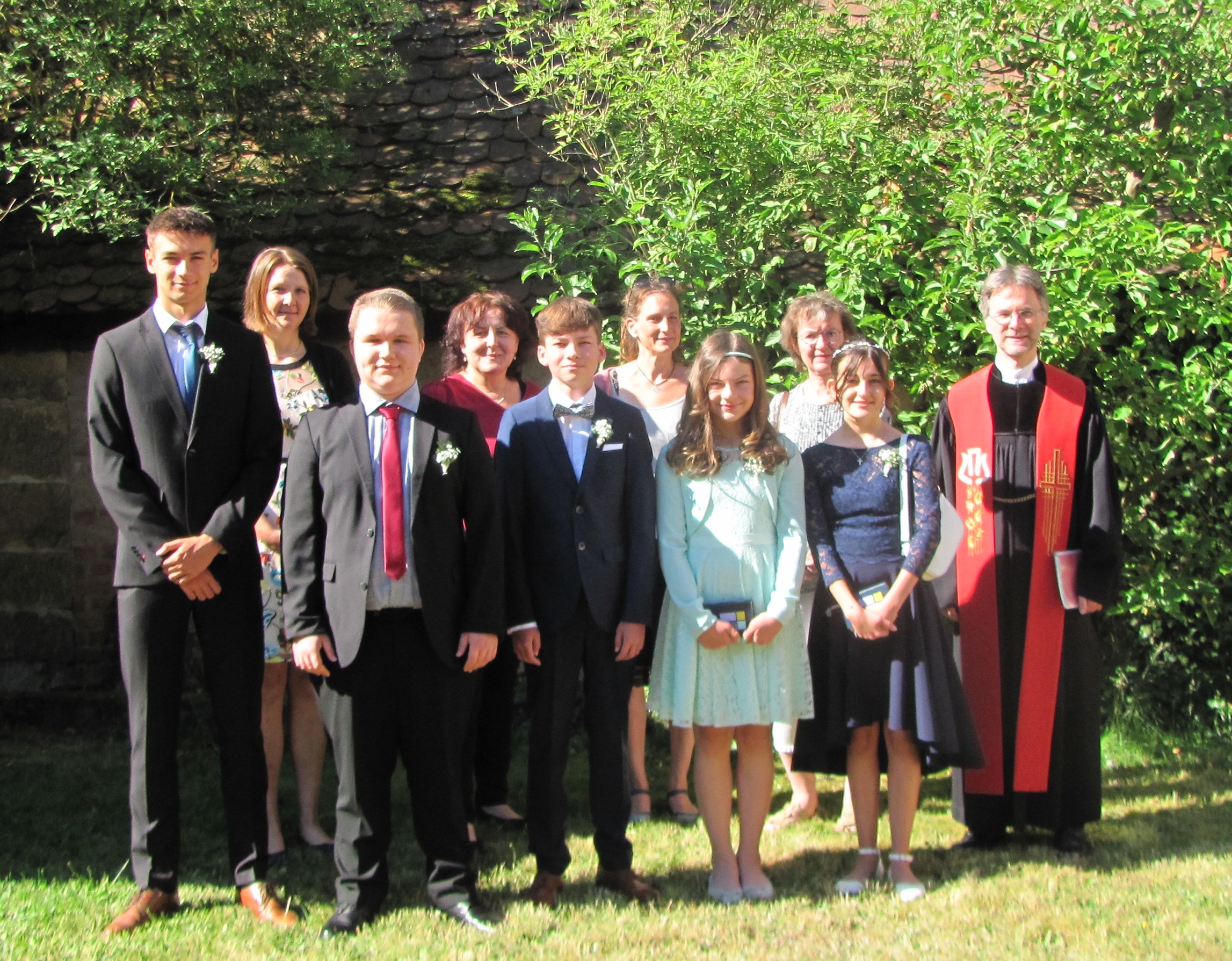 Am Sonntag, 26. Juni feierten Paula Lang, Letizia Riedel, Leo Götz, Lukas Kasten und Marcel Steininger. Ihre Konfirmation. Die Jugendlichen zogen mit Pfarrer Andreas Ruhs und den Mitgliedern des Kirchenvorstandes vom Gemeindehaus zur Kirche. Seit November lief der Konfirmandenunterricht doch seit Corona und nun noch mit dem Krieg in der Ukraine leben wir in einer verrückten Welt, so Pfarrer Ruhs. „Wie wird es weitergehen, wo ist der Friede im Herzen von Wladimir Putin, den Menschen der Ukraine und in den unseren“ „Es passt der Vers „Selig sind die Frieden stiften, denn sie werden Gottes Kinder heißen“. den habe ich als Überschrift für euren Tag heute ausgesucht, so Ruhs. „Ich möchte euch zu Friedensstiftern berufen“. Auch Jesus Christus hat die menschliche Gewalt auf sich genommen. „. Ihr z.B. habt entschieden, mit euren Spenden die Stiftung Wings of Hope (Flyer) zu unterstüt-zen, die seit vielen Jahren in verschiedenen Ländern Kin-der und Jugendliche betreut, die unter Traumata von Ge-walt und Krieg leiden. Man mag denken, schön, aber viel ändert es nicht in der Welt. Das stimmt nicht ganz: Für die kleine Welt eines Kindes oder einer Jugendlichen stiftet ihr ein wenig Frieden. Und wer weiß, was aus diesen jungen Menschen – genauso wie aus euch – eines Tages wird. Vielleicht auch Friedensstifter!