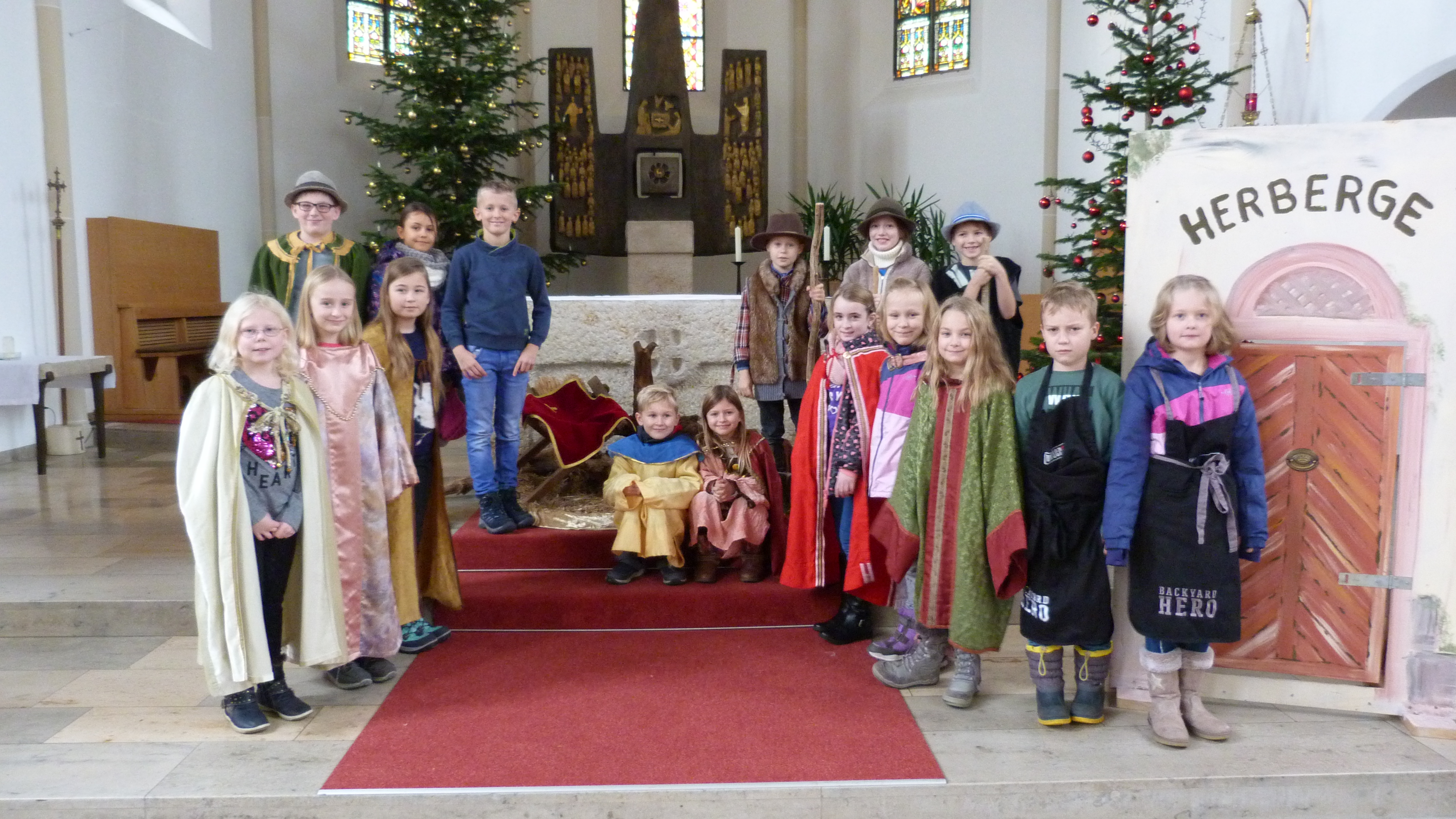 Die Kirche strahlte durch die vielen Lichter am Christbaum. "Es will Weihnachten werden, wir sind versammelt um in die Nacht hineinzugehen, wo Jesus geboren ist ", so der Geistliche. Im Krippenspiel unterhielten sich einige Kinder mit Hirten über die vergangene Nacht. Dort sei ein helles Licht erschienen und eine Stimme sprach zu den Hirten darüber, dass sie sich nicht fürchten sollten und die Stimme sagte, dass in der Stadt Davids der Retter, der Messias geboren wurde. Nach dem Folgen des Lichtes fanden sie dann das neugeborene Kind mit seinen Eltern Maria und Josef, so die Erzählungen des Hirten. Die Kinder beschlossen dann kurzerhand das Kind in Bethlehem zu besuchen. Nach einer langen Reise, nach Fragen an unterschiedlichen Herbergen, dargestellt von Akteuren, fanden sie dann in einem Stall das Erzählte. Im Schlusstext eines Kindes hieß es: „Ausgerechnet wir Kinder gehören zu den ersten, die diesen Jesus zu Gesicht bekommen. Wir wollen anderen Kindern davon erzählen und sie Einladen, mit uns zu euch zurückzukommen. Zur Krippe im Stall von Bethlehem.“ Die Darsteller unter Leitung der Familie Hildebrand hatten das Krippenspiel über viele Wochen mit den Kindern einstudiert. Die kleinen Gottesdienstbesucher konnten während des Wortgottesdienstes ihr Opferkästchen abgeben, das sie während der Adventszeit gefüllt hatten. In den Fürbitten, gesprochen von einigen Akteuren des Krippenspiels, Namen Bezug auf das Kind in der Krippe: Du kleines Kind in der Krippe, du schenkst uns Hoffnung, Glaube, du schenkst uns das Licht. Musikalisch umrahmte den Gottesdienst Fabian Holzgartner an der Orgel. Pfarrer Kohlhepp Segen „von Gott geliebt, begleitet und gesegnet zu werden“ und das Lied „Stille Nacht“ beendete den Wortgottesdienst.