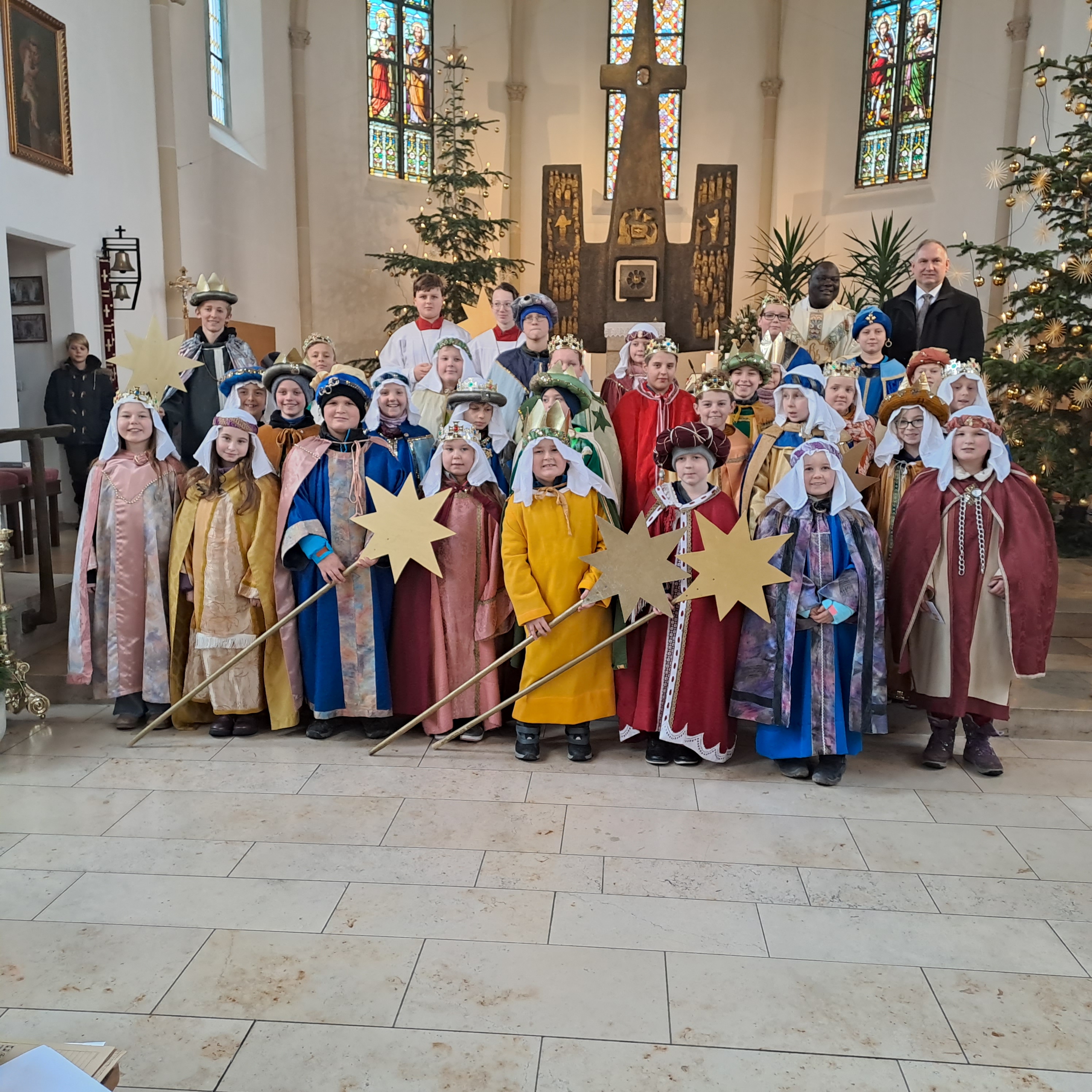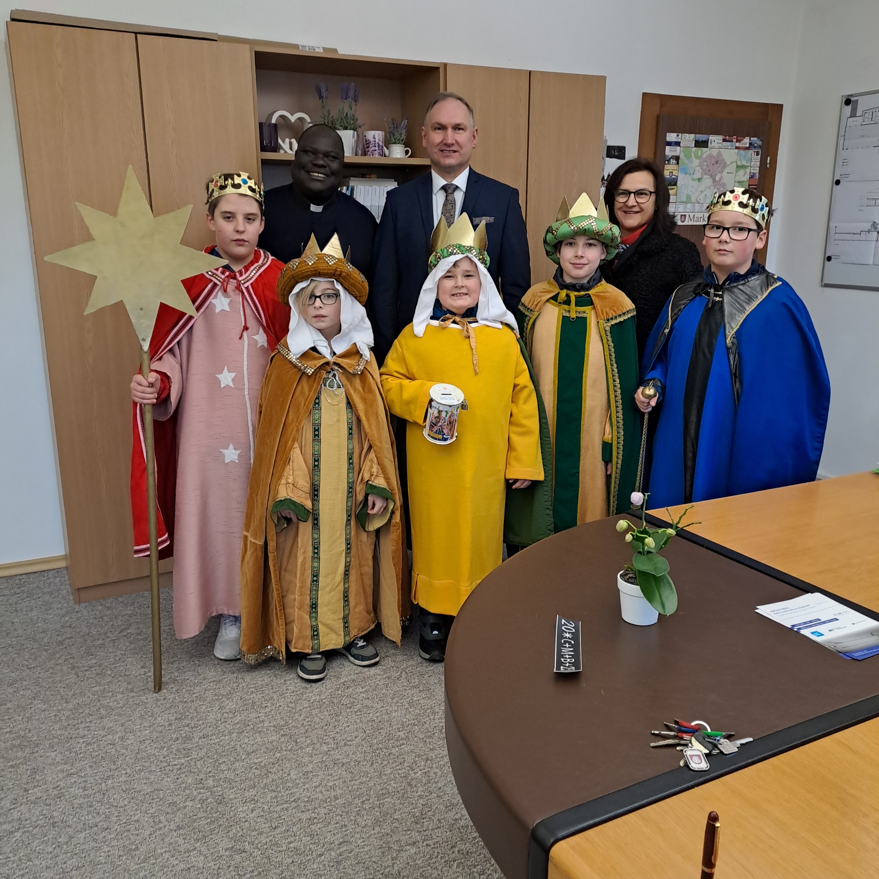 Pfarrvikar Robert Amandu zog am Beginn des Gottesdienstes am Fest der Erscheinung des Herrn mit den Sternsingern in die katholische Pfarrkirche ein. „Der Herr aller Herren, der König aller Könige sei mit euch“, so der Geistliche bei seiner Begrüßung. Durch einige Sternsingerkinder konnten die Gottesdienstbesucher hören, dass Gott selbst als schutzbedürftiges Kind in unsere Welt kam, dass er sich nicht eine prächtigen Königspalast ausgesucht hat, sondern eine Futterkrippe in einem Stall oder auch, dass viele Kinder unter armen und auch gefährlichen Umständen zur Welt kommen und in Umgebungen aufwachsen, die voller Gefahren sind. Für diese Kinder und für alle, die in den Sternsingerprojekten unterstützt werden, galt vor allem heute das Gebet. An dem Festtag der Heiligen Drei König wird auch während des Gottesdienstes Wasser, Kreise und Weihrauch geweiht. So wurde erklärte Pfarrgemeinderatssprecher Josef Grasser und Stellvertreterin Renate Puckschamel während der Segnung durch Pfarrvikar Robert den Hintergrund. Das Wasser, Ursprung des Festes der Erscheinung des Herrn; es erinnert an die Lebenskraft, die Gott dem Wasser verliehen hat, aber auch an das Wasser der Taufe. Die Kreide; mit ihr werden die Buchstaben C M B an die Türen der Häuser geschrieben, es soll uns im Neuen Jahr beschützen. Der Weihrauch; die Weisen brachten als Geschenk dem neugeborenen Kind mit, so wie der Weihrauch zum Himmel emporsteigt, so mögen auch unsere Gebete zu Gott emporsteigen. Nach dem Haussegensspruch, die Kaspar, Melchior und Balthasar an jedem Haus sprechen, segnete Pfarrvikar Robert die Sternsinger auf den Weg zu den Häusern, die sie in den nächsten zwei Tagen zurücklegen. Bürgermeister Richard Kammerer bedankte sich im Anschluss nach den Gottesdienst bei den Sternsingern für ihren Einsatz mit einem kleinen Geschenk. Eine Sternsingergruppe kam im Rathaus vorbei um dort den Segen zu bringen.