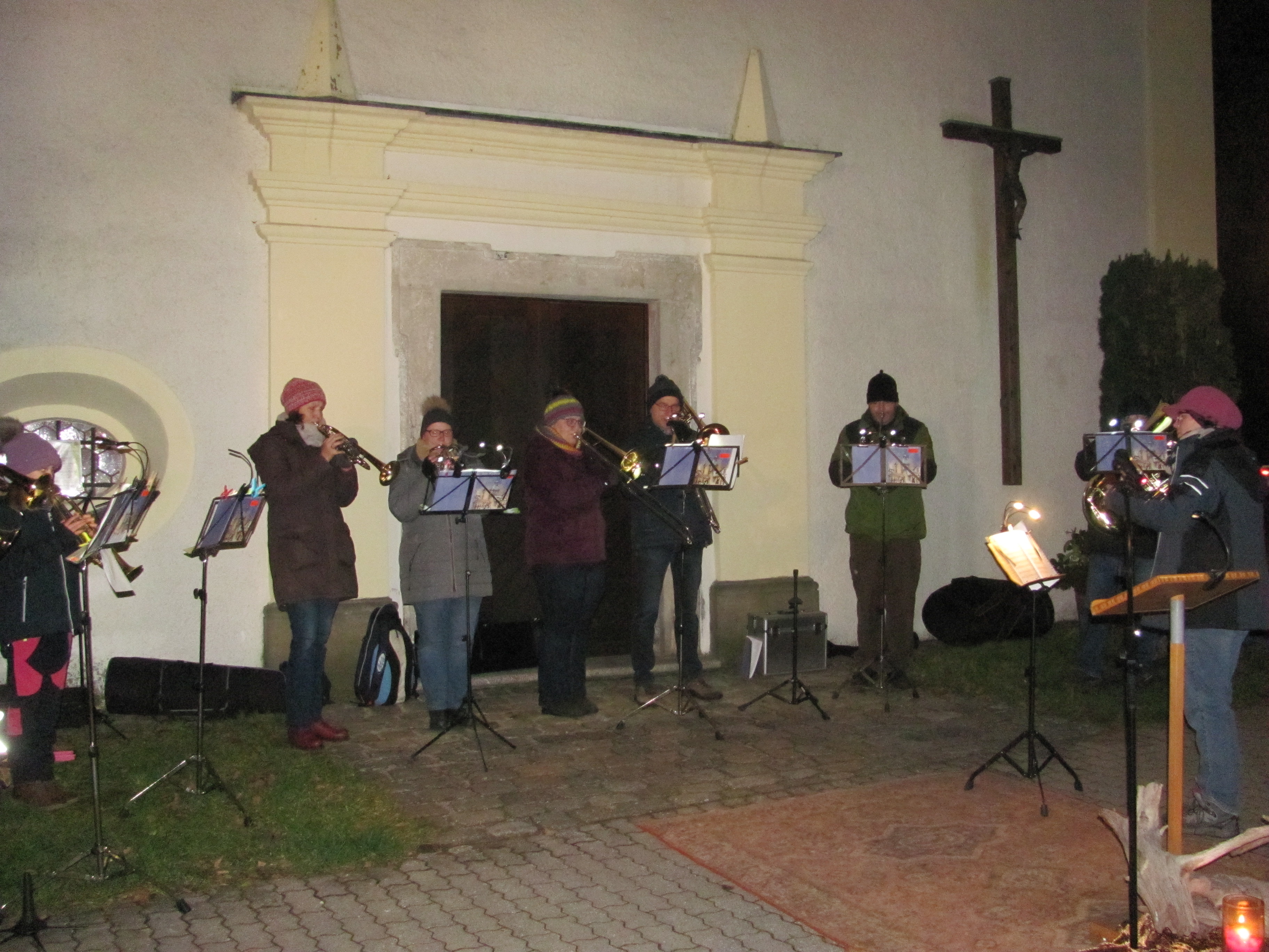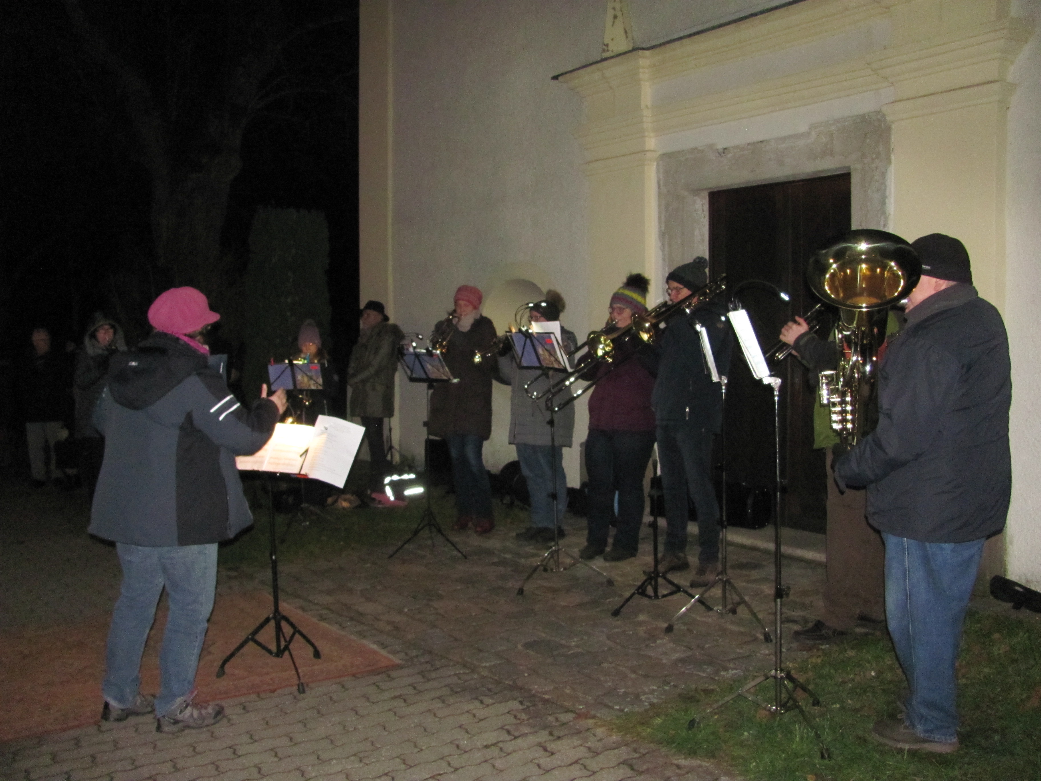 Am zweiten Adventssonntag fanden sich an die 150 Gläubige vor der Moritzkirche zum Adventskonzert im Freien ein. Die Moritzkirche war stimmungsvoll angestrahlt, Kerzen wiesen den Weg auf den Platz. Harald Puckschamel, Vorsitzender des Fördervereins dankte den Zuhörern für das zahlreiche Erscheinen und freute sich ,dass auch in diesem Jahr das Konzert wieder durchgeführt werden konnte. Musikalisch gestaltete der evangelische Posaunenchor unter Leitung von Veronika Weber die Adventsstunde mit Liedern wie: „Herbei oh ihr Gläubigen, Trommlerlied, Kling Glöckchen und Macht hoch die Tür“ Leider war „Leise rieselt der Schnee“ nur ein Wunschdenken, aber es blieb von oben trocken und die Temperaturen waren auszuhalten. Petra Weigl ging in ihrer Erzählung auf den unerschütterlichen Glauben der Heiligen Barbara ein, da ja Sonntag zugleich auch Barbaratag. War. Ottmar Braun stellte in Mundart die Frage wo wohl die Botschaft vom Frieden hängen blieb? Gotthard Betz erzählte von den vier Kerzen am Adventskranz und dass die Kerze der Hoffnung auch wieder Glauben, Frieden und Liebe möglich macht. Steffi Heisl las die Geschichte vom reichen Kind Kasimir. Dessen Eltern scheiterten dann am unerfüllbaren Wunsch ihres Kindes. „Advent, du kommst heute in mein Leben, danke dass du kommst“ war ein Teil des Adventsgebetes von Josef Grasser. Pfarrer Thomas Kohlhepp sprach auch noch Worte zum Advent und nach dem Segen bedankte er sich beim Förderverein für die Organisation und beim Posaunenchor für die Musik. Im historischen Verkaufsstand von Bernhard Weigl schenkten Damen vom Förderverein dann Glühwein und Kinderpunsch aus, Gebäck gab es kostenlos dazu. Alle Einnahmen und Spenden kommen der Moritzkirche zugute.