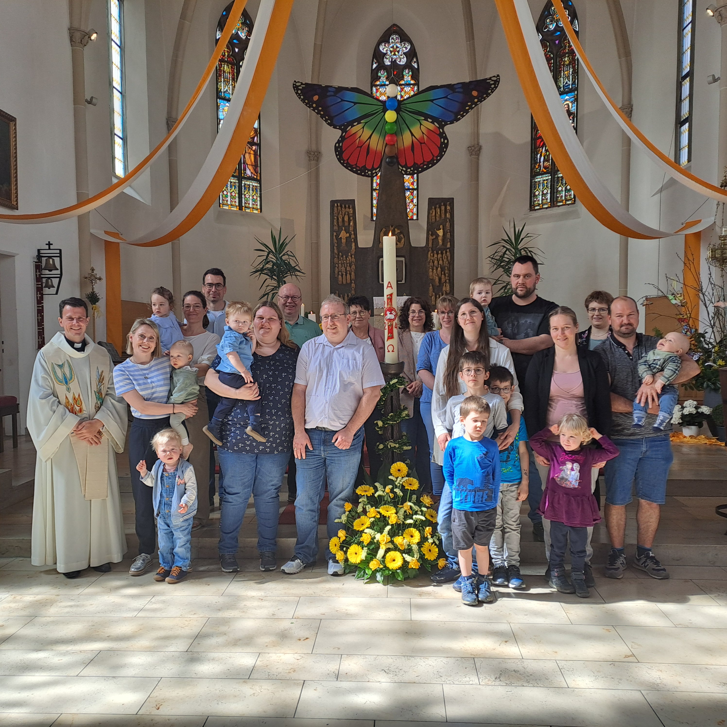 „Liebe Eltern, Paten, Großeltern, Geschwister, willkommen zur Taufgedächtnisfeier.“, so Pfarrer Thomas Kohlhepp bei der Begrüßung am Sonntagnachmittag 7. April in der katholischen Pfarrkirche. „Wir feiern seit einer Woche das Osterfest, wir erinnern uns an das wichtigste Fest des Glaubens. Früher wurden die Christen nur in der Osternacht getauft. Das ist heute anders. Ihr, die ihr im letzten Jahr getauft wurden Erik, Jonas, Leon, Tim, Sophia, Lou, seit heute erneut mit euren Eltern zur Segnung gekommen. In der Taufe sagt Gott, ich liebe dich, ich begleite dich auf all deinen Wegen. “, so der Geistliche weiter. Die FaGott-Teammitglieder trugen die Lesung und die Erklärung um die Taufsymbole vor. So konnte man über Zeichen und Symbole in ihrer Bedeutung erfahren; das Wasser, als Zeichen für Leben; die Dose mit Chrisam, es klingt ähnlich wie Christus, beide Worte sind aus dem griechischen Grundwort abgeleitet, Christus heißt der Gesalbte, mit der Taufe gehören wir zu Jesus; das Taufkleid, die weiße Farbe bedeutet Feierlichkeit und Freude zur Zusage Gottes und die Taufkerze, die an der Osterkerze entzündet wird, ist das Zeichen für Christus zu einem neuen und ewigen Leben. Musikalisch wurde die Andacht vom Duo Rauhreif stimmungsvoll umrahmt. Nach den Einzelsegnung der letztjährigen Täuflinge und Schlusssegen ging es zum Kinderhaus. Dort war für das leibliche Wohl mit Kaffee und Kuchen gesorgt.