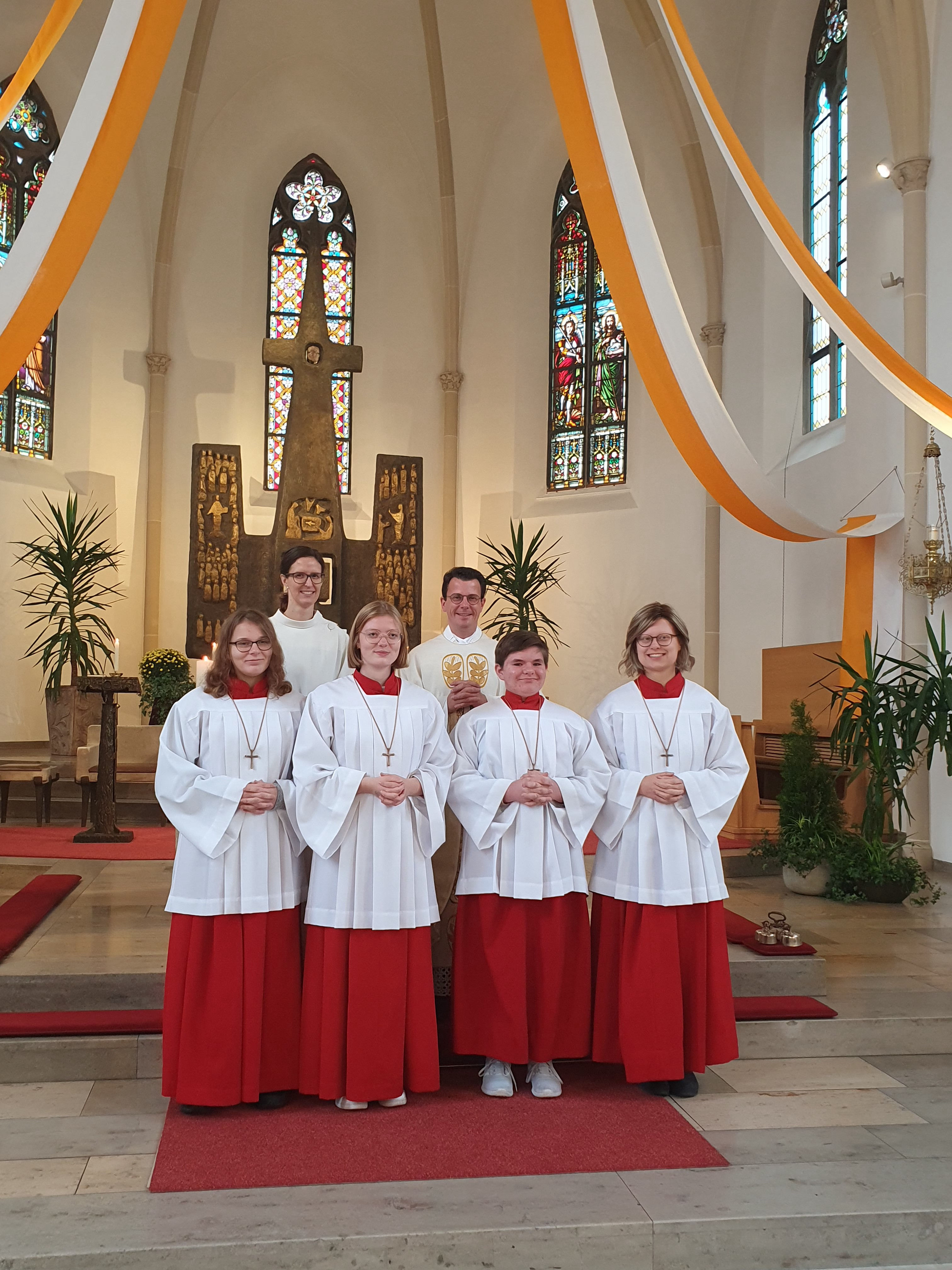Im Kirchweihgottesdienst am 23.10. verabschiedete Pfarrer Thomas Kohlhepp zusammen mit Gemeindereferentin Franziska Bösl drei langjährige Ministrantinnen und zwei Ministranten kamen neu dazu.
