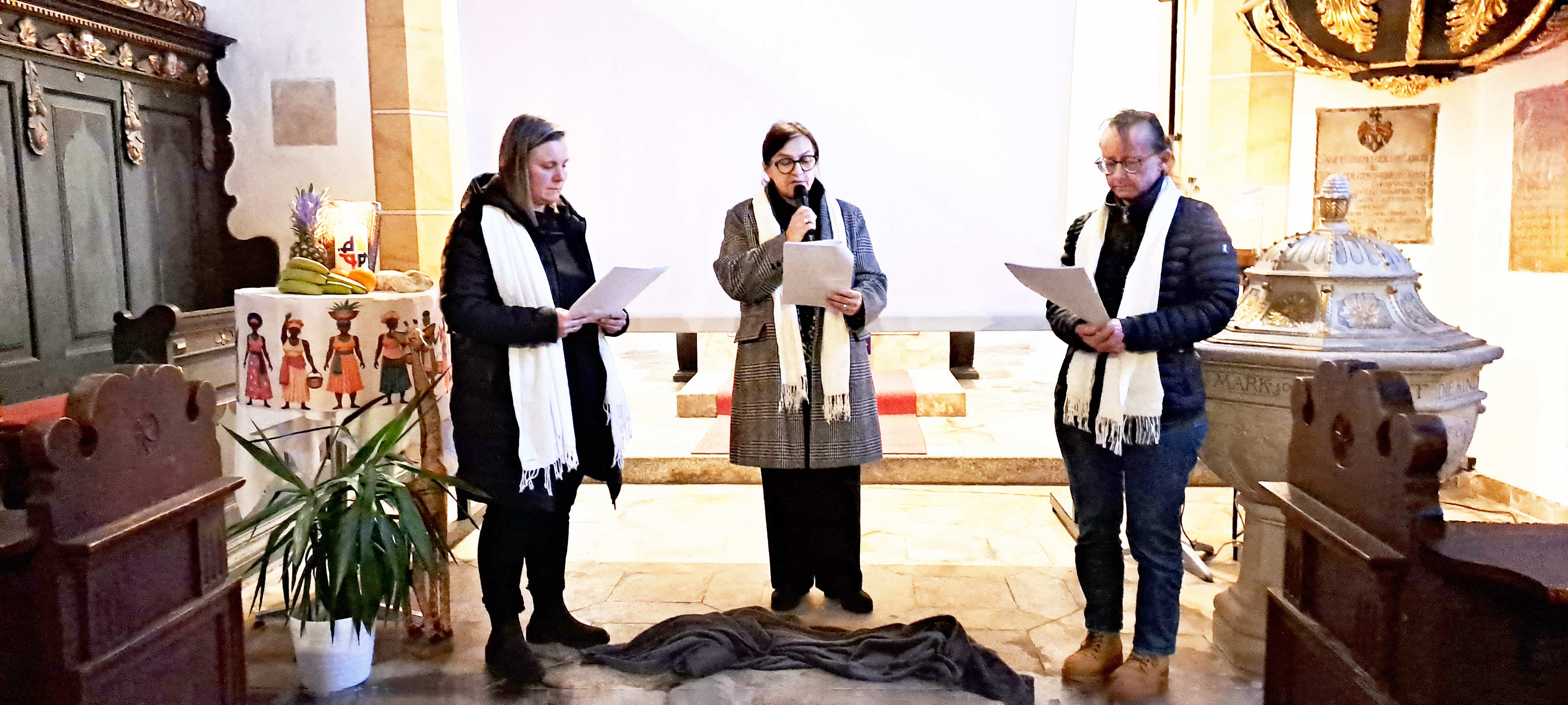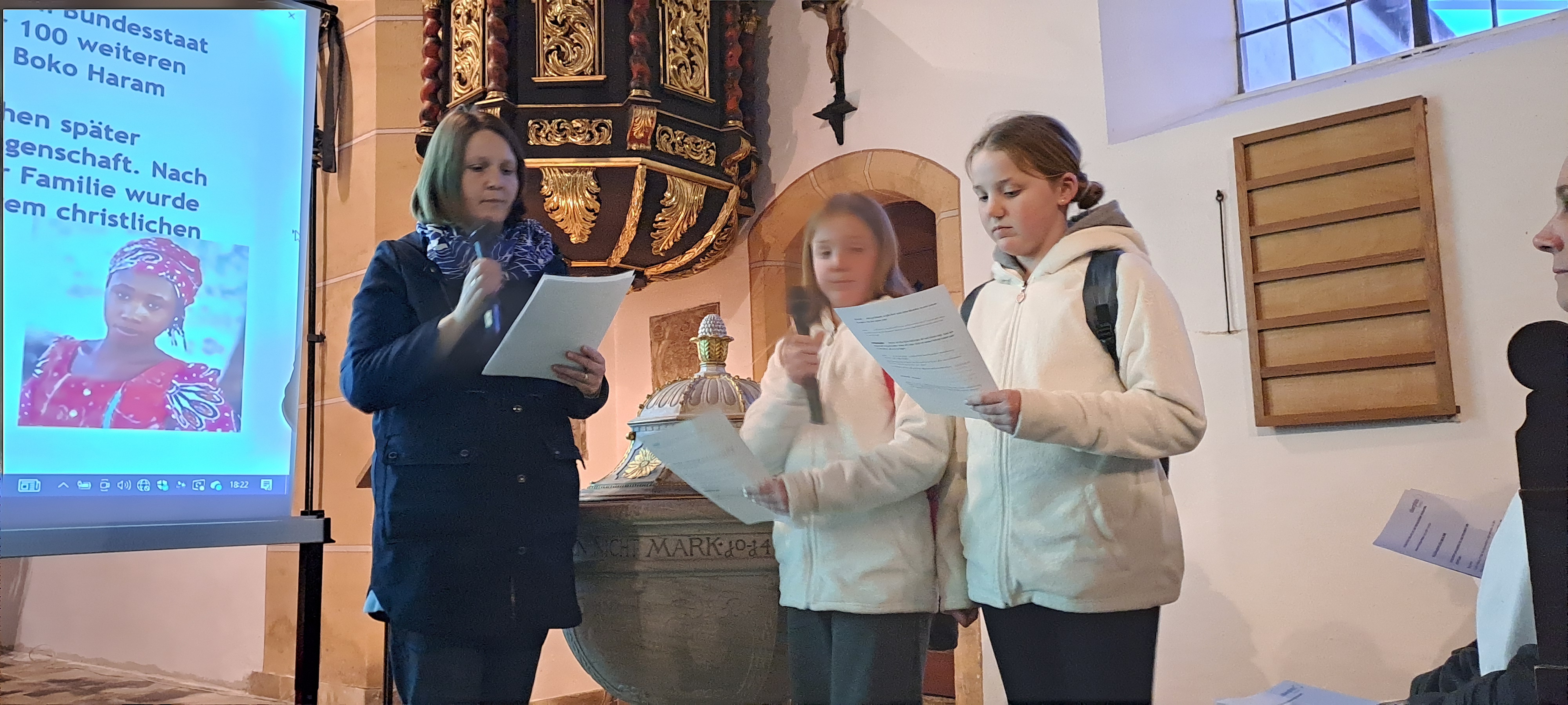 In diesem Jahr richtete die evangelische Pfarrei den Weltgebetstag in der evangelischen Kirche aus. Rosi Uschold richtete den Blick nach Nigeria. Motto war: „Kommt und bringt eure Last“. In Nigaria tragen viele Frauen schwere Lasten auf dem Kopf, Wasserkrüge, Feuerholz, Erntekörbe und Waren für den Markt. Im Gottesdienst wurde vor allem die Sehnsucht nach Frieden ausgedrückt. Weitere Leserinnen waren Renate Puckschamel, Doris Borchardt Carina Zielbauer, Christa Strobel und Daniela Fuhrmann. Anette Punzmann stellte mit ihren Töchtern Magdalena und Sophie die Geschichte von Jato dar, wo eine Mutter Angst hat, dass ihren Kindern auf dem Schulweg etwas passiert. Alle beteten gemeinsam: „Wir vertrauen auf deine grenzenlose Liebe und dein Versprechen, dass d uns niemals verlassen oder im Stich lassen wirst. Erkenntnis: Wir finden Hoffnung in einer belasteten Welt in Christus, der alle unsere Sorgen trägt. „Wir wollen als Hände und Füße Christi in einer Welt wirken, die sich nach Hoffnung und Ruhe sehnt“. Der Weltgebetstag ist die größte und älteste ökumenische Frauenbewegung. Mit der Kollekte werden weltweit über 100 Partnerorganisationen unterstützt, die Frauen und Kinder stärken. Es gab Geschichten von Witwen die Unterdrückung überwinden und Müttern, die den Mut haben ihre Kinder zur Schule zu schicken. Der Singkreis unter Leitung von Susanne Stark wurde noch verstärkt vom Jugendchor. Besonders beeindruckend waren die nigarianischen Gospels wie „Keleya“ und „Chineke“. Auch weitere Lieder gingen zu Herzen. Beim gemütlichen Beisammensein im evangelischen Gemeindehaus gab es ein landestypisches Veganes Gericht mit Tomaten und Reis und besonderen Gewürzen. Lecker waren auch Sesamkekse und Plätzchen, die in der Pfanne gebacken werden. Malventee mit Gewürzen und Fruchtsaft ergänzten die Spezialitäten.