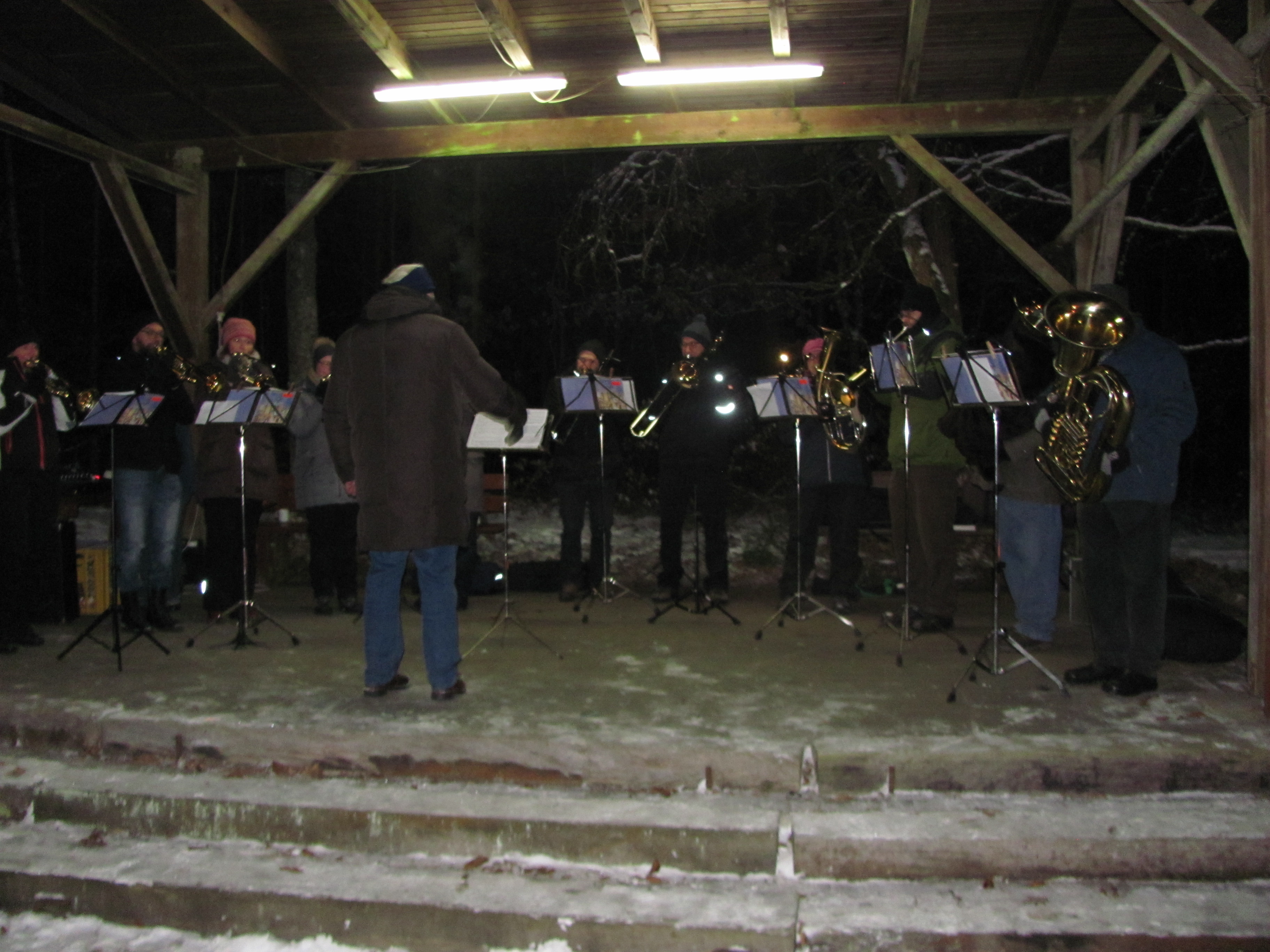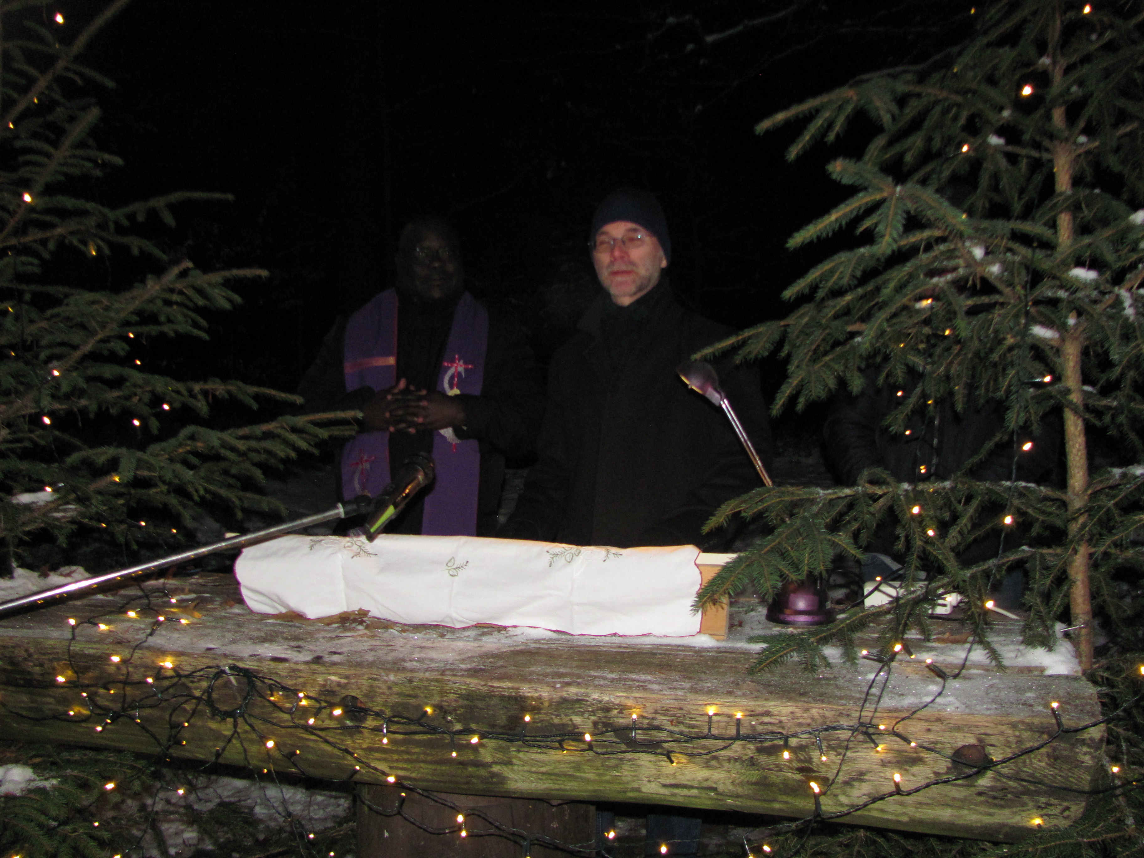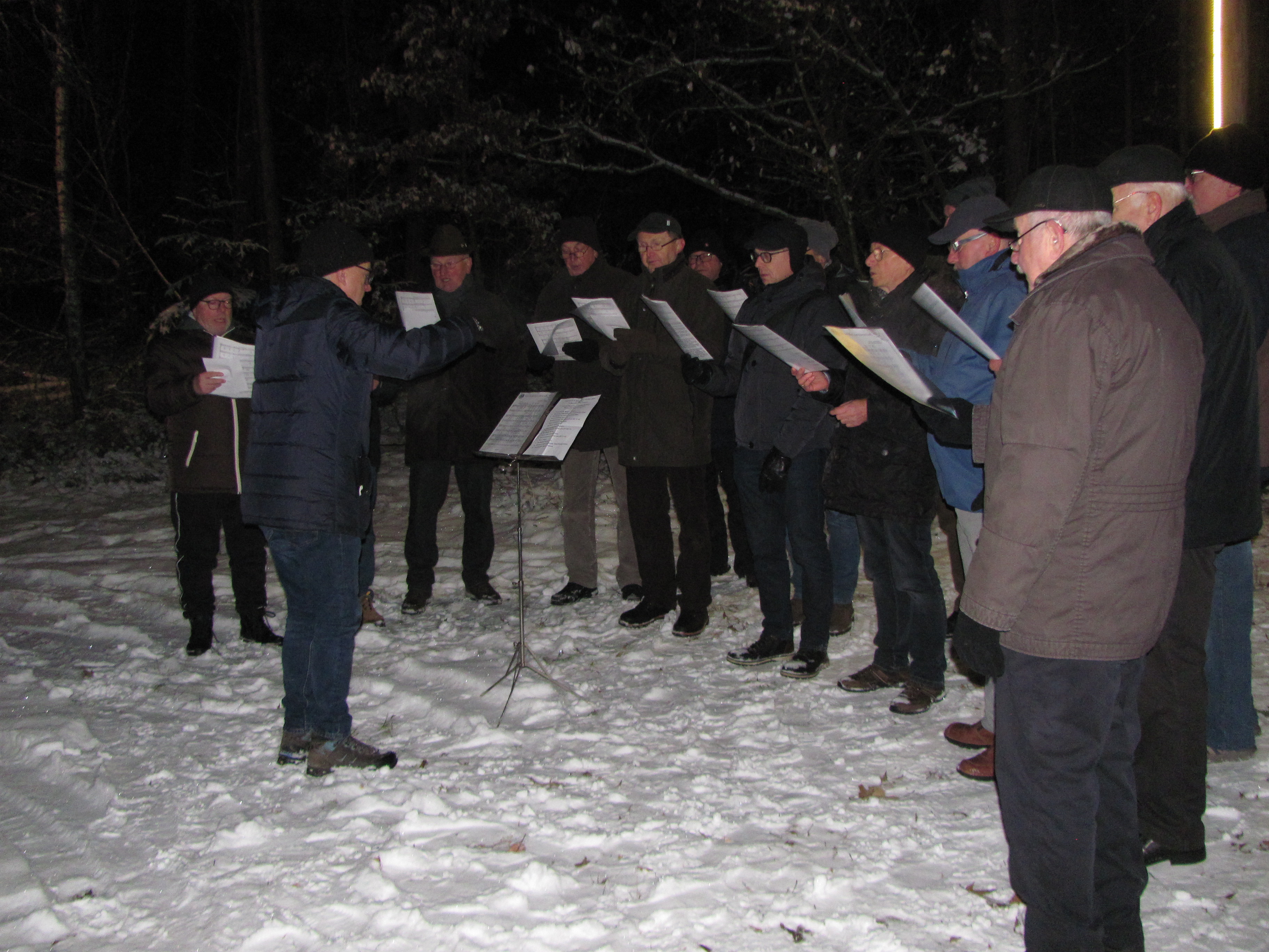 Ein Wintermärchen erlebten die Manteler und Gäste aus der Umgebung am vierten Adventssonntag. Zuerst spielen die Posaunenchöre Mantel-Thansüß unter Leitung von Heiner Müller und Veronika Weber an der Krippe am Marktplatz Weihnachtslieder, dann setzte sich ein Fackelzug zum Waldforum in Bewegung. Viele Besucher fuhren auch mit dem Auto nach Rupprechtsreuth. Im Waldforum herrschte im verschneiten Winterwald mit dem beleuchteten Christbaum und Altar und den Feuerstellen eine zauberhafte Stimmung. Wie OWV-Vorsitzender Klaus-Hannes Kahler ausführte, gibt es die Waldweihnachtsfeier seit 1972 also schon seit 50 Jahren mit zwei Jahren Coronapause. „Nehmen Sie die beruhigende Stimmung in sich auf und erleben sie einige besinnliche Momente der oft vermissten, aber wohltuenden Staaden Zeit“ Die ökumenische Andacht wurde musikalisch vom Männergesangverein Mantel unter Leitung von Michael Bertelshofer gestaltet. „Freu dich Erd und Sternenzelt“, erklang es von den Männerstimmen. Beindruckend waren auch „Rorate“ und „Heilige Nacht“. Der Posaunenchor begleitete das gemeinsam gesungene „Tochter Zion“ und ein Adventslied. Pfarrer Andreas Ruhs und Pfarrvikar Robert Amandu gingen in den Gebeten und Texten auf einen Brief von Paulus an die Philipper ein. Es ging um Hoffnung und dass Gott uns in Jesus täglich begegnet. Durch Jesus ist uns Gott nahe. „Sucht ihr mich, so findet ihr mich“ war die Aufforderung sich bei den Herausforderungen unserer Zeit und des Lebens an Gott zu wenden. In der Bibel ist nachzulesen dass schon immer Menschen auf der Flucht waren und in ein neues Leben aufbrechen musste so wie auch heute die Menschen aus der Ukraine. Vor und nach der Andacht servierten die OWV-Mitglieder Glühwein, Kinderpunsch und heiße Wiener im Brötchen. Das Angebot wurde gerne angenommen, denn bei den knackigen zehn Grad Minus war man für jede Wärmequelle dankbar. Kahler bedankte sich noch bei allen Mitwirkenden, den Geistlichen und den fleißigen OWV-Helfern für Beleuchtung, Aufbau und Verköstigung.