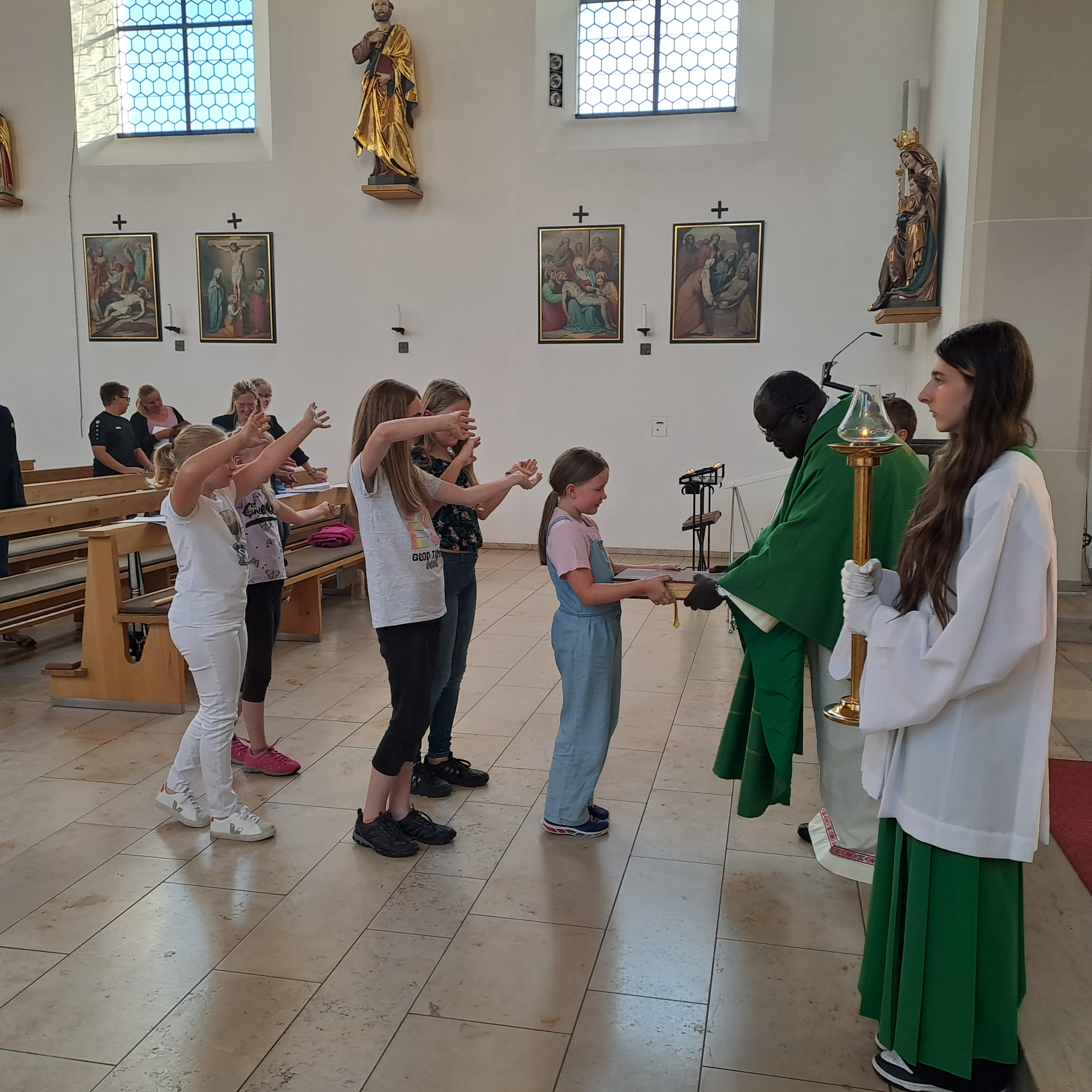 „In deinem Haus bin ich gerne, Vater …“ sangen die Kolping Singers beim Beginn der Messe. „Sowohl in Deutschland als auch in Uganda sind die Gläubigen im Gotteshaus willkommen“, so der Pfarrvikar in seiner Begrüßung. Wir wollen den Blick zu den Menschen in Uganda wagen, indem wir das Land zu Beginn kurz vorstellen, so der Geistliche weiter. Die Republik Uganda, ein Staat mitten in Ostafrika mit etwa 45 Millionen Einwohnern, sei ein Staat in dem unser Bundesland Bayern mehr als dreimal hineinpasst. Die Amtssprachen sind Englisch, daneben noch Kiswahili. Der Pfarrvikar stammt aus der Region Arua im Nordwesten des Landes, dort wohnen die Menschen vorwiegend auf dem Land und leben von der Landwirtschaft. Zum Evangelium dann die Evangelia-Prozession mit Tanz durch 5 Kindern zum Volksaltar, wo sie Pfarrvikar Robert empfing. Anstelle einer Predigt interviewten die Kinder den Geistlichen. Zuerst kamen Fragen über seine Kindheit, wie Brüder, Schwestern oder Eltern; oder bei uns jammern die Schüler oft über viele Schulaufgaben und Hausaufgaben, ist das in Uganda auch so! Es ist dort genauso, seine Auskunft unter Lachen; oder gibt es in Uganda Ministranten, Vereine und Chorgruppen? Was machen sie in den Pfarrgemeinden? Laut Auskunft sei es in Uganda ähnlich. Wie läuft in Uganda eine Beerdigung ab, wir haben gehört, dass es traditionelles Singen und Tanzen gibt? Die Liturgie ist laut dem Geistlichen gleich, jedoch treffen sich die Familien, wie weinen gemeinsam, sie kommen in den 4 Tagen bis zur Beerdigung zusammen, beten, und wenn der Verstorbene alt und krank war, dann freuen sie sich über die Erlösung des irdischen Leidens, dass wird traditionell mit Singen und Tanzen ausgedrückt. Nach der Messfeier bedankte sich Pfarrvikar Robert bei allen, die den Gottesdienst mitgefeiert haben, vor allem bei den Kolping Singers für die „perfekten Liedern“, sein Dank galt auch dem Gottesdienstteam, den Kindern und vor allem bei Pfarrsekretärin Kerstin Janner, die alles so „super“ organisiert hatte.