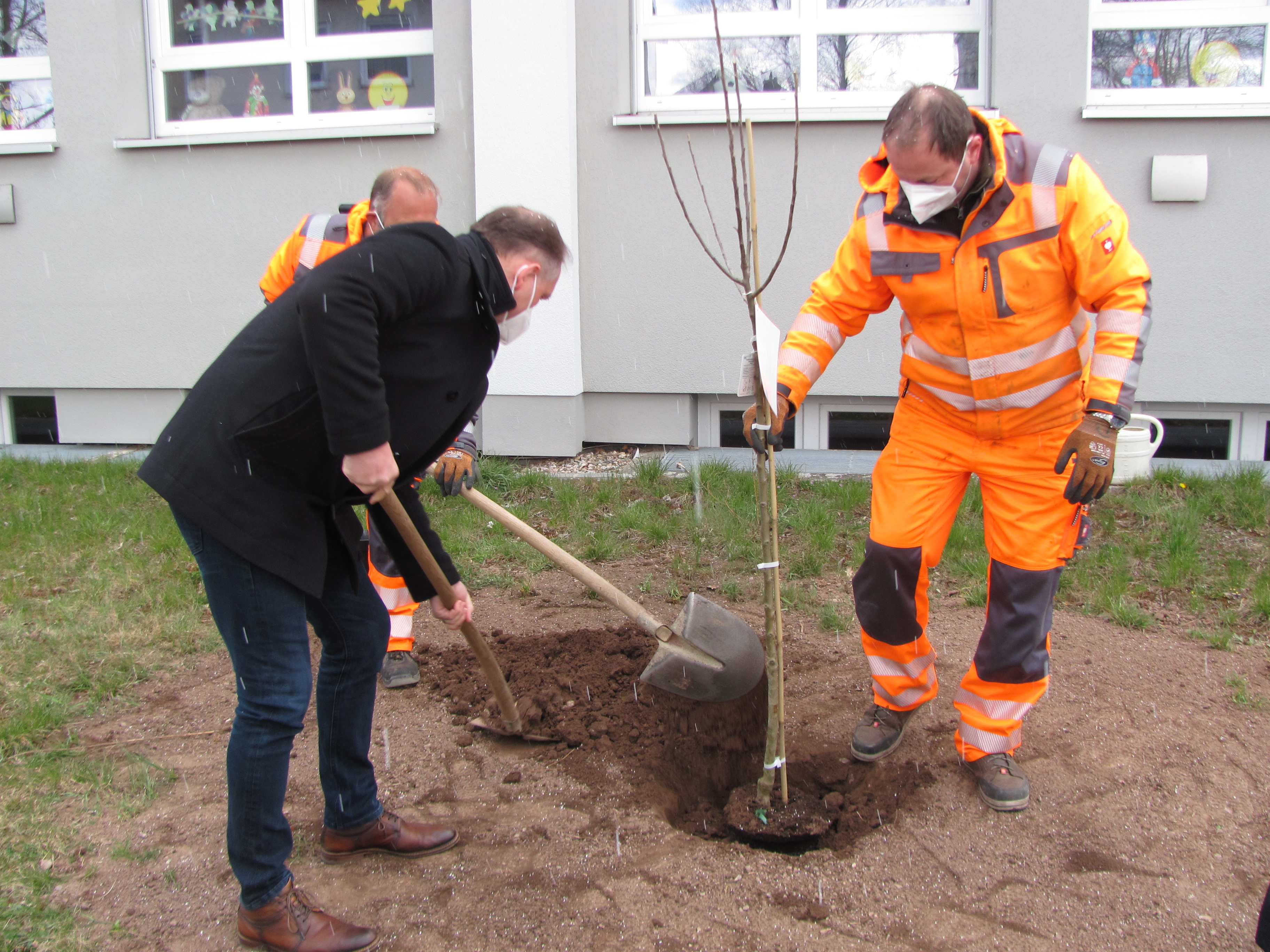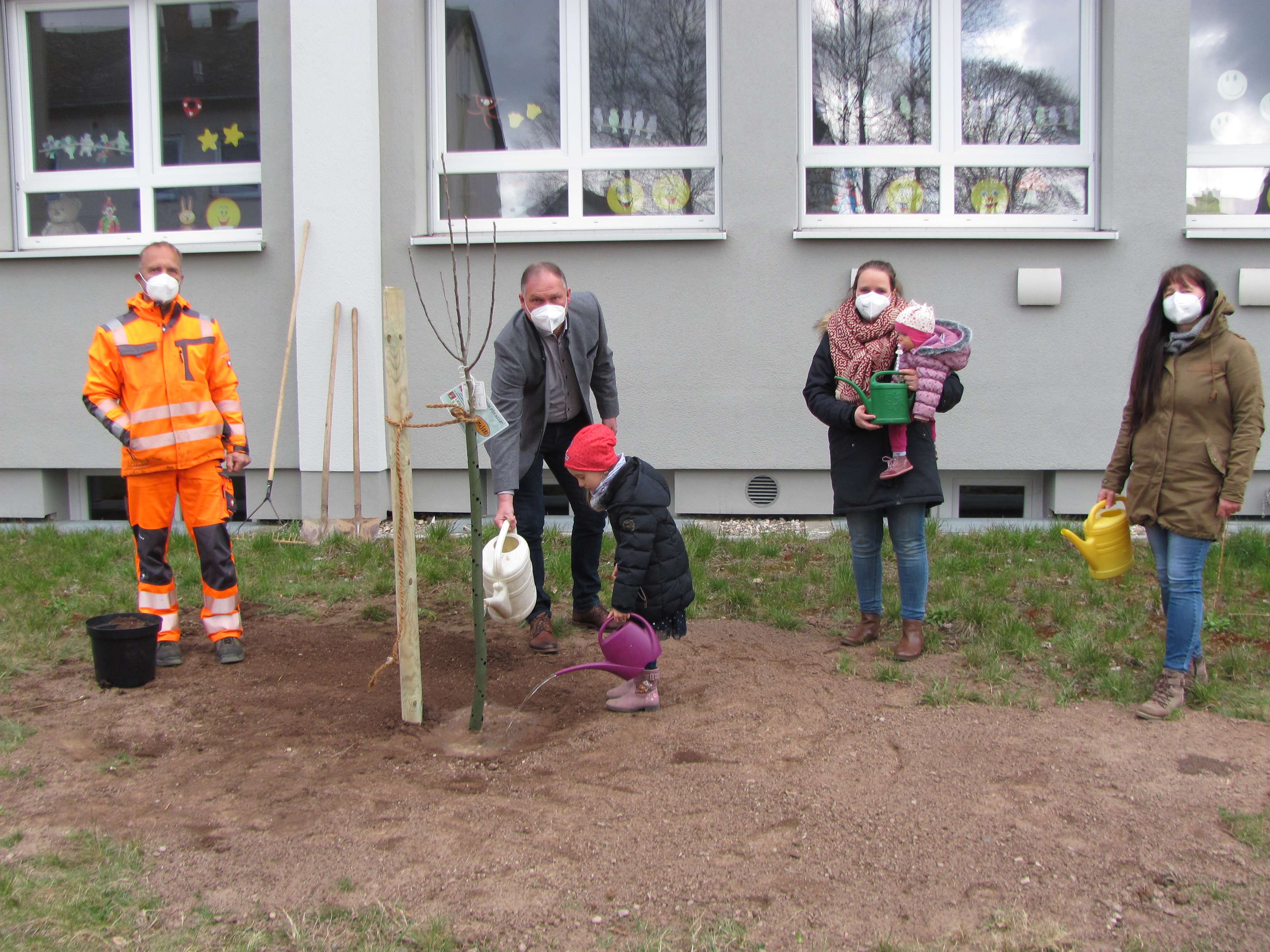 Bürgermeister Richard Kammerer hat bei der Aktion von Radio Ramasuri „Apfelbäumchen für alle“ mitgemacht und bekam prompt von dem Sender und der beteiligten Gärtnerei Steinhilber aus Neustadt ein Bäumchen. Das wurde jetzt nach Ostern ausgeliefert. So ein Bäumchen will ja auch gepflegt sein und Kammerer fand in Claudia Bertelshofer, welche die Mutter-Kind-Gruppen leitet und auch gleich neben dem Gemeindezentrum wohnt eine Patin. Am Mittwoch, 14.4. hatten die Mitarbeiter des Bauhofes die Pflanzstelle vorbereitet. Sie liegt genau vor dem Fenster des Gruppenraumes der Eltern-Kind-Gruppen so dass die Kinder beobachten können wie das Bäumchen wächst und blüht und dann Früchte trägt und die Früchte dann auch ernten können. Claudia Bertelshofer kümmert sich drum dass das Bäumchen regelmäßig gegossen wird. Bei dem Manteler Bäumchen handelt es sich um ein „adeliges“ Gewächs. Es trägt den Namen „Freiherr von Berlepsch“ und ist ein Sommerapfel. Wie Bürgermeister Kammerer bestätigte, wird der Markt Mantel auf eigene Initiative im Gemeindegebiet noch weitere Bäume pflanzen. Am Rande des neues Festplatzes ist schon eine kleine Obstwiese entstanden. Nach dem der Baum in der Erde war gossen gleich Kinder der Gruppe die mit ihrer Mama und Gießkännchen gekommen waren den Obstbaum.