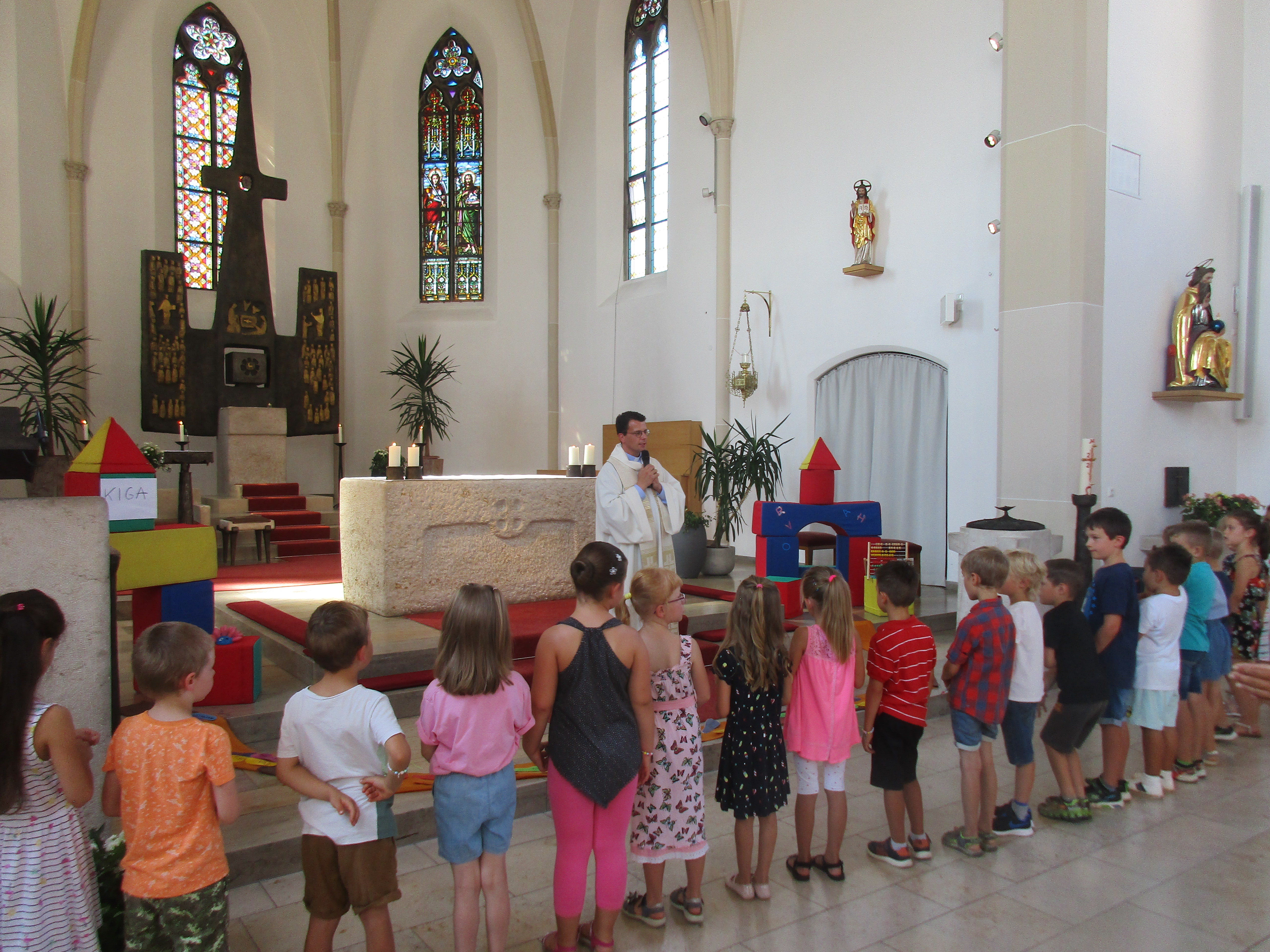 Die Schlaufüchse zogen zum Instrumentallied: Gottes guter Segen ist mit Euch, zum Altar und wurden vom Pfarrer begrüßt. Thema war Spuren hinterlassen neue Wege gehen. Gemeinsam überlegten die Kinder welche Spuren sie hinterlassen haben ob sichtbar oder unsichtbar. Die Erzieherinnen erklärten dass sie die Kinder zum Teil über die ganze Kindergartenzeit begleiten durften und an ihrer Seite waren. Mit einem Segen endete die Andacht. Nach der Andacht zogen alle gemeinsam mit den Eltern wieder zurück ins