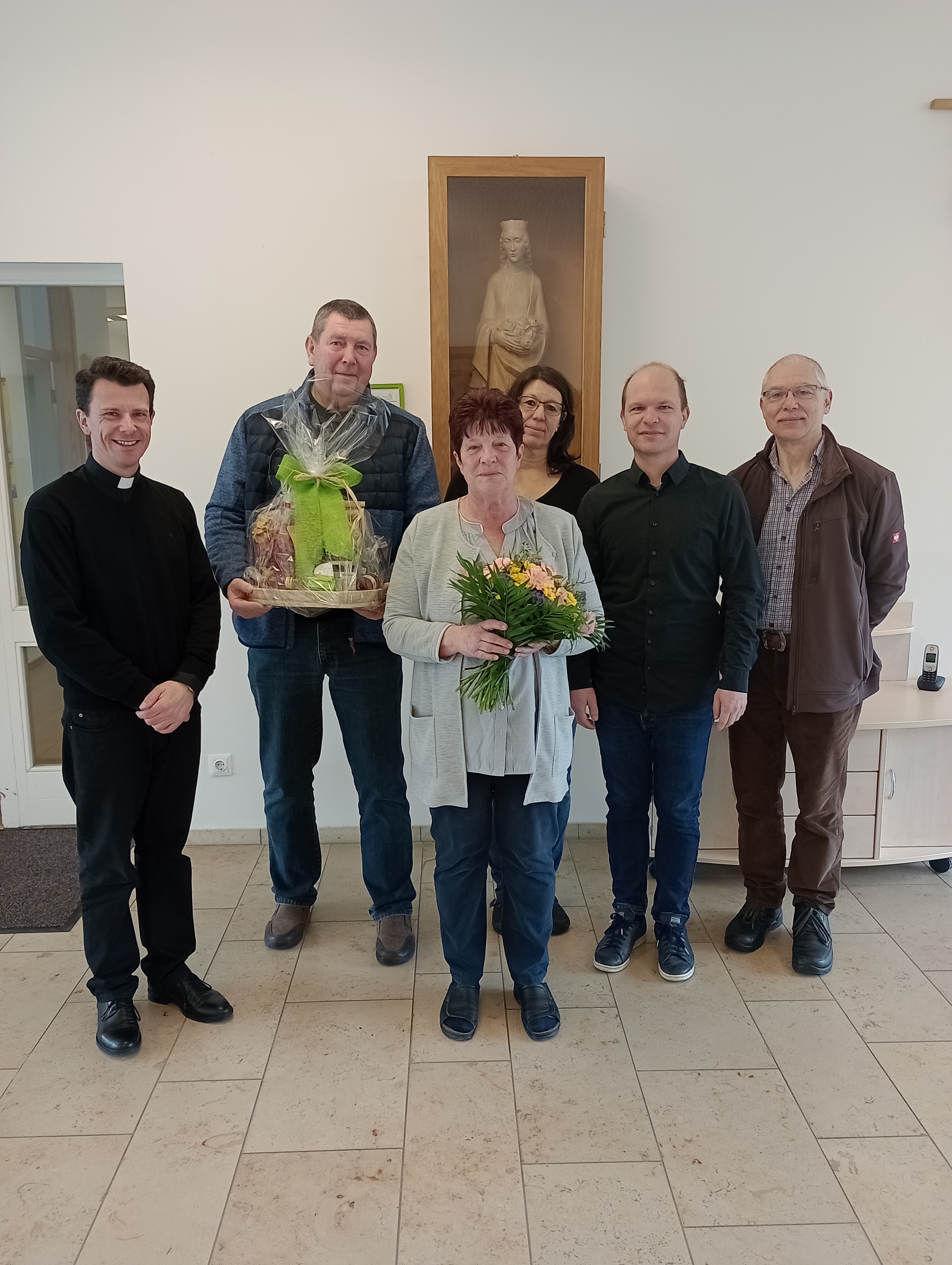 Am 25.3.2024 wurde Frau Evi Pietruska offiziell von Pfarrer Thomas Kohlhepp, Kirchenpfleger Karl Hofmann, Geschäftsführer Florian Hoffmann und Harald Schumann (Kindergartenbeauftragter) in den Ruhestand
