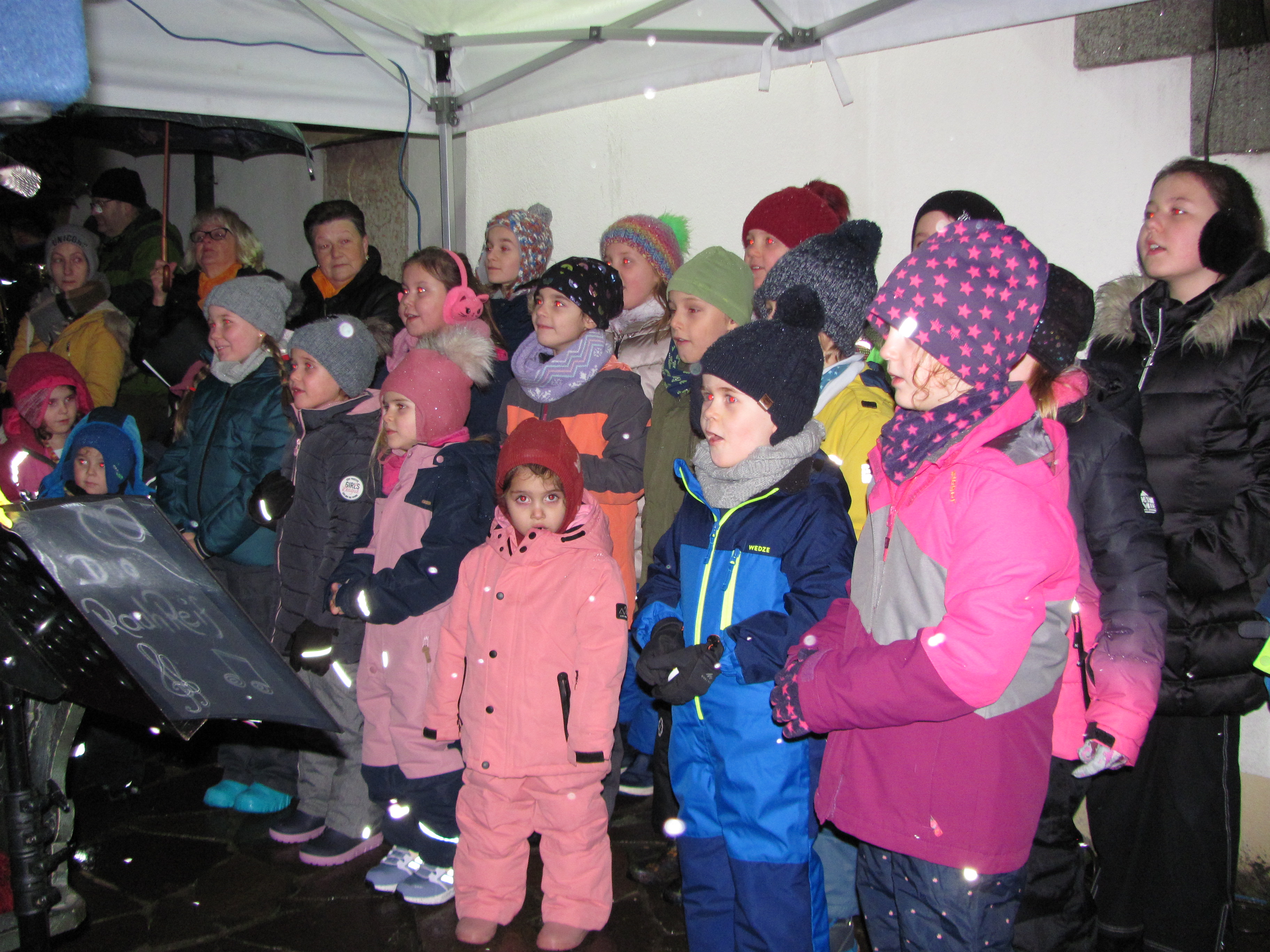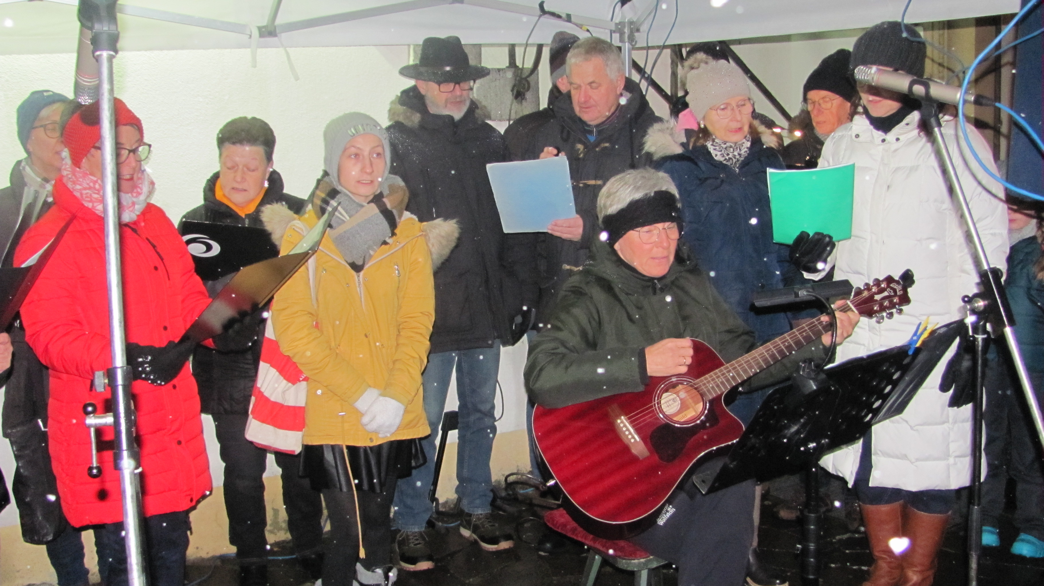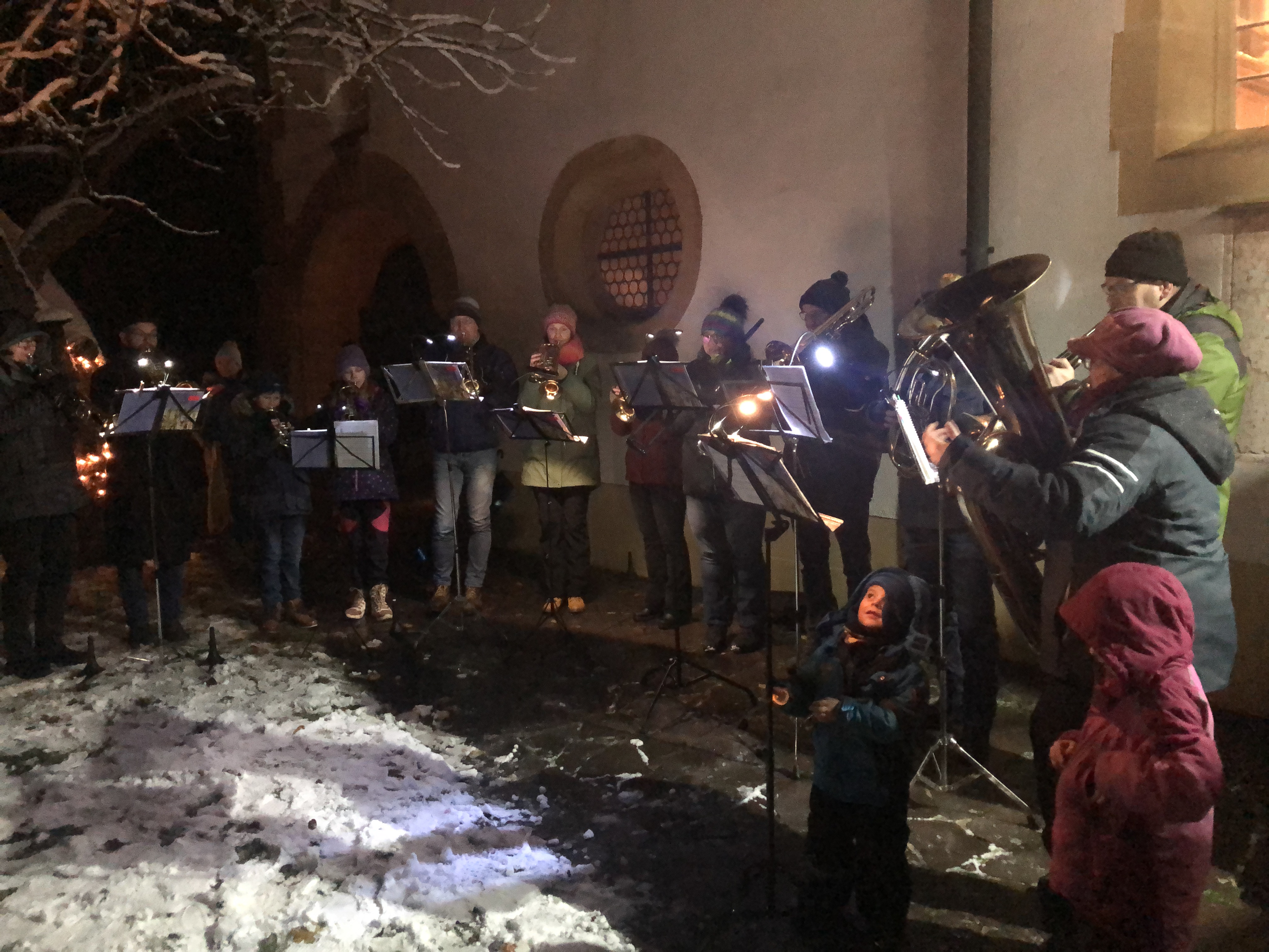 Ein voller Erfolg war das dritte Adventsansingen am Freitag im evangelischen Kirchhof. Die Bäume waren beleuchtet, Laternen sorgten für Romantik und der leichte Schneefall sorgte für Stimmung. An die 200 Zuhörer belohnten die Mühe der Organisatorinnen Gisela Reil, Rita Steiner Jutta Lippik und Annette Punzmann und zahlreicher Helfer, die das ökumenische Adventssingen auf die Beine gestellt hatten. Der evangelische Posaunenchor startete mit „Macht hoch die Tür“. Bei „Kling Glöckchen“ haben auch zwei neue Nachwuchsbläser mitgespielt. Bezaubernd war der Kinderchor unter Leitung von Susanne Hausmann mit dem „Adventskalenderfest“ und meine kleine Kerze. Unter Leitung von Susanne Stark verstärkte der Singkreis die Kinder bei Adventskranzkerzenglanz und „Feliz Naviadad“. Die Kolping-Singers glänzten mit „Still ist das Land und „Traum der Weihnachtszeit“. Albert Puff las eine Geschichte vor in der es darum ging dass oft ein einziges kleines Licht mehr bedeuten kann als die Weihnachtsbeleuchtung in den großen Städten. Das Duo Raureif erfreute mit „Dezemberträume“. Beim abschließenden weihnachtlichen Halleluja stimmten alle Gäste mit ein und es erklang ein großer Gemeinschaftschor im Kirchhof. Pfarrer Andreas Ruhs ging in seiner Ansprache darauf ein dass wir das Licht von Jesus brauchen das uns wieder mehr Frieden bringt in der Welt und in den Herzen. Das Licht begleitet uns durch die Adventszeit. „Tragen sie dieses Licht in die Welt hinaus aus dem Kirchhof in ihre Umwelt und in die ganze Welt. Es ist nicht leicht zu verarbeiten was wir täglich im Fernsehen sehen oder lesen was in der Welt oder auch in den Kirchen passiert. Pfarrer Ruhs erteilte dann den kirchlichen Segen. Es wurde Kinderpunsch und Glühwein ausgeschenkt und es gab Plätzchen. Doris und Frank Borchardt verteilten als himmlische Boten verkleidet die Plätzchen unter die Zuhörer und sorgten so für weiteres weihnachtliches Ambiente.