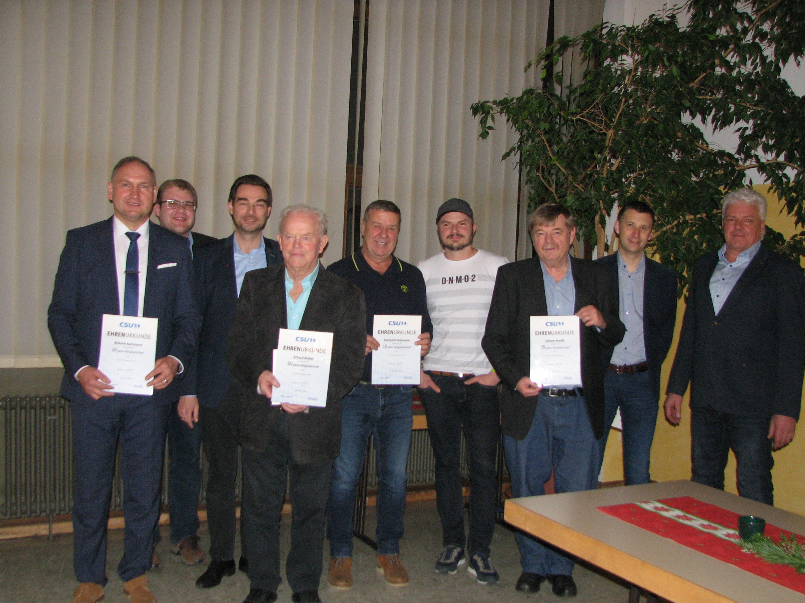 Auf 35 Jahre Mitgliedschaft bringt es Hans Kneißl, 30 Jahre gehört der ehemalige Marktrat Herbert Schmid den Christ-Sozialen an. Für zwei Jahrzehnte Mitgliedschaft in der CSU wurde Rathauschef Kammerer gewürdigt. Reinhard Sassmann und Marktgemeinderat Johannes Wittmann sind seit 15 Jahren dabei, und Tobias Schmid ist seit 10 Jahren Mitglied. Alle wurden mit Urkunden ausgezeichnet.