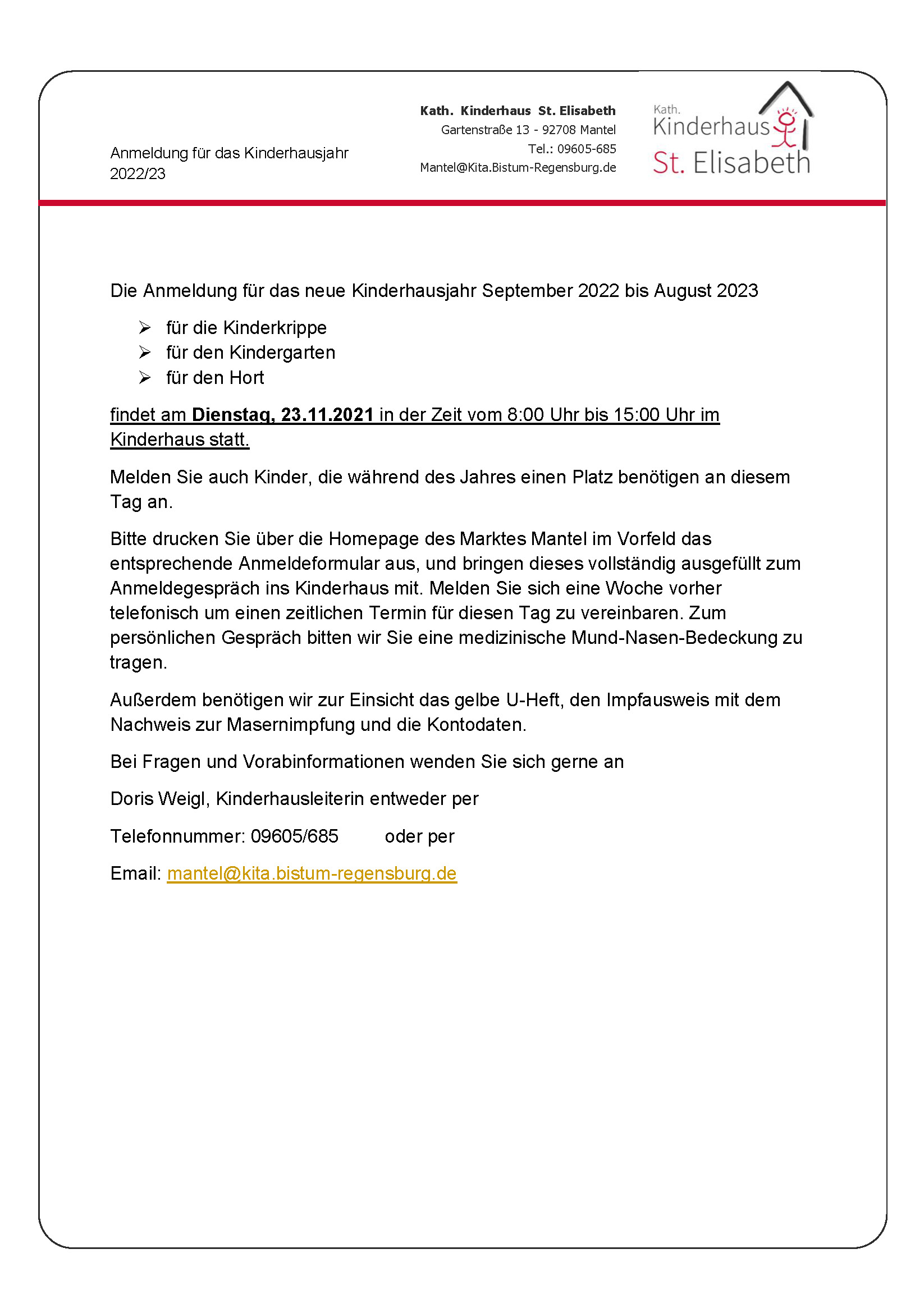 Anmeldung Kinderhaus 2021