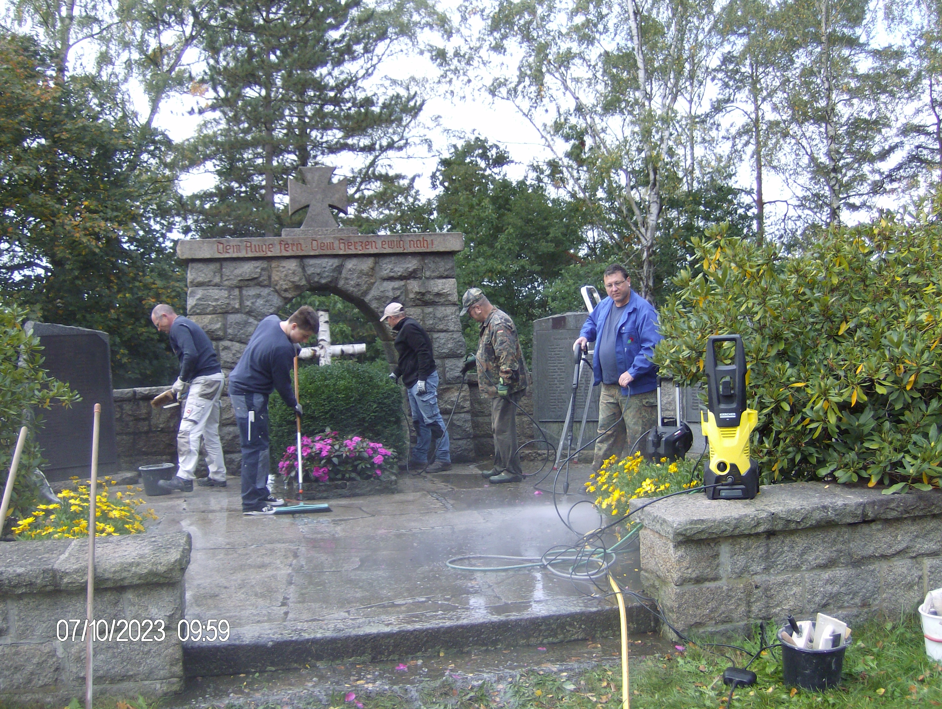 Da die letzte Säuberung schon zehn Jahre zurückliegt, rief die Vorstandschaft vor dem Wintereinbruch zu einem intensiven Arbeitseinsatz. Zehn Kameraden befreiten die Betonfugen der Natursteinplatten von losem Material und verfugten sie neu. Sie strahlten die Granitmauern mit Hochdruckreinigern ab und reinigten das Denkmal aus dem Jahr 1953.