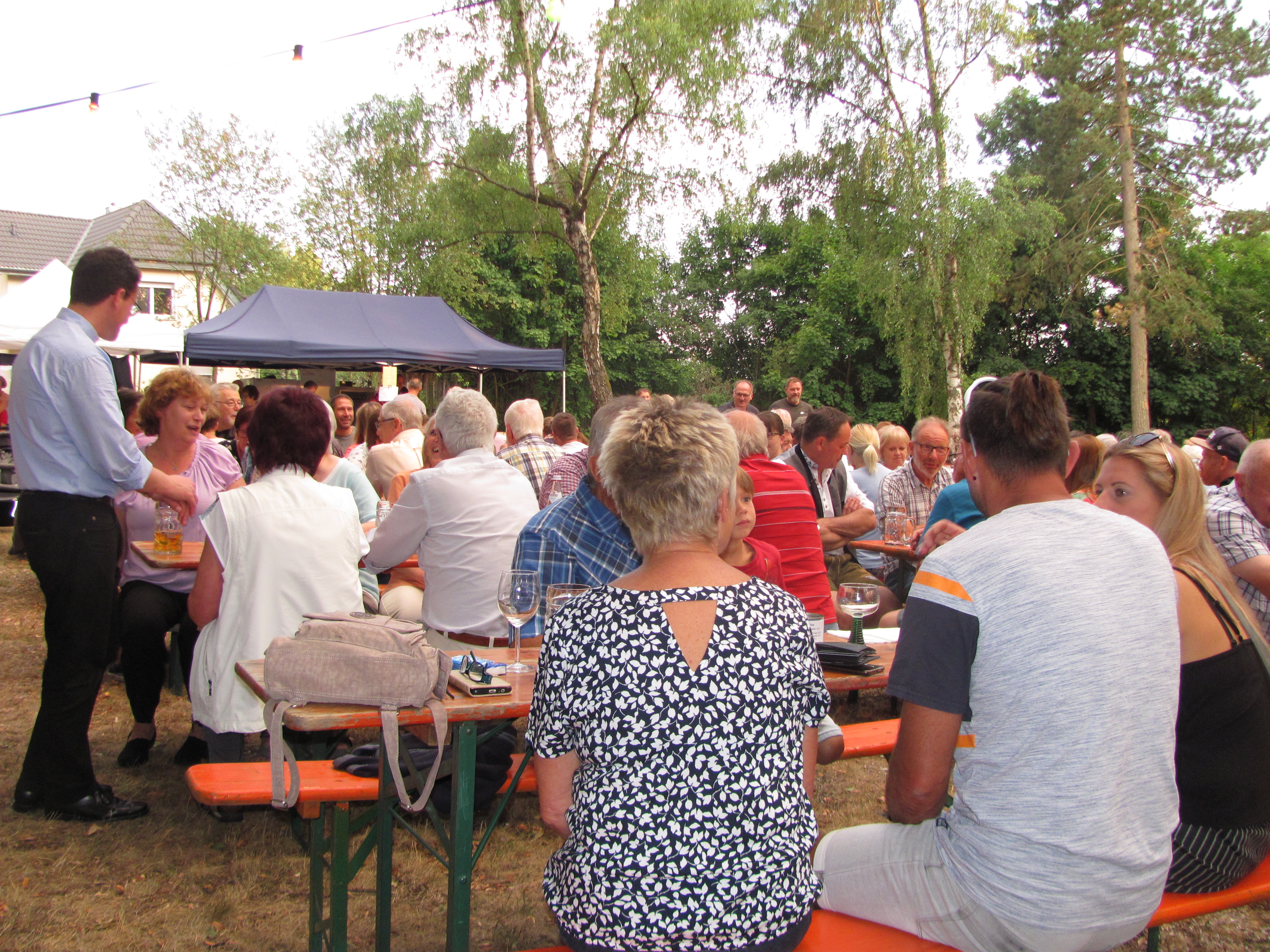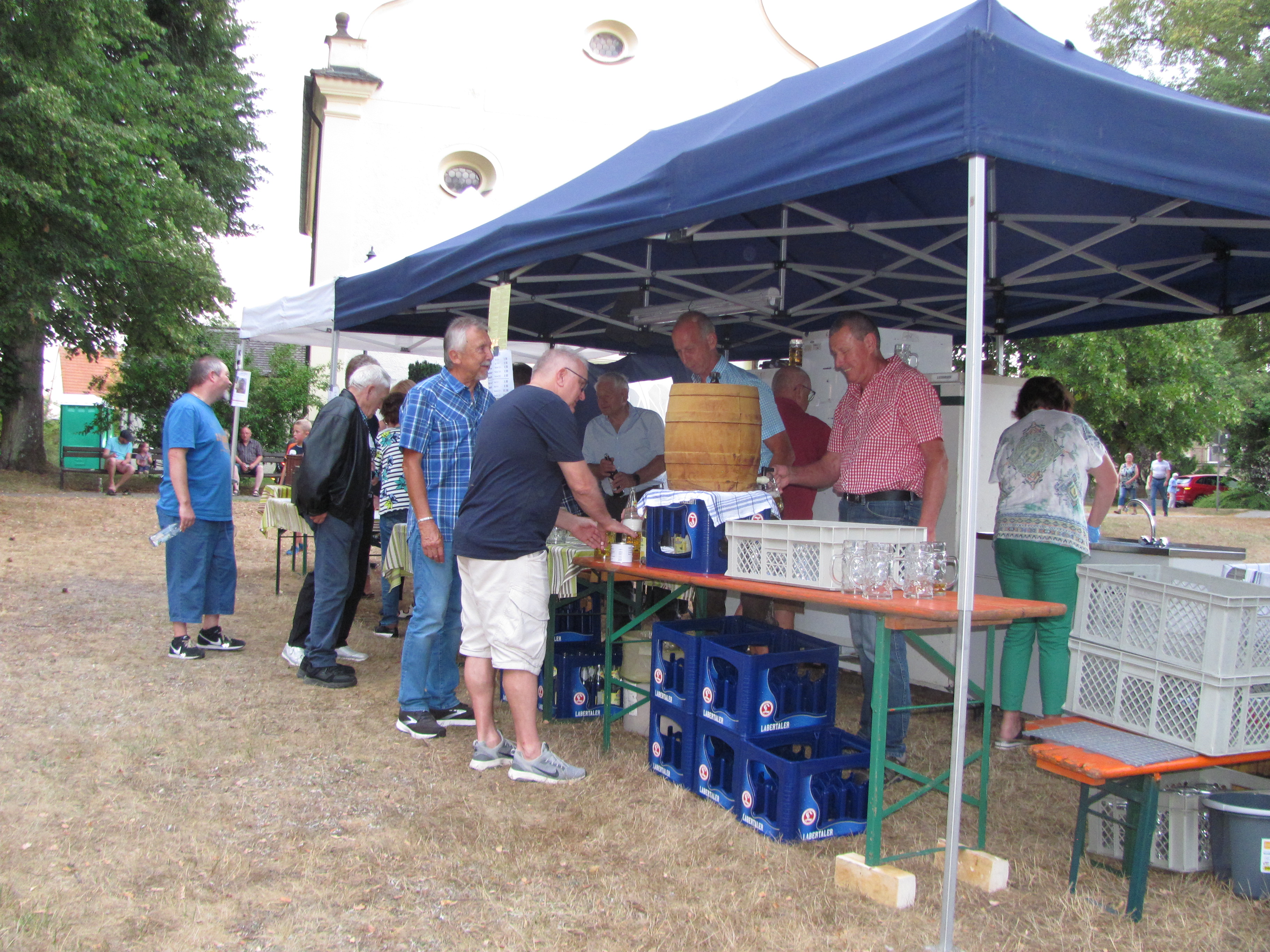 Rundherum gelungen ist der Bayerische Abend zu dem der Förderverein der Moritzkirche eingeladen hatte. Das Wetter war ideal und nicht so heiß und die Bierbänke waren im Schatten unter den Linden vor St. Moritz aufgestellt und luden so zu längerem Verweilen ein. Vorstand und Mitglieder des Fördervereins boten Wein, Erfrischungsgetränke und süffiges kühles Festbier an. Der Zulauf der Gäste war so groß, dass das erste Fass bald geleert war und Nachschub geholt werden musste. Für das leibliche Wohl war mit Leberkäs, Brezen, Käse und Zwiebelkuchen gesorgt. Pfarrer Thomas Kohlhepp und Pfarrvikar Robert Amandus waren auch unter den Gästen und unterhielten sich angeregt. Als es dunkel wurde sorgten bunte Lampen für romantische Stimmung. Die Zogil Lauser hatte zünftige volkstümliche Musik auf Lager aber auch Oldies oder neuere Hits von DJ Ötzi: „Ein Stern der deinen Namen trägt“. Dass der Abend so gelungen ist war vor allem dem Zusammenhalt der Helfer, vor allem aus der Vorstandschaft zu verdanken und auch deren Ehepartner packten mit an. Alle Spenden und der Erlös kommen ausschließlich der Moritzkirche zugute.