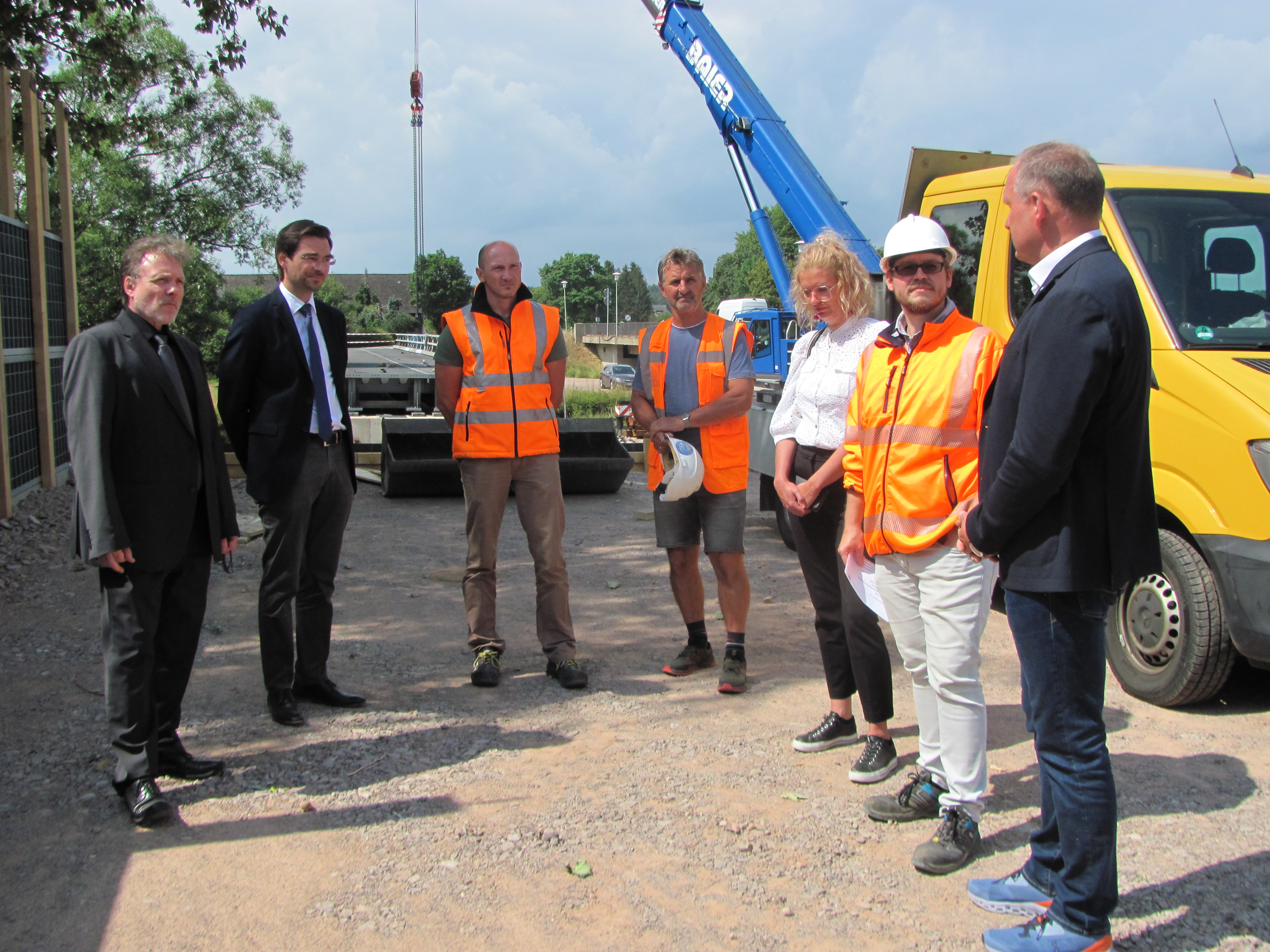 Auf der Staatsstraße 2166 fand zwischen dem 25. Und 27. Juni 2022 der Einhub der Behelfsbrücke für die Erneuerung der Haidenaabbrücke statt. Dabei kam es an den drei Tagen zwischen 18 und 21 Uhr zu drei kurzfristigen Sperrungen. Diese dauerten jeweils etwa 15 Minuten und es gab einige Verkehrsbehinderungen. Seit April 2022 laufen die Bauarbeiten für die Erneuerung der Haidenaabbrücke bei Mantel an der Staatsstraße 2166. Diese waren notwendig geworden da die bestehende Brücke nach 65 Jahren alter- und betriebsbedingt sehr geschädigt war dass der Verkehr nur noch eingeschränkt mit Ampelregelung über die Brücke führen konnte. Die Behelfsbrücke war dann ab 8. August 2022 befahrbar und für den Verkehr freigegeben. Für den Abbruch und Neubau der Haidenaabbrücke ist der Zeitraum von einem Jahr geplant. Das Staatliche Bauamt hat die Bevölkerung um Verständnis für auftretende und unvermeidbare Verkehrsbehinderung. Sowohl zur Vermeidung von Beeinträchtigungen des Bauablaufes als auch zur Vermeidung von Gefährdung des Baupersonals bittet das Bauamt der Beschilderung strikt Folge zu leisten. Im Umfeld der Baumaßnahme ist eine rücksichtsvolle und besonders aufmerksame Teilnahme am Straßenverkehr wichtig. Beim Einhub des letzten Bauteiles der Behelfsbrücke waren MdL Dr. Stephan Oetzinger, Bürgermeister Richard Kammerer, Herr Beer, Behördenleiter des staatlichen Bauamtes, Projektleiter Herr Kick, Herr Gebert von der Bauaufsicht und Frau Willer die zuständig für die Presse- und Öffentlichkeitsarbeit ist auf der Baustelle. MdL Dr.Stephan Oetzinger erklärte dass hier sieben Millionen Euro in die Hand genommen werden. In der jetzigen Zeit ist so ein Bauvorhaben nicht einfach zu bewältigen. Preissteigerungen und Schwierigkeiten bei der Materiallieferungen machen momentan ein Bauvorhaben nicht leicht. „Aber die Zusammenarbeit mit dem Staatlichen Bauamt Amberg-Sulzbach klappt hervorragend, wir stehen immer in Kontakt“, bestätigt der Abgeordnete. Auch Bürgermeister Richard Kammerer freut sich dass es endlich losgeht mit der neuen Brücke, weil die Ampelregelung und nun auch die Bauarbeiten schon eine starke Belastung für die Anwohner sind und er hofft dass dann mit der neuen Brücke der Verkehr wieder leiser und reibungslos läuft.