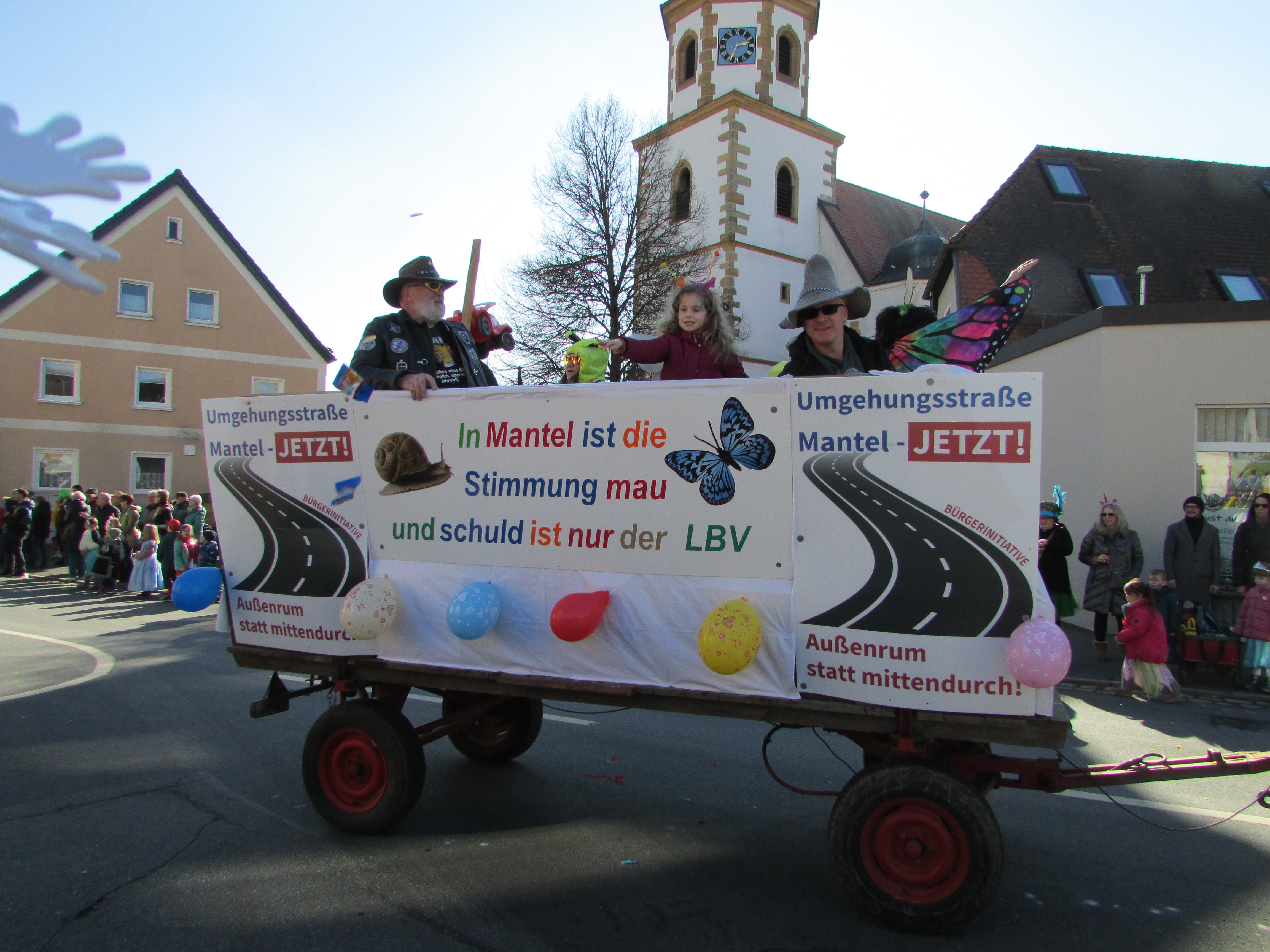 „In Mantel ist die Stimmung mauh, schuld daran ist nur der LBV“ stand auf dem Faschingswagen, mit dem die Bürgerinitiative Umgehungsstraße erstmals mit im Gaudiwurm dabei war. Aber die Stimmung war dank des strahlenden Sonnenscheins bestens. „Ich wusste gar nicht ,dass Mantel so viele Einwohner hat“, meinte eine Bürgerin als sie die gut 2.000 Zuschauer an der Strecke des Zuges sah. Vom Baby im Kinderwagen bis zu Senioren mit Rollator, Rollstuhl oder E-Scooter war jede Generation vertreten. Auch aus den Nachbarorten waren zahlreiche Faschingsliebhaber gekommen. Viele Zuschauer waren maskiert und bester Laune. Die Mitglieder des Vereinskartells luden zum nächsten Bürgerfest ein und freuten sich auf die vorherige Festbierprobe bei der Brauerei. Die VfB Damen waren als Fußgruppe unterwegs im Kostüm von Schmetterlingen ein weiterer Hinweis auf die Verzögerung der Ortsumgehung. Die Clubfreunde Mantel feierten mehr Party als Punkte ihres Vereins. Die CSU und JU hatte den Haushalt als Thema auf dem Festwagen. Die Dusl-Darter marschierten als Fußgruppe mit und erklärten dass sie nun in Mantel zu Hause sind weil Hirschau kein Mitleid mit kleinen Vereinen hat. Der Zapfwellenstammtisch alts Glump reichte pikante Brote vom Wagen und wies auf das nächste Bulldogtreffen hin das wohl in Weiherhammer stattfindet. Stark vertreten war auch die erste Mannschaft des VfB. Tierisch gut drauf war der Mantler Stammtisch. Kartell-Mitglieder sammelten am Straßenrand Spenden. Zahlreiche Zuschauer folgten dem Gaudiwurm dann zum VfB-Gelände. Dort konnte sich jeder mit Kaffee und Krapfen stärken, mit Getränken und auch Bratwürste und Hamburger dienten als gute Unterlage für etwaigen Alkoholgenuss. Nachdem alle gestärkt waren, begann der Luftballon-Wettlauf durch einen Parcours der beteiligten Vereine. Als Sprecher fungierte Bürgermeister Richard Kammerer, wie seine Kartellkollegen als brave Hausfrau mit Kittelschürze und Perücke verkleidet. Schiedsrichter war Johannes alias Johanna Wittmann auch mit Zopffrisur und Dirndl ein reizender Anblick. Glücksfee Franzi zog die Reihenfolge der Starts. Der Zapfwellenstammtisch schwächelte und trat nicht zum Wettkampf an. Der VfB lieferte sich mit dem Manteler Stammtisch ein heißes Gefecht, der Schiedsrichter musste einschreiten und der Parcours in Ordnung gebracht werden. Bereits zum zweiten Mal verteidigte der Mantler Stammtisch den Titel und erhielt einen Karton Klopfer. Kartellvorsitzender Richard Kammerer versprach im Falle einer weiteren Titelverteidigung im nächsten Jahr einen Wanderpokal. Bei herrlichstem Frühlingswetter hielten sich die Maschkerer noch lange am VfB-Gelände auf. Die Aktion wurde von der Bäckerei Ziegler und der Metzgerei Guber unterstützt. In diesem Jahr geht die Spende des Erlöses an das Kinderhaus für ein neues Spielgerät.