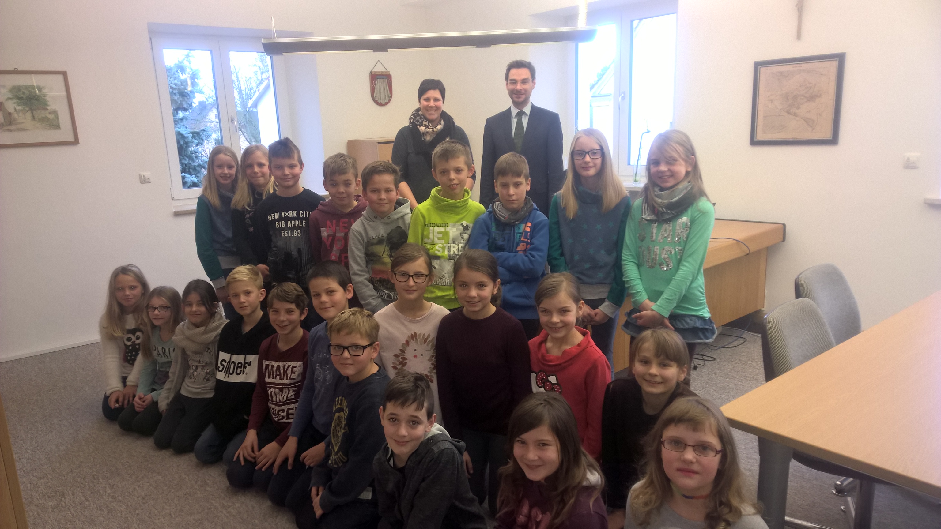 Viele Fragen hatten die Viertklässler für ihren Besuch bei Ersten Bürgermeister Dr. Stephan Oetzinger vorbereitet. Mit Lehrerin Stefanie Heisl statteten sie dem Rathauschef einen Besuch in dessen Amtszimmer ab. Oetzinger präsentierte dabei den Schülerinnen und Schülern die Amtskette des Bürgermeisters, und erläuterte, zu welchen Anlässen diese getragen wird. Auch das Goldene Buch fand großes Interesse bei den 23. Mädchen und Buben. Bürgermeister Dr. Oetzinger beantwortete geduldig die Fragen, die sich die Klasse vorher überlegt hatte. Warum gibt es einen Bürgermeister und wie viele Marktgemeinderäte gibt es? Oder auch Fragen nach der Ausstattung der Schule und der Spielplätze, wobei sie zu manchem Thema auch gleich Vorschläge parat hatten. Aber auch persönliche Fragen gab es an das Gemeindeoberhaupt. Zum Beispiel ob er schon als Kind Bürgermeister werden wollte. „Eigentlich wollte ich Lehrer oder Journalist werden,“ so die Antwort von Dr. Oetzinger. Neben der Visite beim Bürgermeister standen auch Besuche im Einwohnermelde- und Standesamt bei Gabriele Paulus und Michaela Fichtner, bei Kämmerer Rudolf Jankowski und Geschäftsleiter Stefan Diedl auf dem Programm der 4. Viertklässlern.