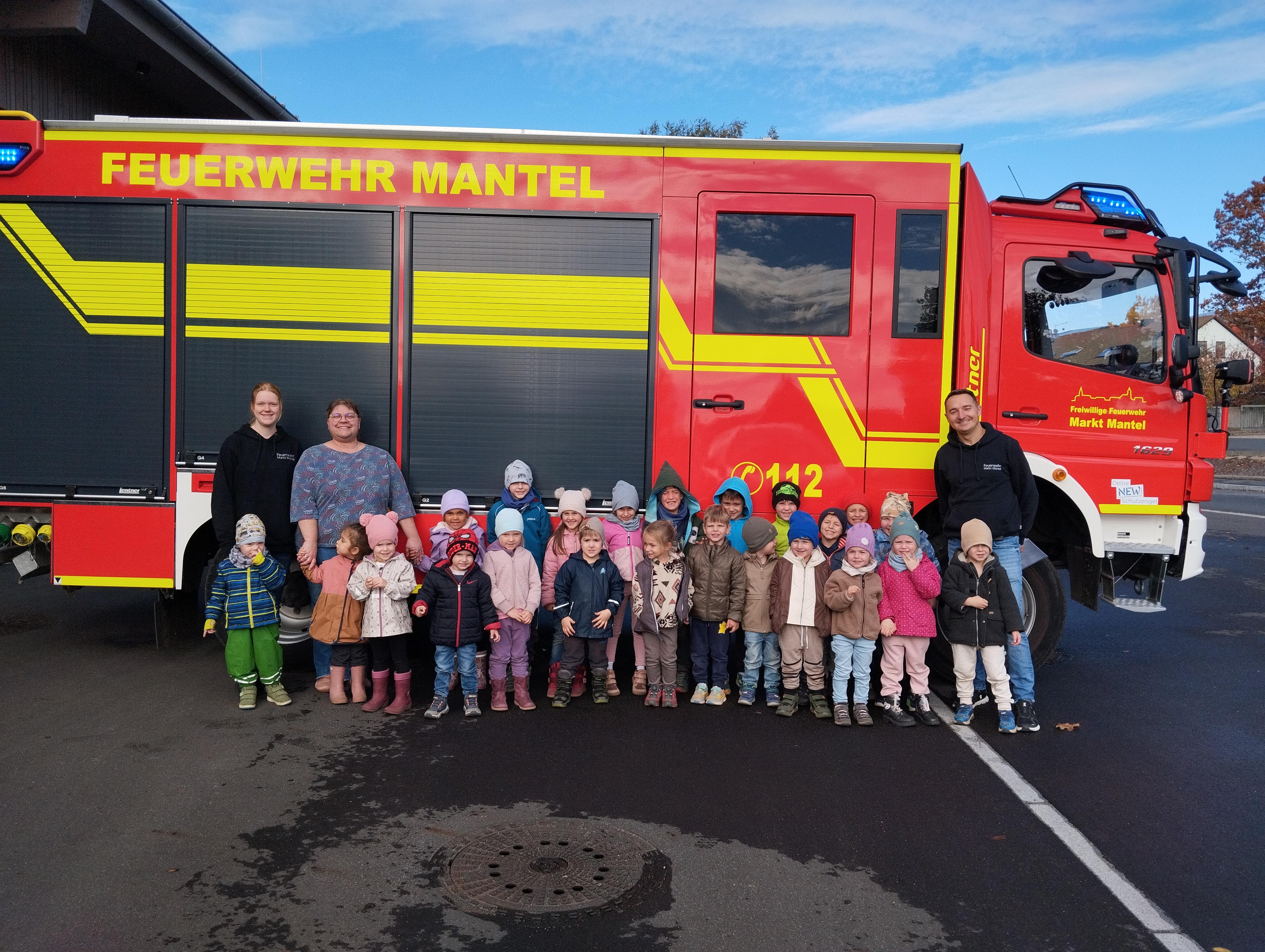 Am Dienstag, 21.10.2025 besuchte die Blaue Gruppe des Kinderhauses St. Elisabeth in Mantel das Feuerwehrhaus der Feuerwehr Markt Mantel. Insgesamt 23 Kinder im Alter von 3 bis 5 Jahren machten sich gemeinsam mit ihren zwei Erzieherinnen auf den Weg, um einen spannenden Vormittag bei der Feuerwehr zu erleben.