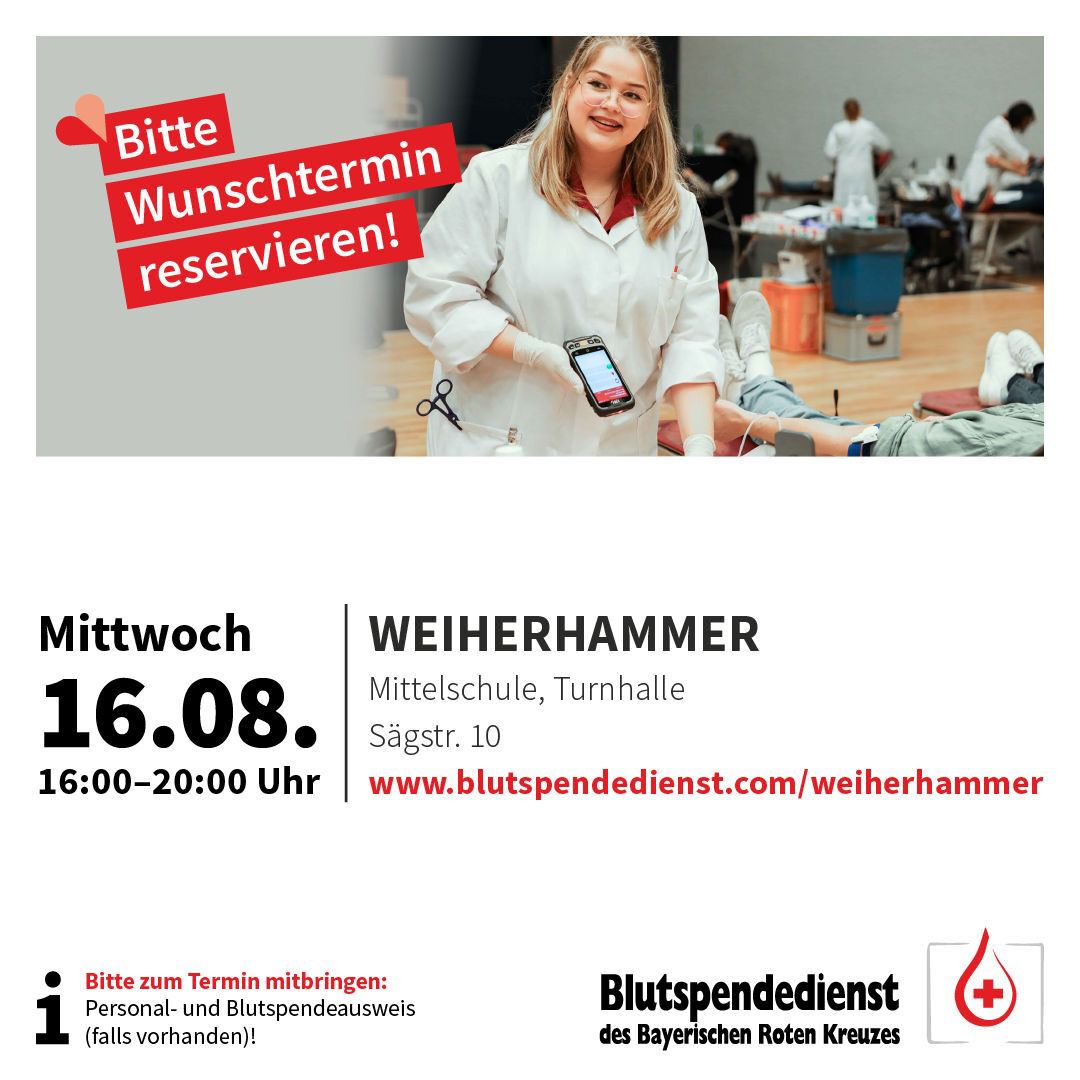 Blutspende am Mittwoch, den 16.8.23 in Weiherhammer