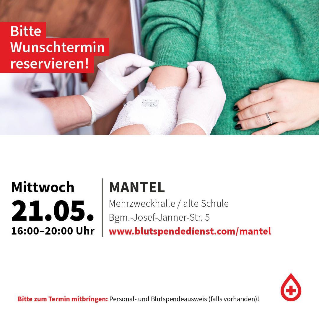 Betreut werden Sie an diesem Nachmittag von der „Helfer-vor-Ort - Gruppe Haidenaabtal“; es gibt Bratwurstsemmel. Die Organisatoren und Verantwortlichen des Termins in Mantel freuen sich über jede Mitbürgerin und jeden Mitbürger, die am 21. Mai kommen – besonders aber über junge Erstspender*innen, die sich das zutrauen und hoffentlich dann auch in Zukunft dabeibleiben.