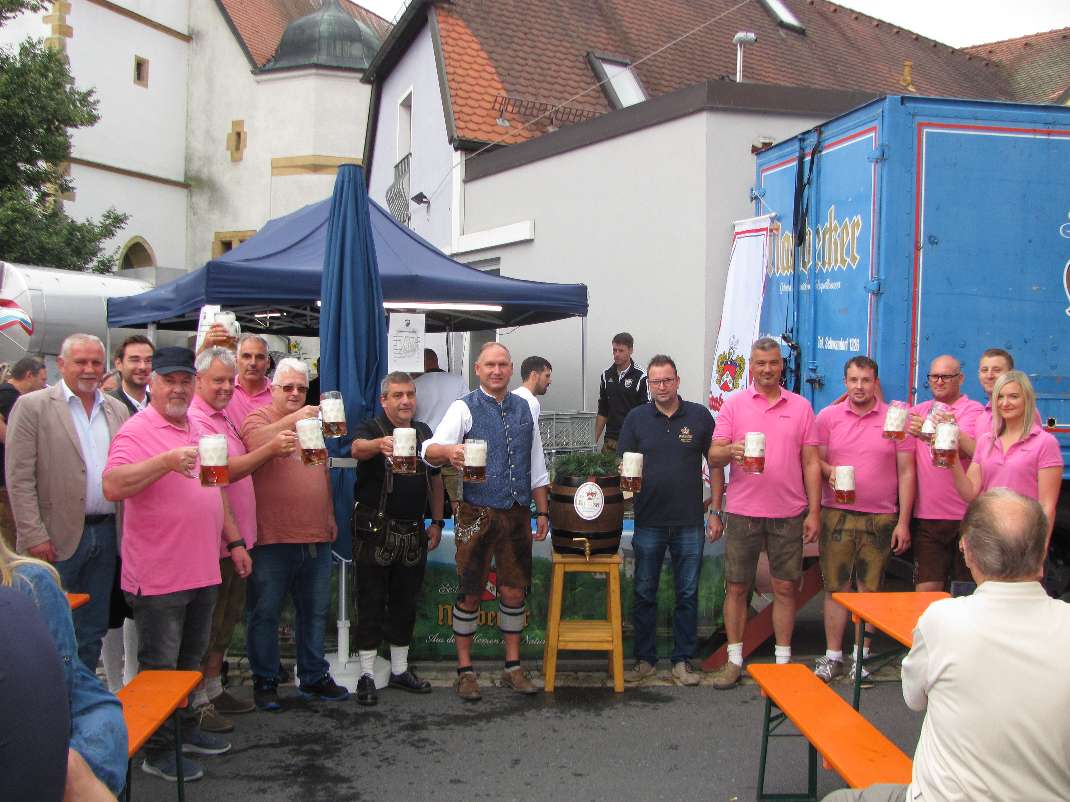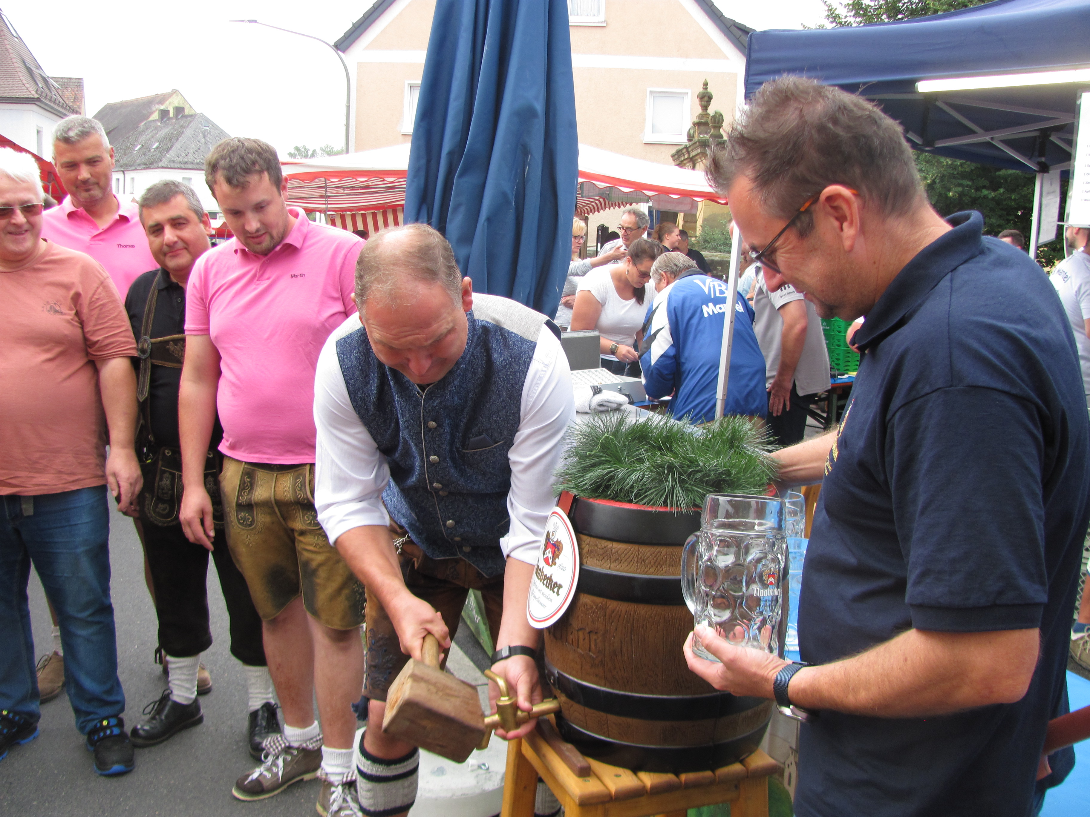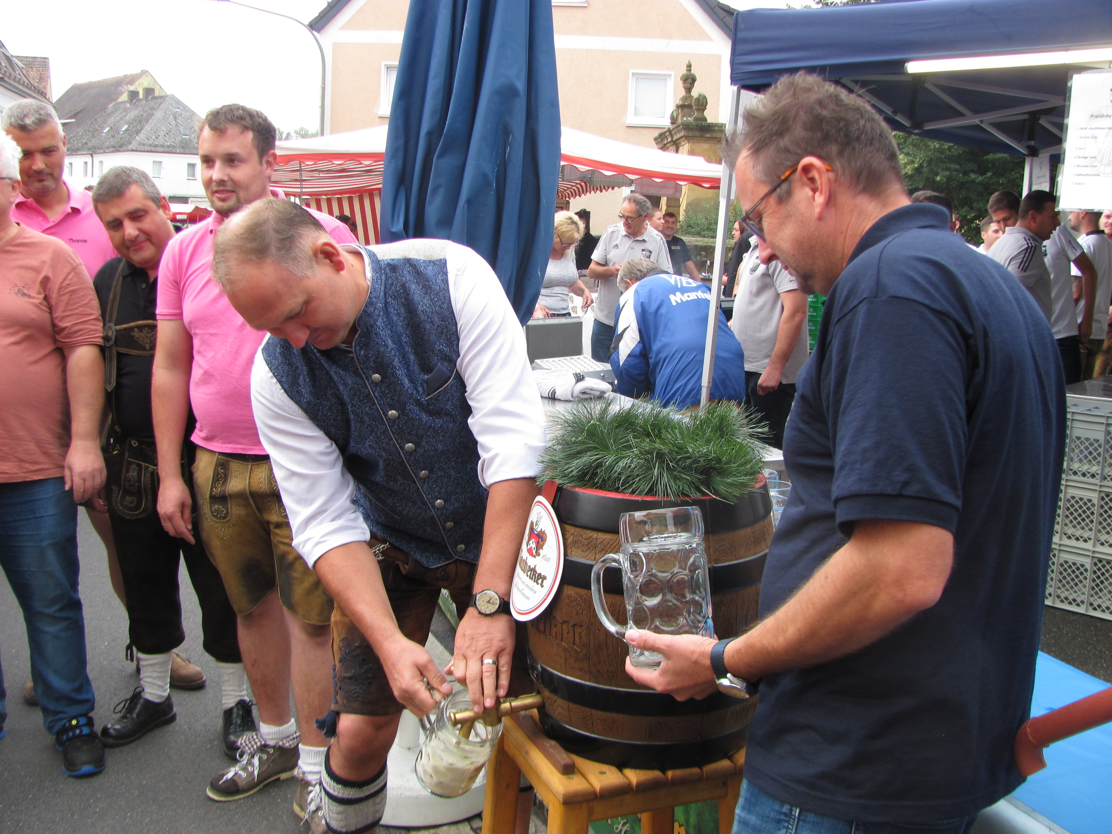 Am Sonntag um 8 Uhr beim Aufbau der Biergarnituren am Marktplatz war es noch grau und kühl. Aber pünktlich um 10 Uhr als Bürgermeister und Kartellvorsitzender Richard Kammerer mit dem Glockenschlag der Evangelischen Kirche die erste Maß Naabecker Festbier mit drei Schlägen anzapfte, lichteten sich die Wolken und die Sonne kam durch und bereits zur Mittagszeit gab es einen fast wolkenfreien Himmel. Das perfekte Anzapfen „überwachte“ Braumeister Eric Kulzer von der Brauerei Naabeck, er freute sich dass kein Tropfen des köstlichen Nasses verschwendet wurde. Eigentlich hätte der Zapfhahn schon mit dem ersten Schlag gesessen, aber Kammerer setzte vorsichtshalber nochmal nach. Die Kartellvorstandschaft stieß dann mit MdL Dr. Stephan Oetzinger und Ludwig Biller, Bürgermeister aus Weiherhammer auf ein friedliches Bürgerfest an. Alle Hände voll zu tun hatten gleich die Siedlerfrauen mit der Ausgabe der Weißwürste zum Frühschoppen. Die Hohlweglauerer erfreuten mit „Boarischen“, „Resi i hol di mit meim Traktor ab“, das Lied passte zur Oldtimer-Bulldog-Ausstellung des Zapfwellenstammtisches „Alts Glump“ am Schulanger. Fesche Mädchen und Frauen im Dirndl und Männer in Lederhosen mit strammen Wadeln sorgten für ein buntes heimatliches Bild. Die flotten Bedienungen hatten schon beim Frühschoppen viel zu tun und am späten Nachmittag mussten sie tüchtig Fersengeld geben. Sie waren immer freundlich und sorgten dafür dass niemand Durst leiden musste.