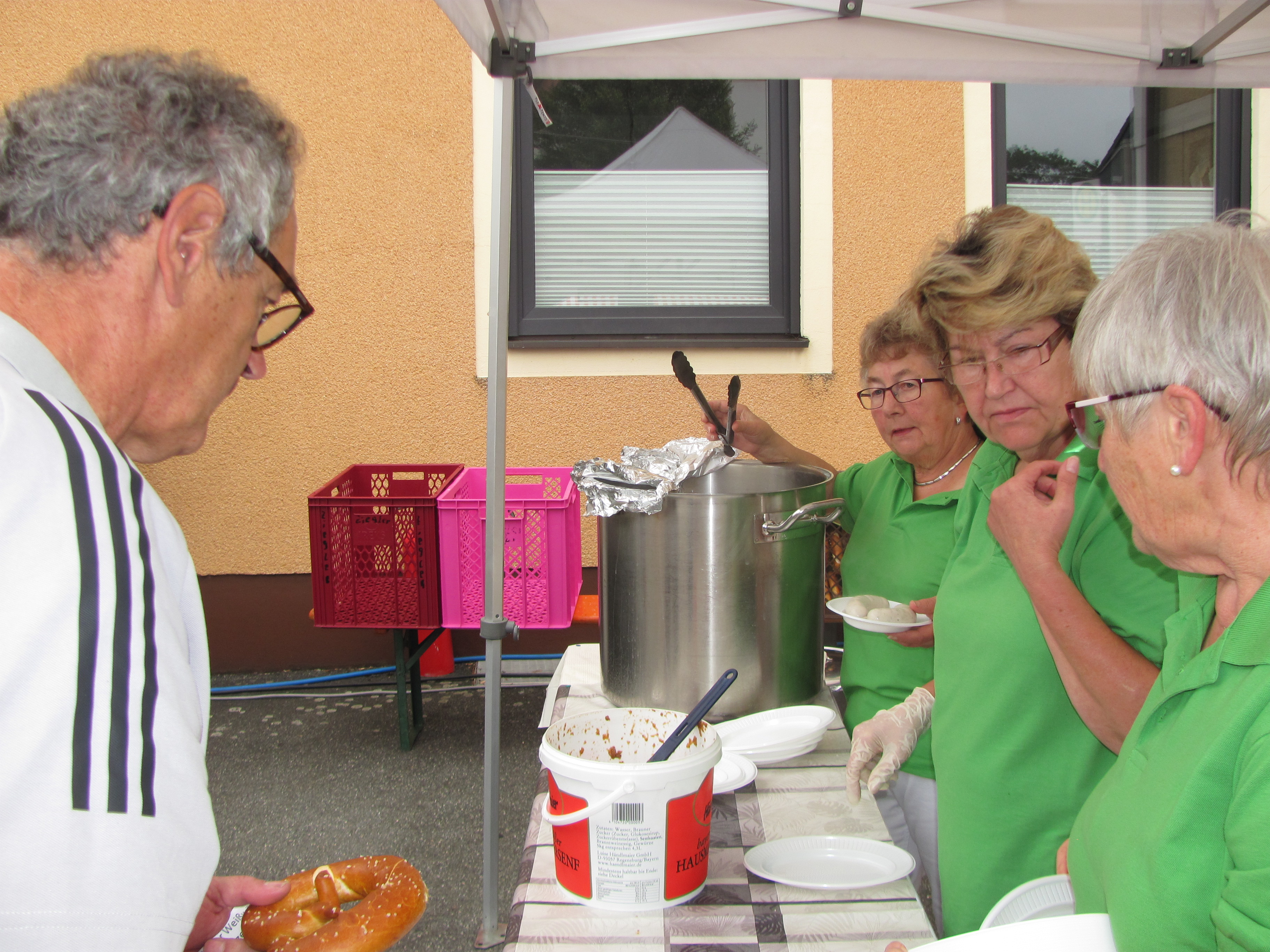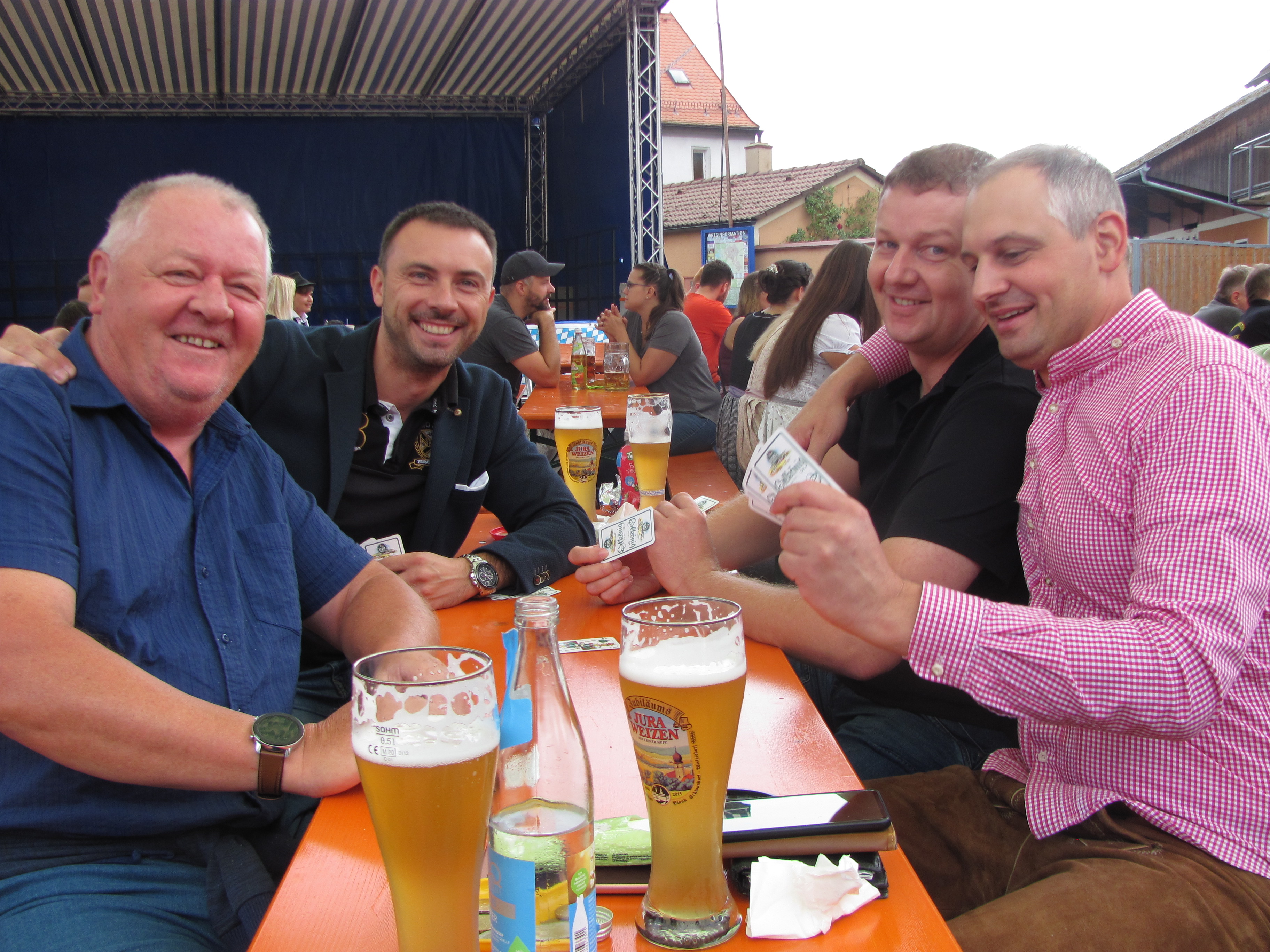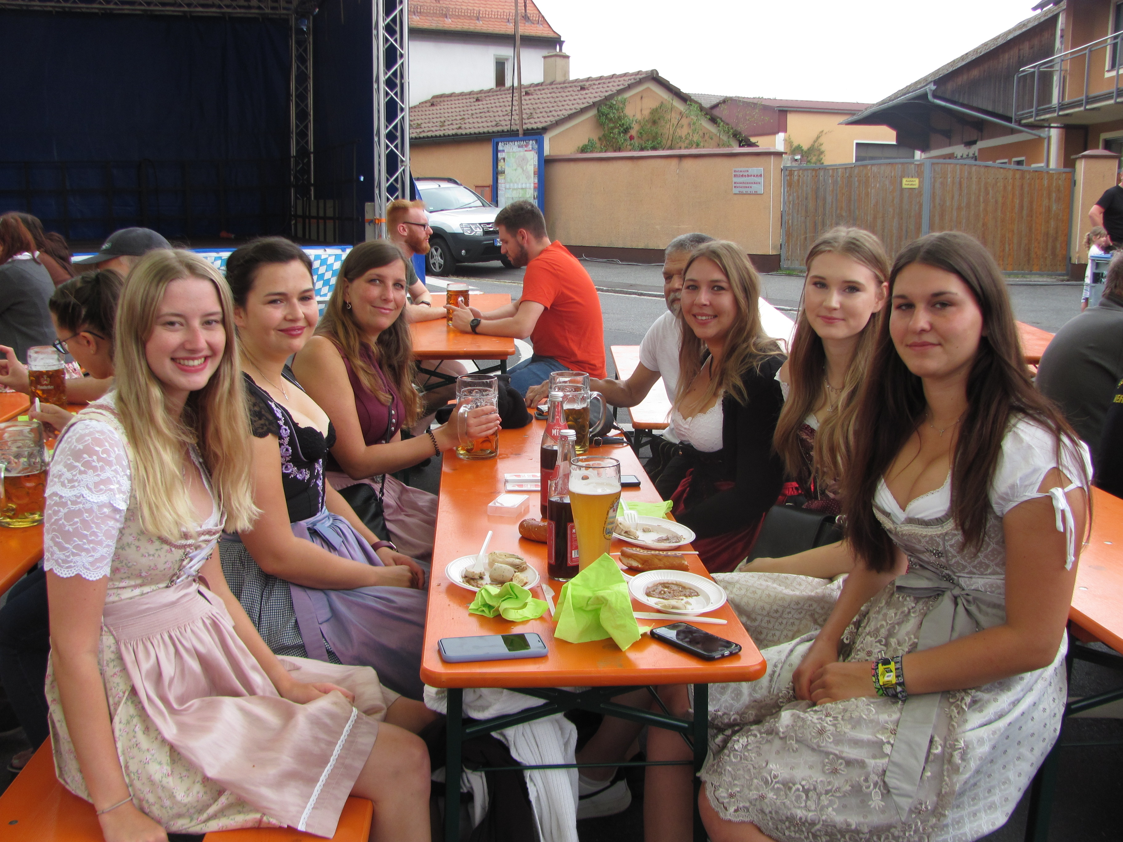 Am Sonntag um 8 Uhr beim Aufbau der Biergarnituren am Marktplatz war es noch grau und kühl. Aber pünktlich um 10 Uhr als Bürgermeister und Kartellvorsitzender Richard Kammerer mit dem Glockenschlag der Evangelischen Kirche die erste Maß Naabecker Festbier mit drei Schlägen anzapfte, lichteten sich die Wolken und die Sonne kam durch und bereits zur Mittagszeit gab es einen fast wolkenfreien Himmel. Das perfekte Anzapfen „überwachte“ Braumeister Eric Kulzer von der Brauerei Naabeck, er freute sich dass kein Tropfen des köstlichen Nasses verschwendet wurde. Eigentlich hätte der Zapfhahn schon mit dem ersten Schlag gesessen, aber Kammerer setzte vorsichtshalber nochmal nach. Die Kartellvorstandschaft stieß dann mit MdL Dr. Stephan Oetzinger und Ludwig Biller, Bürgermeister aus Weiherhammer auf ein friedliches Bürgerfest an. Alle Hände voll zu tun hatten gleich die Siedlerfrauen mit der Ausgabe der Weißwürste zum Frühschoppen. Die Hohlweglauerer erfreuten mit „Boarischen“, „Resi i hol di mit meim Traktor ab“, das Lied passte zur Oldtimer-Bulldog-Ausstellung des Zapfwellenstammtisches „Alts Glump“ am Schulanger. Fesche Mädchen und Frauen im Dirndl und Männer in Lederhosen mit strammen Wadeln sorgten für ein buntes heimatliches Bild. Die flotten Bedienungen hatten schon beim Frühschoppen viel zu tun und am späten Nachmittag mussten sie tüchtig Fersengeld geben. Sie waren immer freundlich und sorgten dafür dass niemand Durst leiden musste.