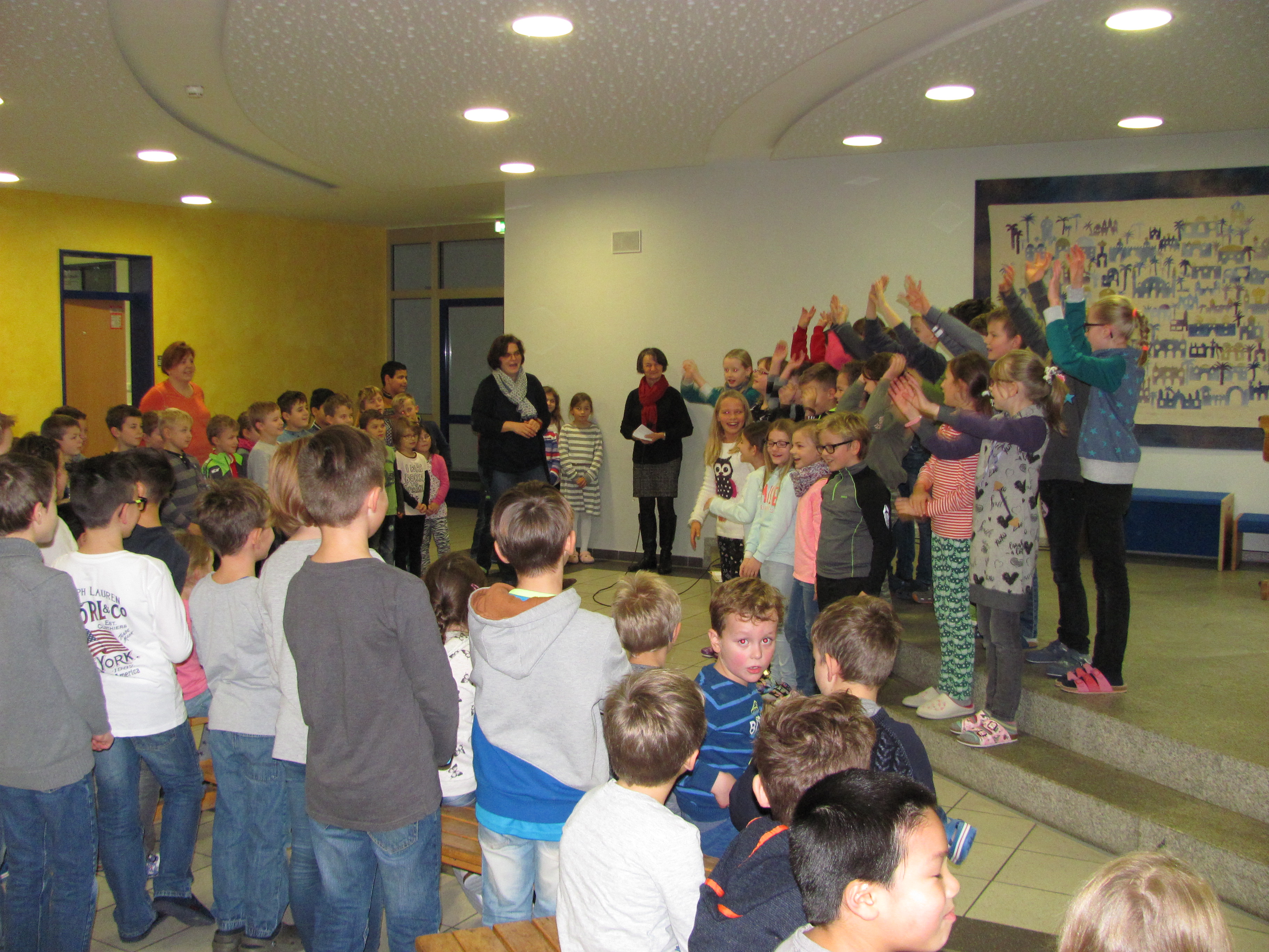 Einen besonderen Schultag erlebten die Klassen 1 – 4 am Freitag, 17.11. Sie trafen sich in der Pause und die vierte Klasse sang das mit Lehrerin Anja Kraus einstudierte Lied: „Hallo, herzlich willkommen“. Wie Rita Brey erklärte, begrüßten sie damit besonders die diesjährigen Lesepaten die sich Zeit genommen haben um in die Schule zu kommen und den Kindern vorzulesen. Die Kinder wussten: „Wenn wir was vorgelesen bekommen, sind wir still, bleiben sitzen und sind neugierig auf spannende Bücher“. Rita Brey ermunterte die Schüler sich in der Marktbibliothek Bücher auszuleihen, denn die Kids wussten auch: „Lesen macht schlau, Lesen verhindert Dummheit“. Die erste Klasse hörte dann von zweiter Bürgermeisterin Rita Steiner: „Die Olchis feiern Weihnachten“. Rektor a. D. Gotthard Betz hatte von Ottfried Preußler „das kleine Gespenst“ dabei. Klasse drei begrüßte Eva Kroha-Lemberger, die früher Lehrerin an der Manteler Schule war und die vierte Klasse freute sich auf „Till Eulenspiegel“ vorgelesen von Bürgermeister Dr. Stephan Oetzinger. Johann Graßler, Ehemann von Rektorin Elisabeth Graßler hatte für die „Schlaufüchse“ des Kinderhauses auch eine spannende Geschichte dabei. Seit 2004 gibt es schon den bundesweiten Vorlesetag und die Schüler rechneten aus, dass dies nun schon 13 Jahre sind, wo die Aktion stattfindet.