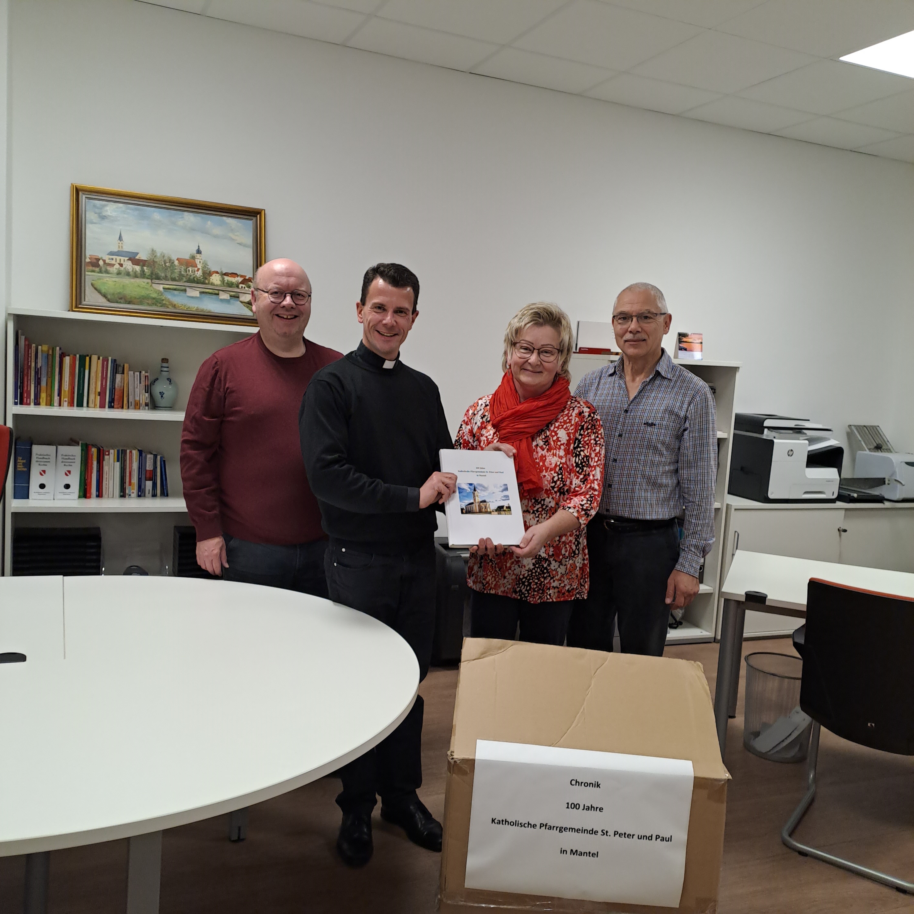Pfarrer Thomas Kohlhepp hält das erste Buch frisch aus dem Druckverlag in den Händen. „Es beinhaltet 100 Jahre Pfarreierhebung der katholischen Pfarrgemeinde in Bild und Text“, so Priska Hofmann. Ursprünglich wurde als Idee eine Festschrift angedacht, doch es entwickelte sich zur Chronik über 100 Jahre. „Während der Beschäftigung mit Chronik und Jubiläum 100 Jahre Pfarreierhebung wurde mir erst richtig bewusst, wie viele Menschen sich in den 100 Jahren durch Mühe und Arbeitseinsatz eingebracht haben, immer im Glauben“, so Frau Hofmann weiter. In diesem Buch finden sich sowohl historische Abschnitte über die Pfarrkirche, St. Moritz oder dem Benefizium Steinfels-Hütten, die Geistlichen, die Haupt- und Ehrenamtlichen Mitarbeiter/ innen, den Gremien, den kirchlichen Vereinen und Gruppierungen, die Entwicklung der Ministranten, dem Kinderhaus oder auch Feste und Brauchtum über die 100 Jahre hinweg. Pfarrer Thomas Kohlhepp, Pfarrgemeinderatssprecher Josef Grasser und Kirchenpfleger Karl Hofmann konnten als erste in den 250 Seiten schmökern.