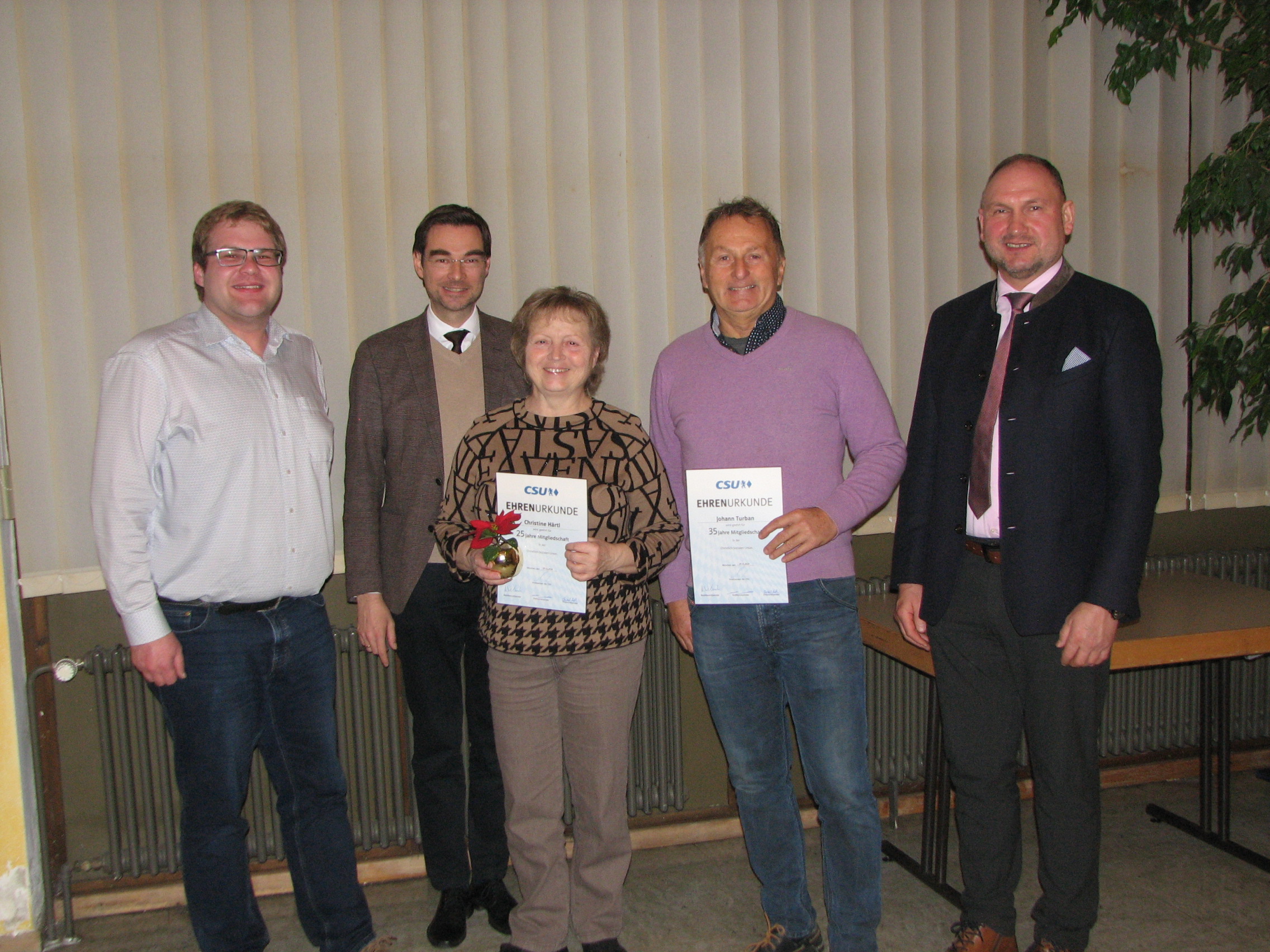 Vorsitzender Christoph Müller (links) und Bürgermeister Richard Kammerer (rechts) übernahmen gemeinsam mit Landtagsabgeordnetem Dr. Stephan Oetzinger (2. von links) die Ehrungen. Christine Härtl und Johann Turban (3. und 4. von links) wurden als ehemalige Markträte für mehrjährige Mitgliedschaft im CSU Ortsverband mit Urkunden ausgezeichnet.