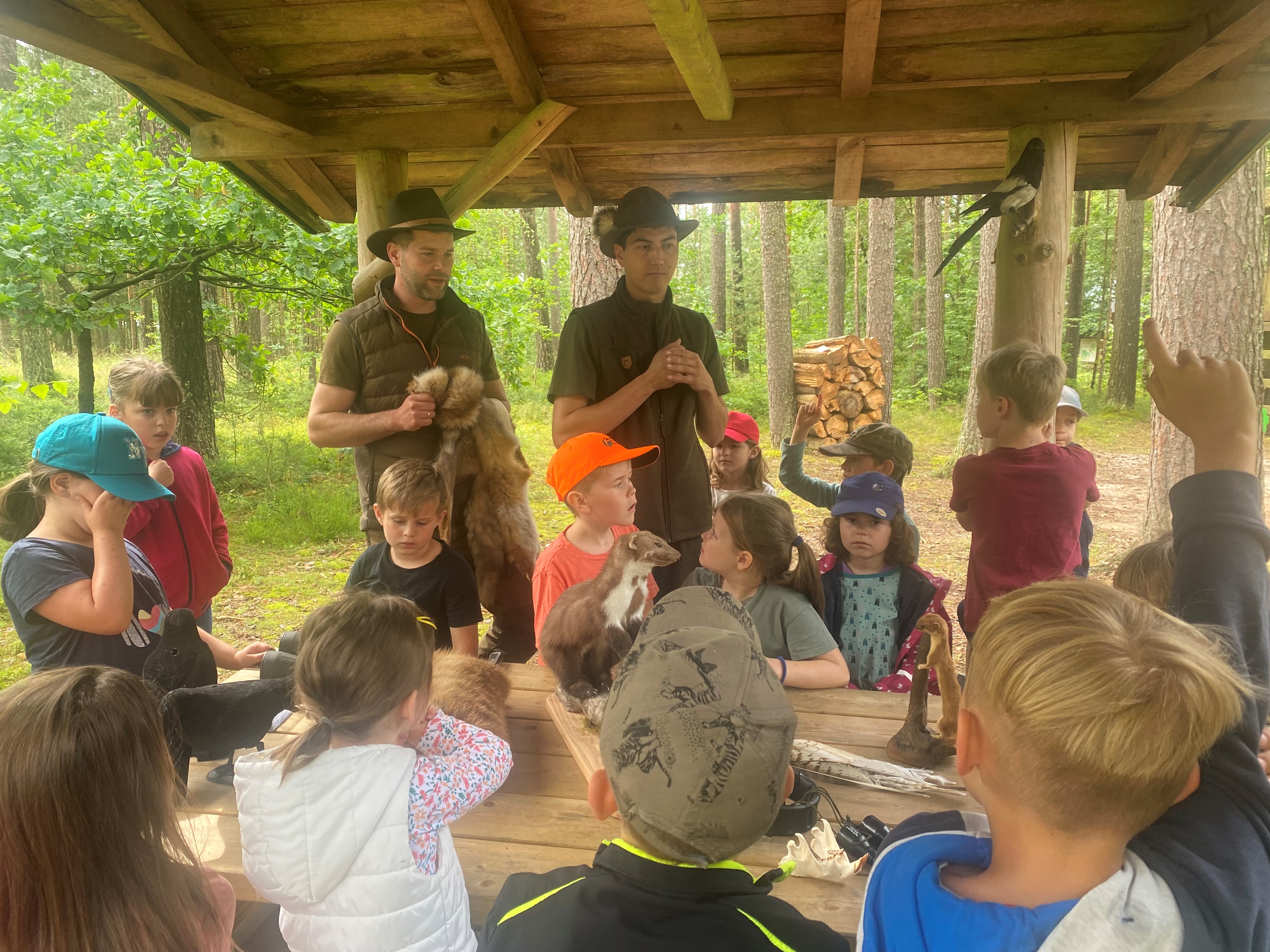 Unter diesem Motto verbrachten die Kinder der ersten Klasse ein paar lehrreiche Stunden mit den Jägern Michael Singer und Sebastian Freller auf dem Waldspielplatz in Rupprechtsreuth. Die Männer erklärten den Kindern, dass man mit dem Wald achtsam umgehen muss, da er eine Nutz-, eine Schutz- und eine Erholungsfunktion für Mensch und Tier bietet. Sie hatten allerlei interessante Dinge dabei: ein Stück Rinde, in dem sich die Spur des Borkenkäfers zeigte, Geweihe von Hirschen und Rehen, die die Kinder auch anfassen durften und einige ausgestopfte Waldtiere, die ganz genau betrachtet werden konnten. Herr Freller und Herr Singer brachten den Kindern auch die verschiedenen Baumarten näher. Sie gingen auf die heimische Eibe ein und betonten, dass der Verzehr der Zweige für Mensch und Tier tödlich sein kann. Die Brotzeit wurde durch das Spielen einer Melodie auf dem Jagdhorn eingeleitet. Abgerundet wurde dieser gelungene Vormittag von den Apportierübungen des ausgebildeten Jagdhundes, der den Jägern auf der Jagd in vielerlei Hinsicht unterstützt. So holt er zum Beispiel Enten aus dem Wasser oder sucht nach angefahrenen Wildtieren. Die Grundschule Mantel bedankt sich für diese gelungene Aktion bei Herrn Freller und Herrn Singer und hofft auf eine baldige Wiederholung dieses lehrreichen Tages. In diesem Sinne allzeit „Weidmannsheil“!