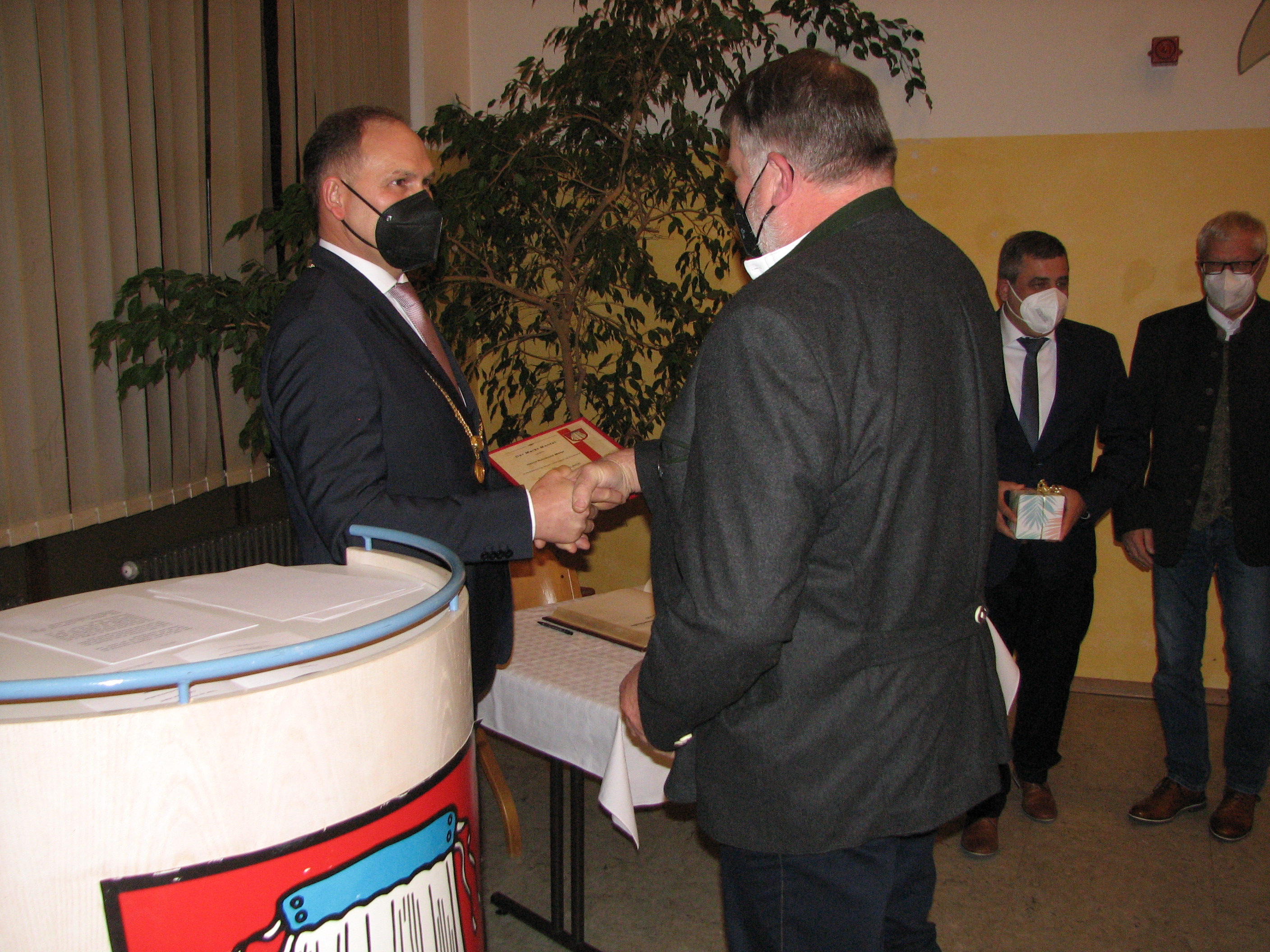 Gemeinsam mit seinen Vertretern Siegfried Janner (2. v. r.) und Johann Gurdan (rechts) überreichte Bürgermeister Richard Kammerer (links) die Ehrenamtsurkunden an sechs verdiente Mitglieder der Marktgemeinde und würdigte die Geehrten als Vorbilder für die Jugend und der Mantler Mitbürger.