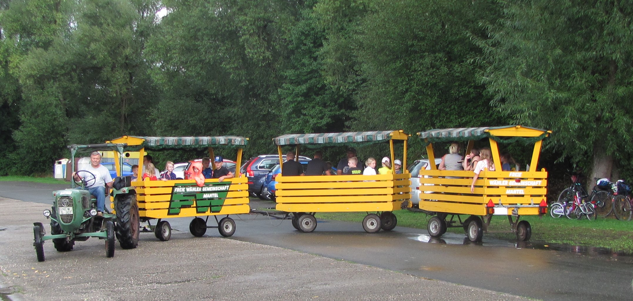 Großen Spaß hatten 48 Ferienkinder in Begleitung von Eltern oder Großeltern beim Ferienprogramm der Freien Wähler auf dem VfB-Gelände. Mit dem Manteler Bockl konnten die Kinder ihre Runden durch die Landschaft drehen. Als zwei kräftige Regenschauer niedergingen, verlagerten die Helfer der FWG dann Tische und Bänke unter das Dach im Fußball-Stadion. Die Eltern und Kinder wurden dann im trockenen bewirtet. Es gab verschiedene Kuchen, Muffins, Kekse, Wurstsemmeln, Brezen und für die Kinder Limonaden und Apfelshorle für die Eltern auch Kaffee. Mit großer Spannung wurde dann das Entenrennen erwartet. FWG-Vorsitzender Friedrich Janner schüttete dann 48 Rennenten unter großem Halo in die Haidenaab, dann ging es mit dem Zug zurück zur Ziellinie und nach einiger Zeit tauchten dann die Enten auf. In der Reihenfolge, in der die Enten ankamen, durften sich die Kinder dann am Geschenketisch ihre Preise aussuchen. Es gab Straßenmalkreiden, Puzzles, Bälle, Spiele, alles was das Kinderherz erfreut. Am schnellsten kam die Ente von Anne Lindner ins Ziel, gefolgt von Maria Maruhn, Platz drei belegte Max Mutzbauer. Der Preistisch war so reichlich bestückt, dass auch noch Paul Bogner, dessen Ente mit der Nr. 48 als letzte durchs Ziel schwamm noch schöne Turnierbälle aussuchen konnte. Es ist einfach Glückssache wie sich die Badeenten im Wasser verhalten. Sie werden ja gleichzeitig ins Wasser geworfen und kommen doch ganz unterschiedlich an. Friedrich Janner bedankte sich bei allen Helfern und Kuchenspendern, unter anderem bei Gabi Paulus, Anita Riedel mit Tochter, Hugo Diehl und Hans Reil, Christian Günther sowie Lokführer Herbert Steiner und dem VfB der das Gelände zur Verfügung gestellt hatte.