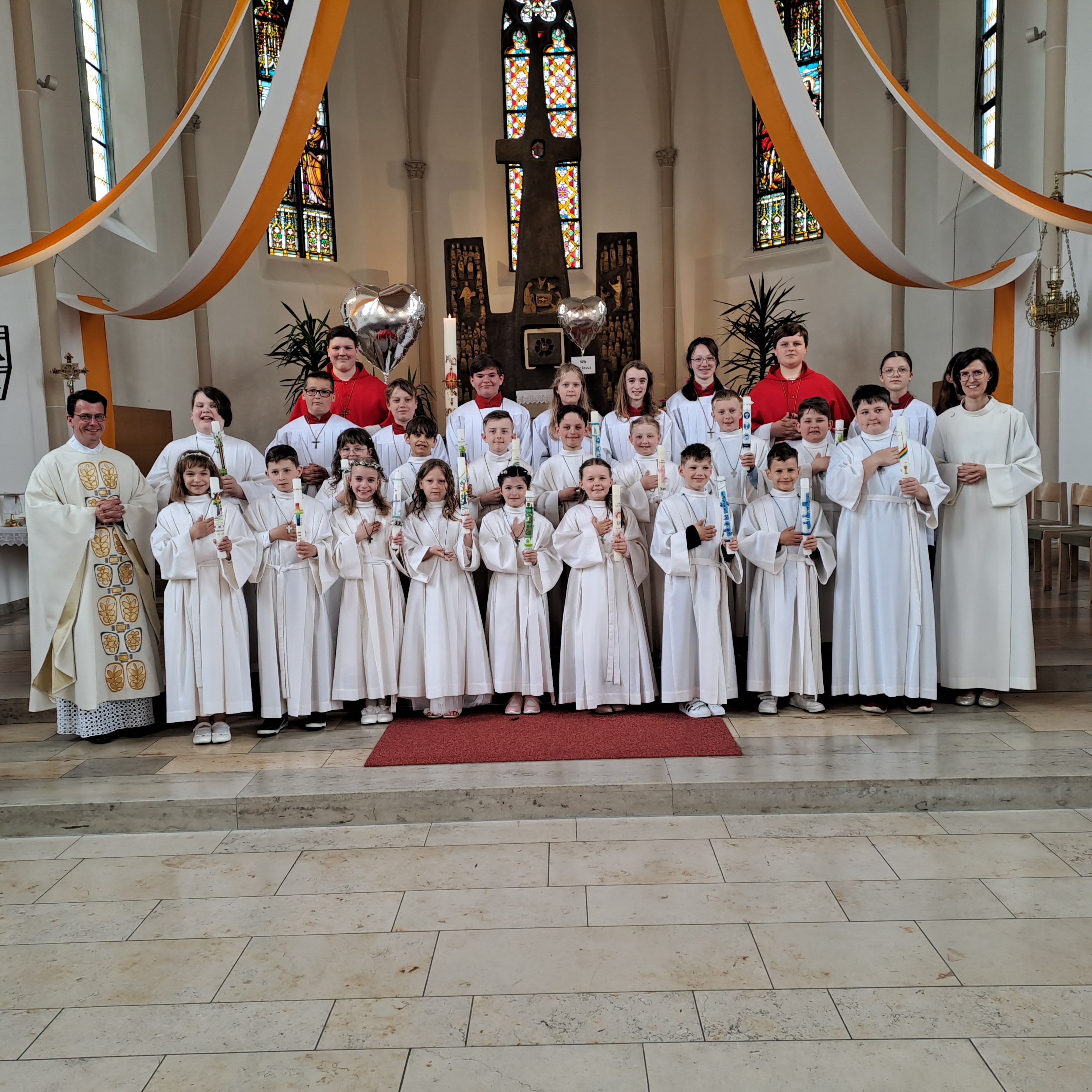 Am Sonntag 21. Mai feierten 17 Mädchen und Buben in der Pfarrei St. Peter und Paul in Mantel Erstkommunion. Gemeindereferentin Franziska Bösl und ihr ehrenamtliches Helferteam um Pfarrer Thomas Kohlhepp hatten die Erstkommunionkinder unter den Leitfaden „Weites Herz – Offene Augen“ auf diesen Tag vorbereitet. Nach dem festlichen Einzug begrüßten Pfarrer Kohlhepp und zwei Kommunionkinder die Anwesenden. Unter den Anwesenden waren Klassenlehrerin Daniela Kreuzer von der Grundschule Mantel und Franziska Schubert, Schulleiterin der Stöltznerschule. Der Pfarrer stellte fest: „Jetzt ist es soweit! Wir sind am Ziel diesen Weges. Viele Monate der Vorbereitung liegen hinter uns, jetzt dürft ihr zum ersten Mal Gäste am Tisch des Herrn sein.“ Unterschiedliche Kommunionkinder übernahmen Kyrierufe und Fürbitten sowie Gabenprozession. Das Evangelium als auch die Dialogpredigt beschäftigte sich mit dem Markusevangelium mit der Begegnung des blinden Bettlers Bartimäus, der ein weites Herz und offene Augen für Jesus hatte. So erklärte Franziska Bösl und Anja Fröhlich den Erstkommunionkindern und Gottesdienstbesuchern die Hintergründe. Bartimäus habe Jesus als den Sohn Gottes erkannt, weil er es mit dem Herzen gesehen hatte. Schilder an helliumgefüllte Ballonherzen mit den Aufschriften „Wir für Jesus, Jesus für uns und wir für Andere wurden im der Kirche an unterschiedlichen Punkten platziert. Der Festgottesdienst wurde musikalisch von den Kolping Singers unter Leitung von Gisela Reil und Simon Hoffmann an der Orgel umrahmt. Pfarrer Thomas Kohlhepp bedankte sich am Ende des Gottesdienstes bei allen Helfern für das Gelingen des Vormittags; vor allem bei Gemeindereferentin Franziska Bösl. „Sie hat die Vorbereitung mit viel Liebe und Hingabe gemeistert. Ebenso den Mitstreiterinnen Verena Tafelmeier (Mantel) und Beate Suttner, Anja Fröhlich, Lydia Hofmann (Neunkirchen)“, so der Geistliche. Eine Andacht am späten Nachmittag schloss sich an.