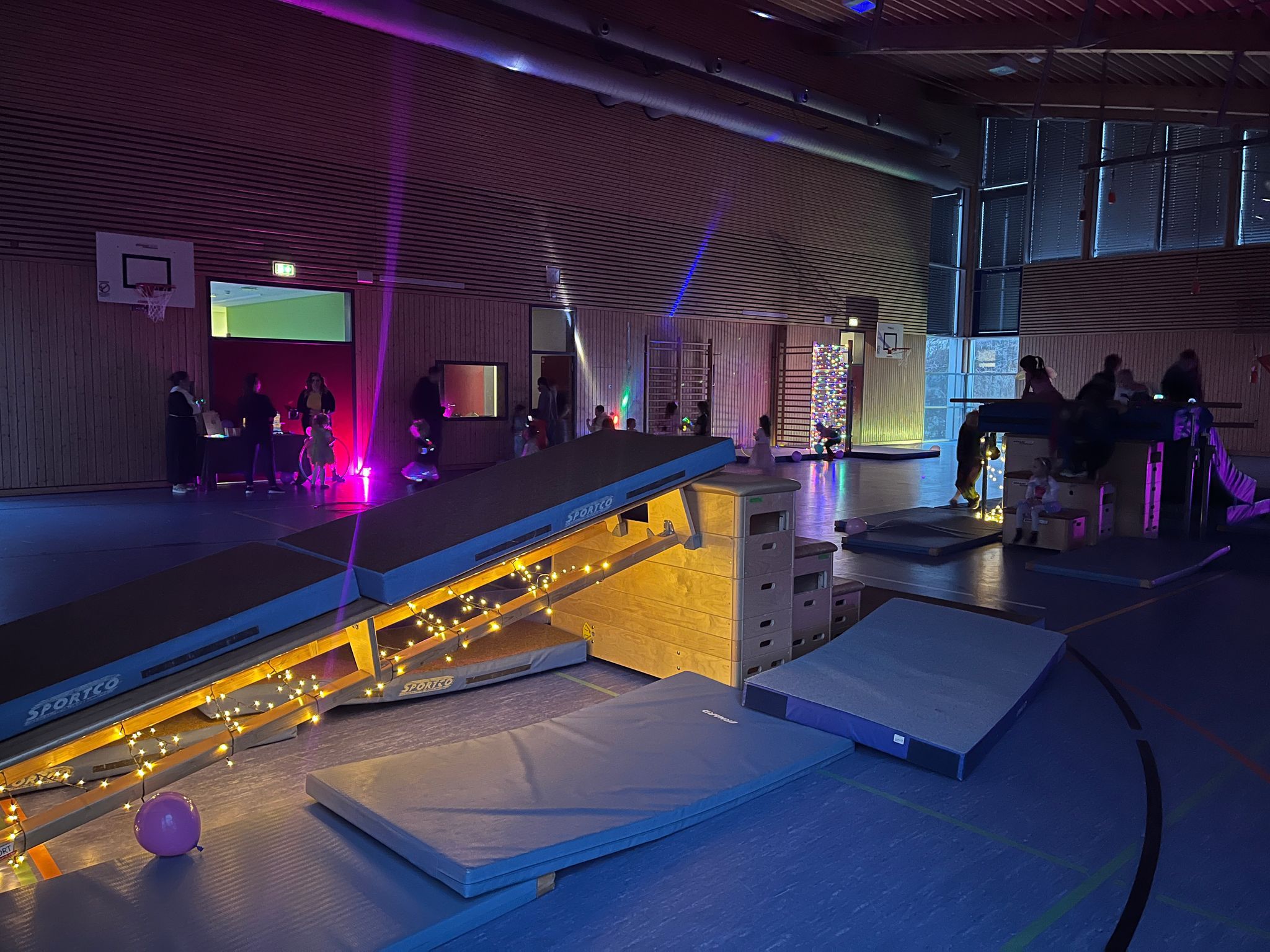 Die Trainer verwandelten die Turnhalle mit Lichterketten und einer Lichtmaschine in eine leuchtende Turnlandschaft, die die Kinderaugen zum Strahlen brachte.