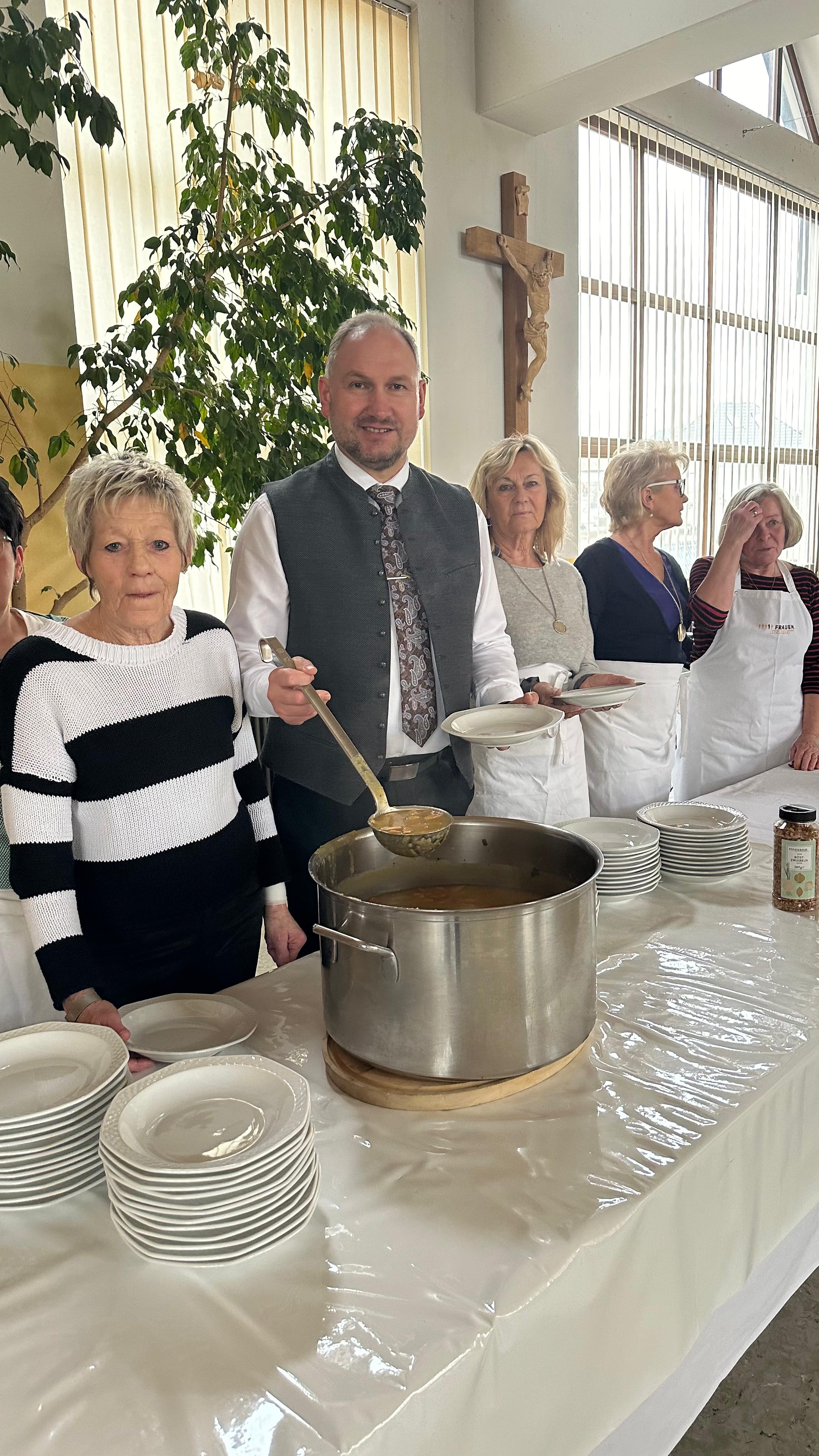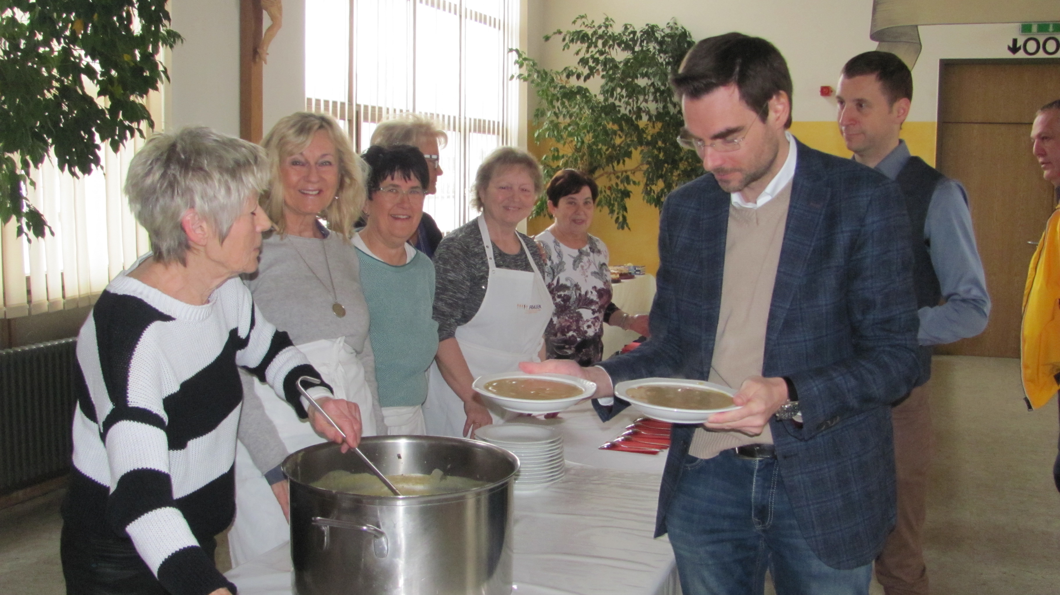 Am Palmsonntag hatte die Frauenunion in die Mehrzweckhalle zum Fastenessen eingeladen. Zuerst etwas zögerlich aber dann strömten die Besucher doch zahlreich in die heimelig warme Mehrzweckhalle. Sie war von den FU-Damen österlich geschmückt und dekoriert worden. Den Getränkeausschank erledigten die CSU-Mitglieder. Die FU-Damen hatten im Vorfeld jede Menge Kartoffeln und Gemüse schnippelt und daraus eine schmackhafte Kartoffelsuppe zubereitet. Die 200 Portionen fanden dann auch ihre Abnehmer, dazu ein gutes Bauernbrot. Viele holten sich einen kostenlosen Nachschlag. Die Kinder fischten sich als erstes die Wienerlstücke heraus. Das Team um Christine Härtl hatte auch Palmbuschen gebastelt und vor der Palmweihe verkauft. Auch die schön dekorierten Osterkerzen wurden gerne gekauft. Viele Gäste nahmen sich vom tollen Tortenbüffett noch Gebäck mit nach Hause zum Kaffee trinken. Die FU spendet den Erlös des Fastenessens immer einer Organisation in Mantel.