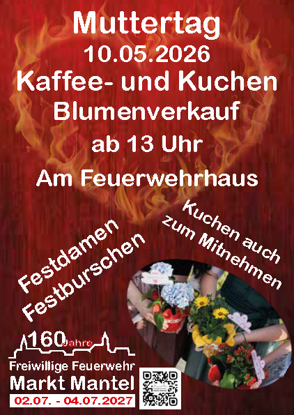 Die Festdamen und Festburschen der Feuerwehr Mantel laden dieses Jahr wieder am Muttertag zu Kaffee und Kuchen am Feuerwehrhaus ein.